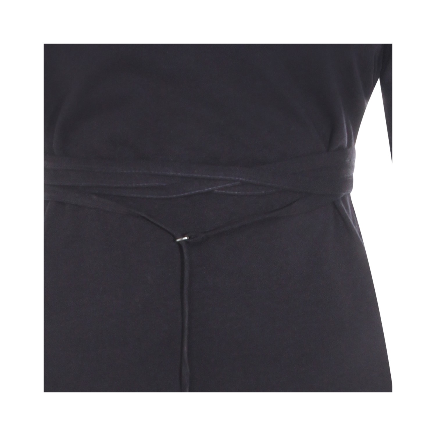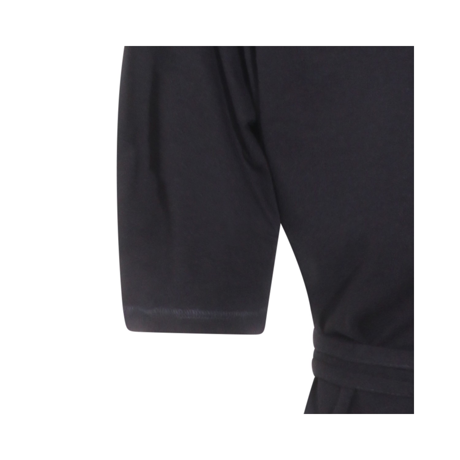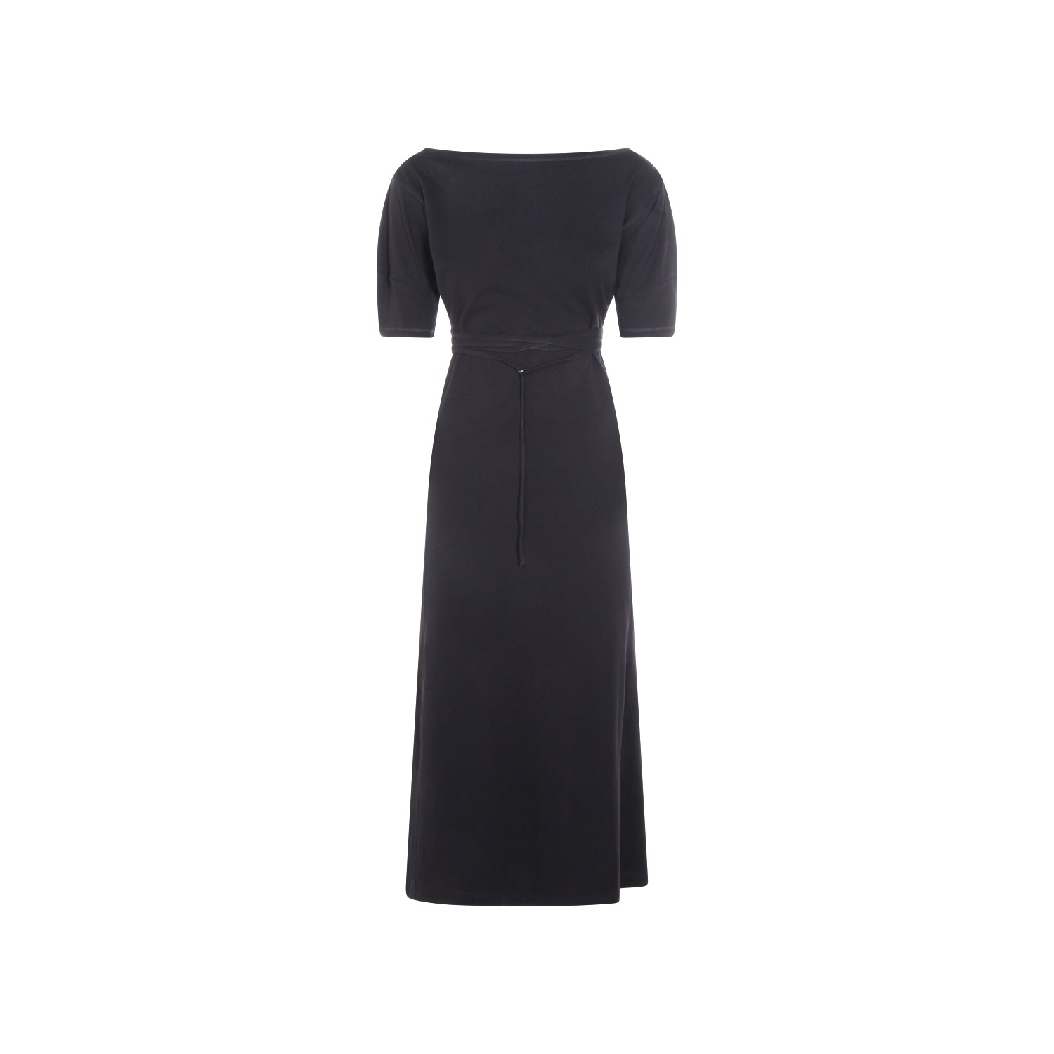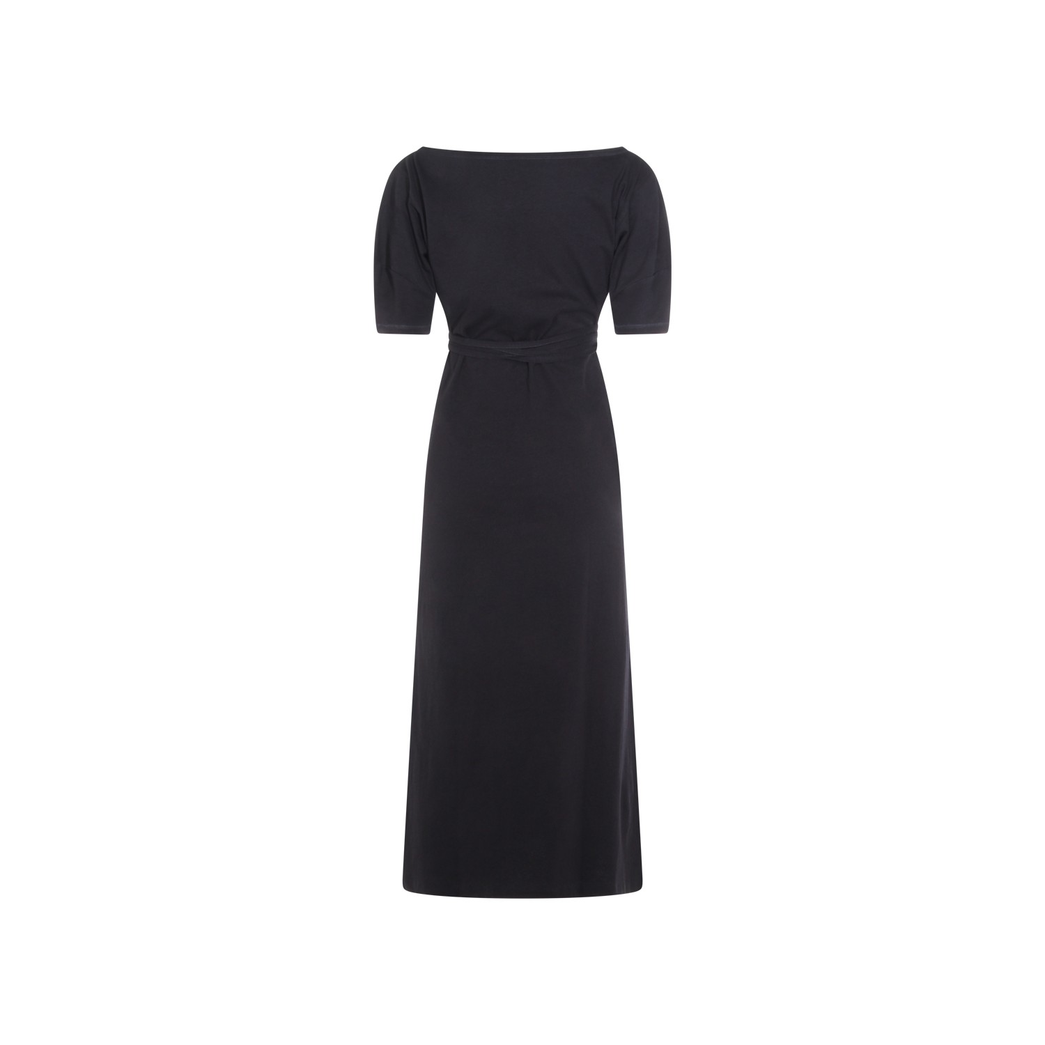Black cotton maxi dress from Lemaire featuring round boat collar, short sleeves, lateral split and belt waist.
