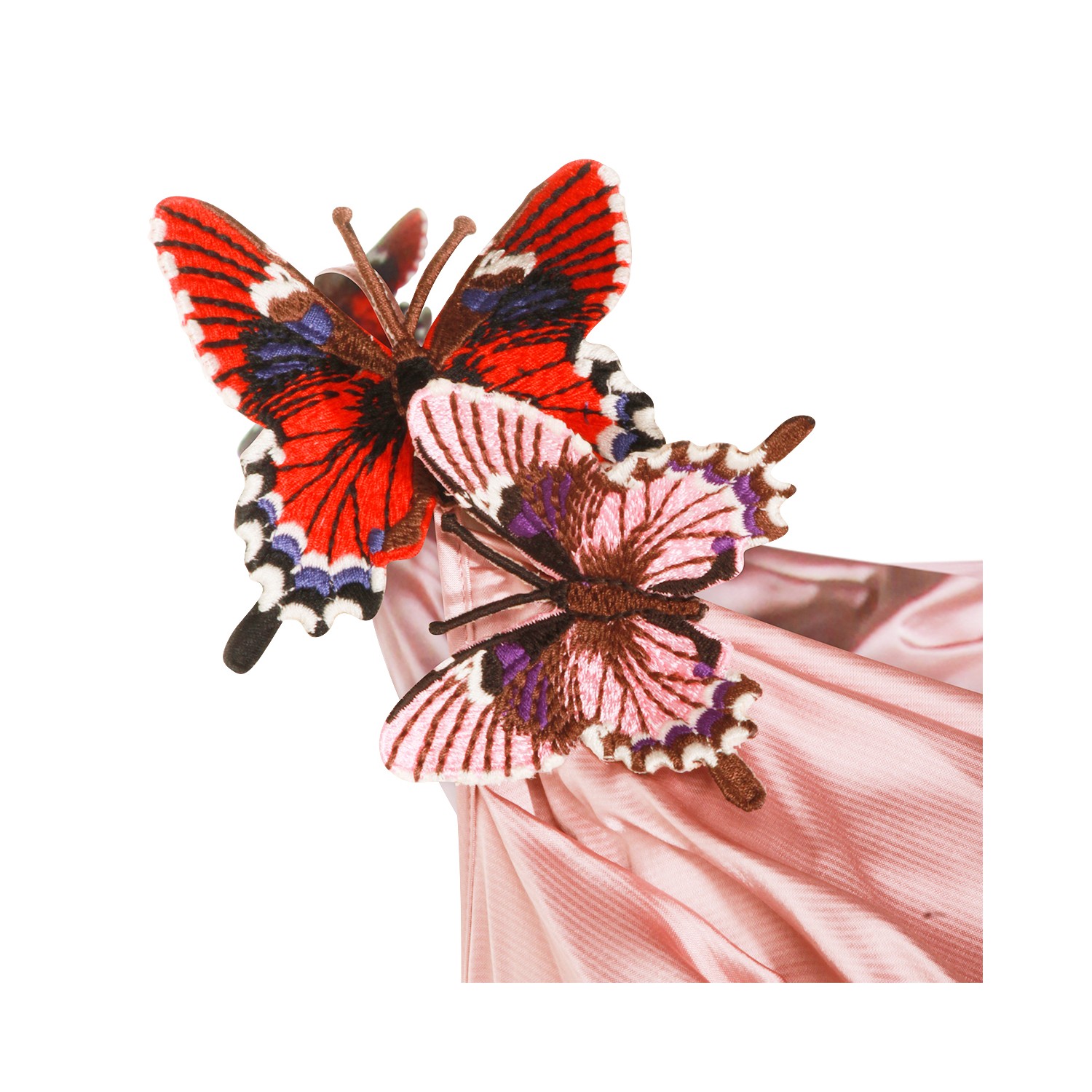 Pink viscose dress from Blumarine featuring deep round collar, sleeveless, thin straps, butterfly embroidered, side slit and long lenght.