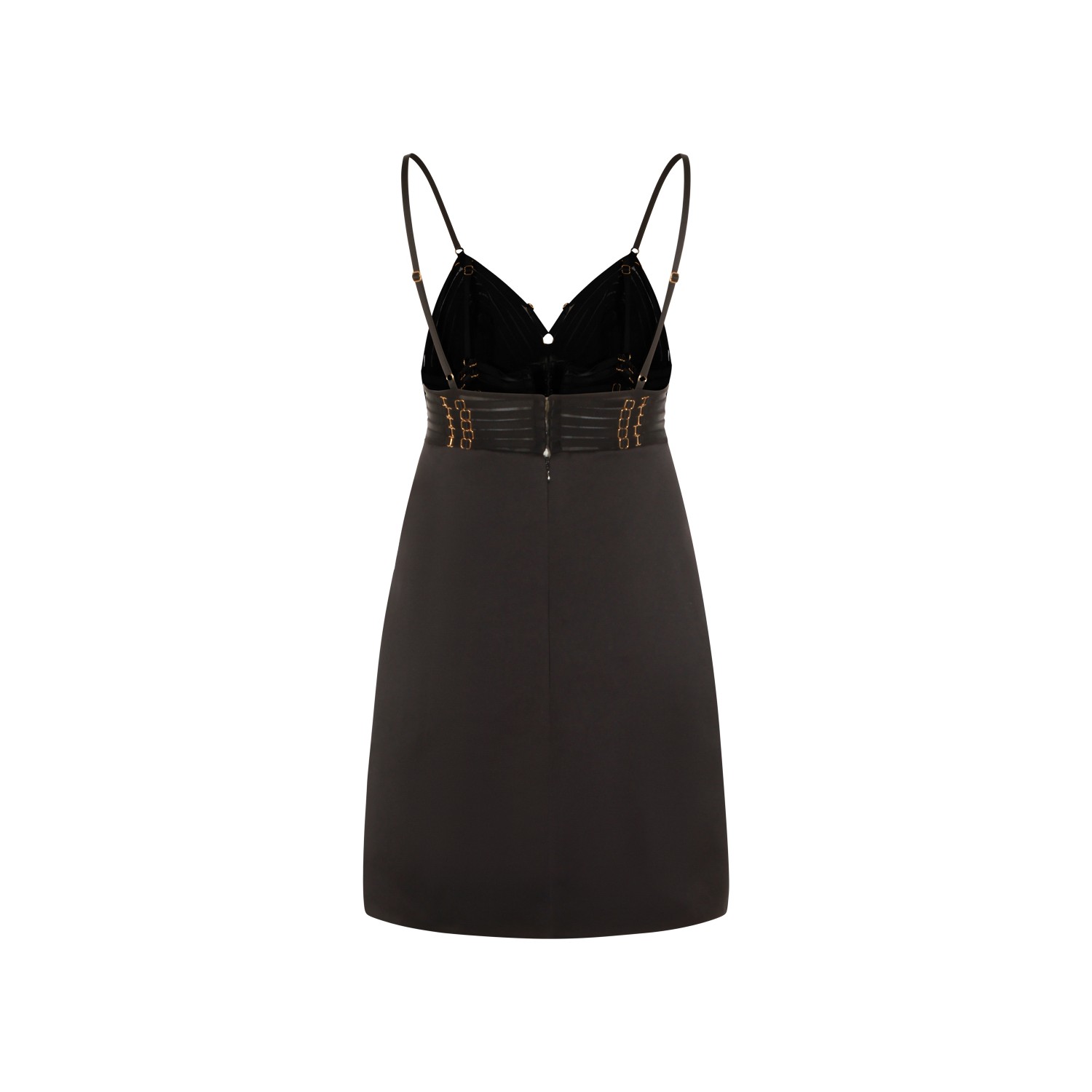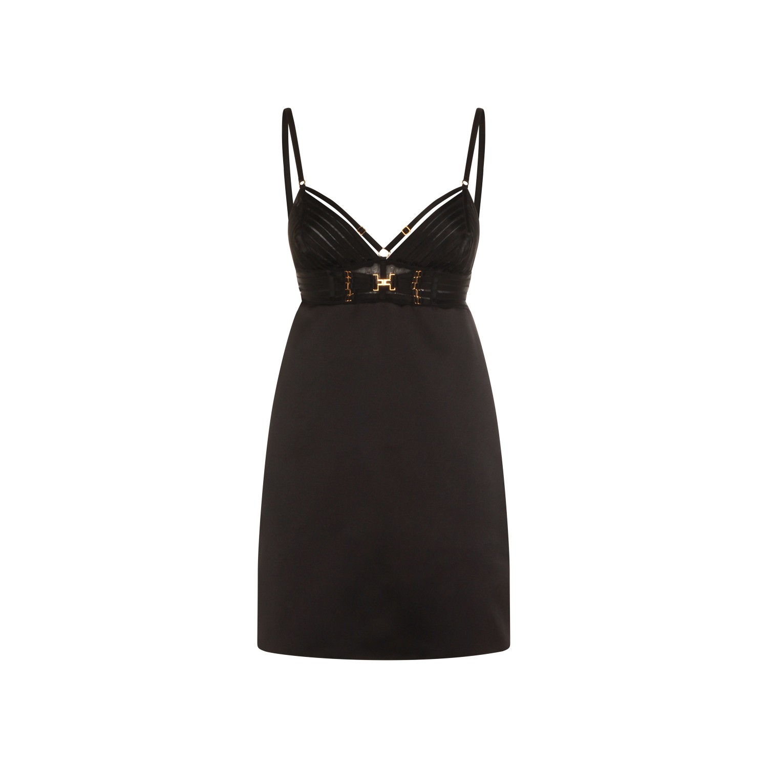 Black dress from Elisabetta Franchi featuring heart neckline, sleeveless, thin straps, gold tone buckle details and mini lenght.