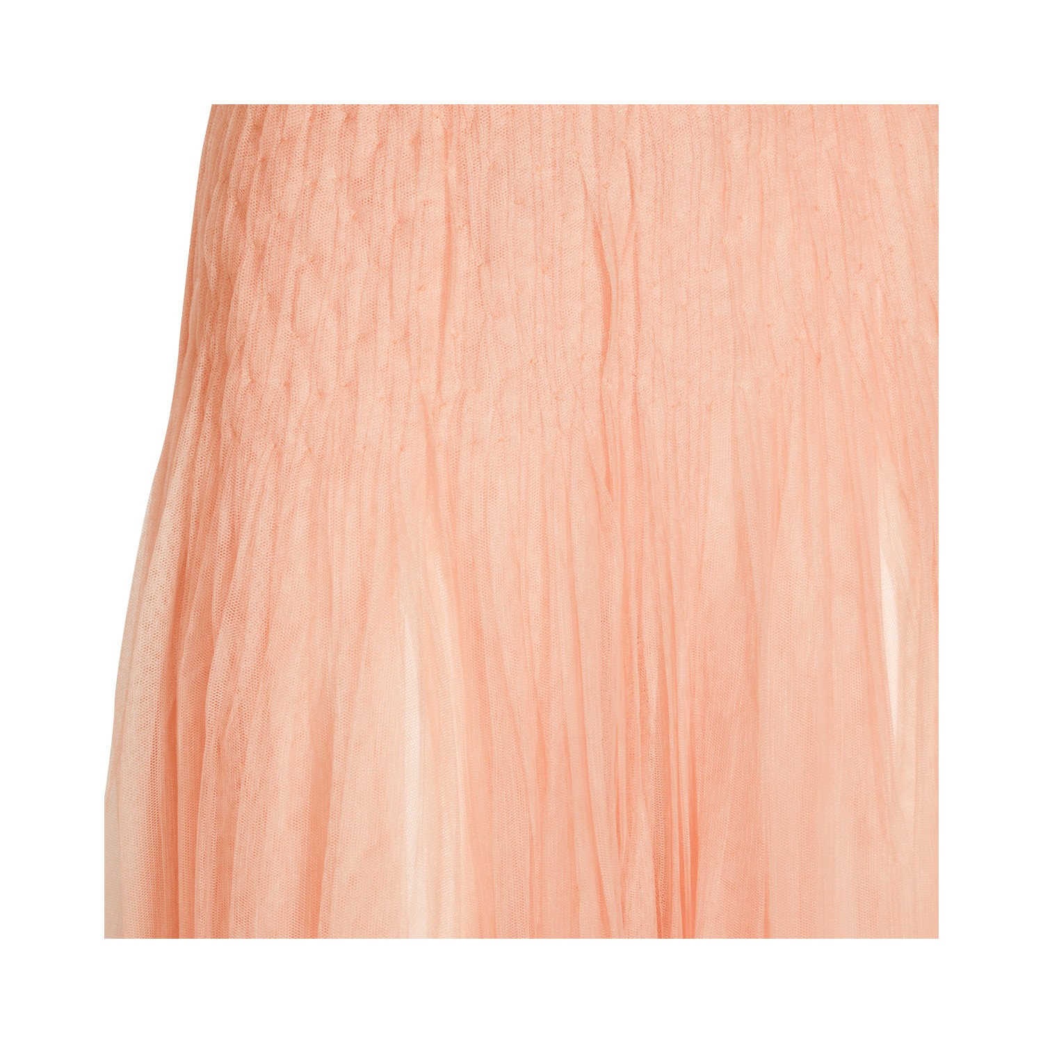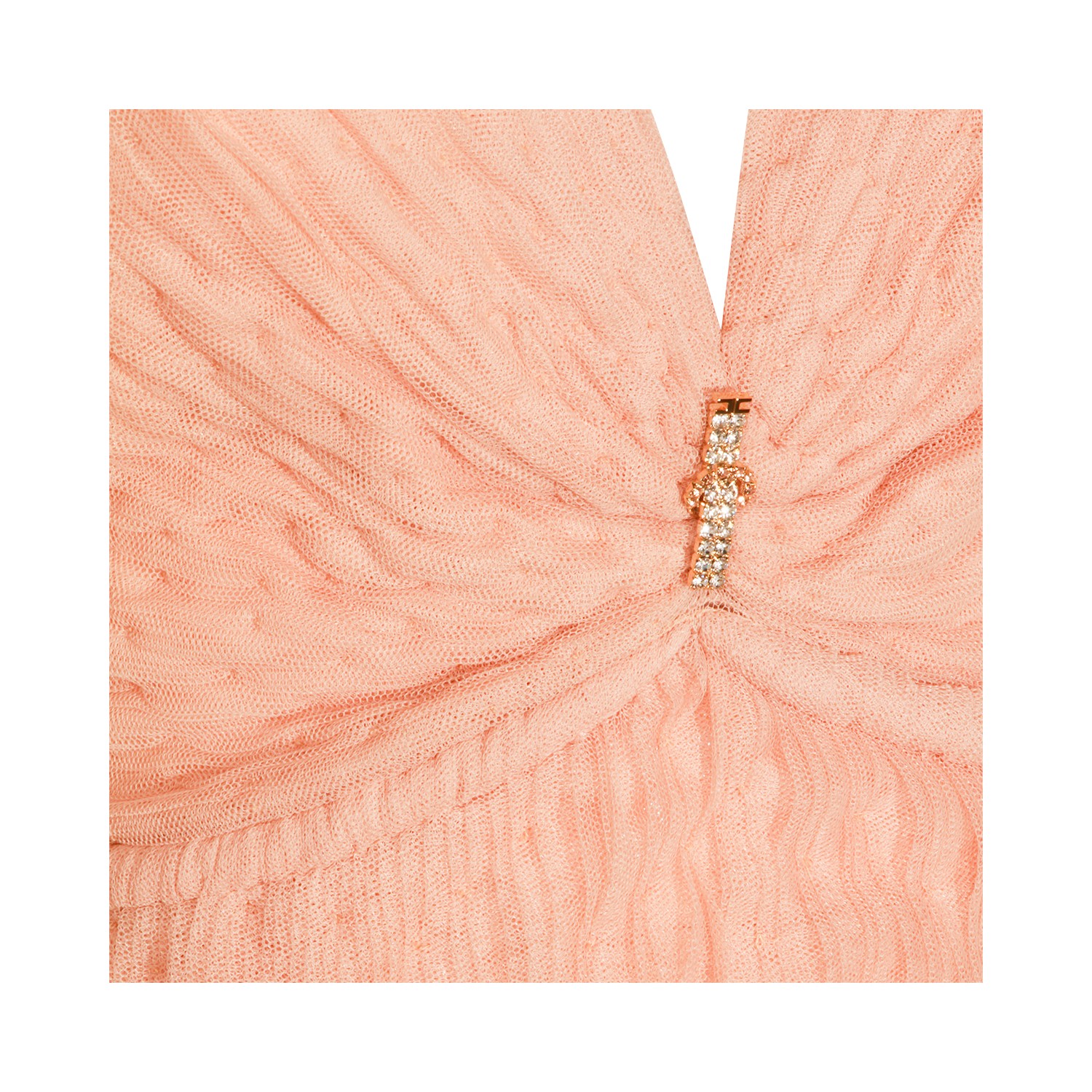 Nude long dress from Elisabetta Franchi with long length, deep V neck, button closure at back and tulle inserts.