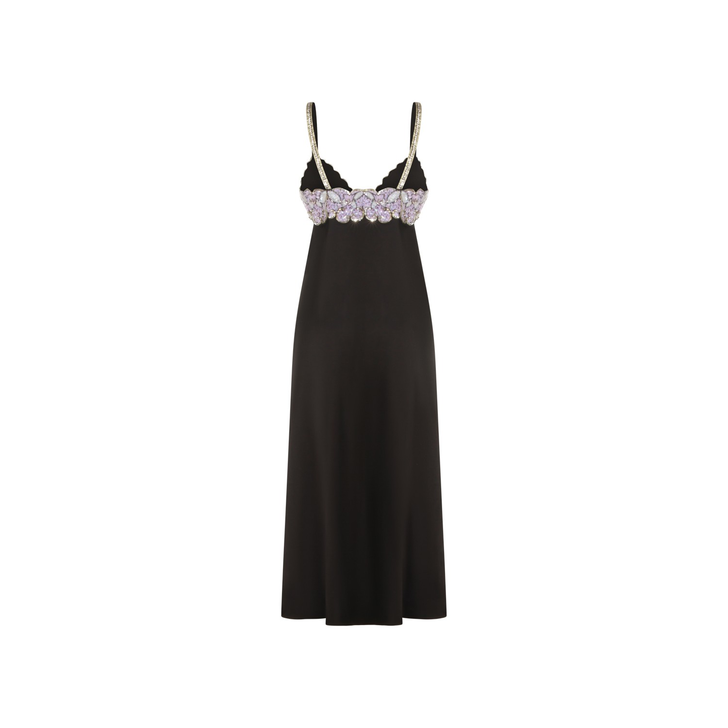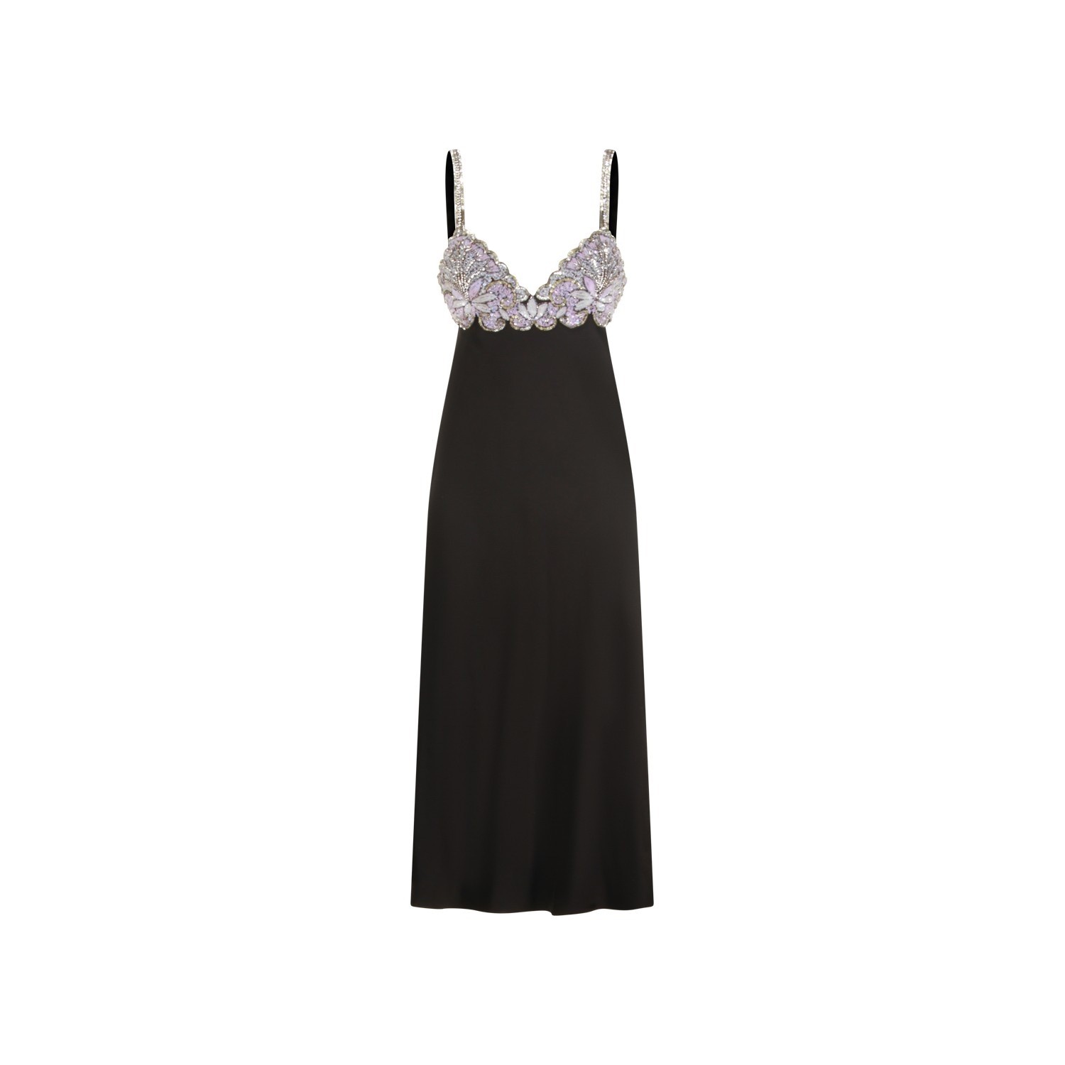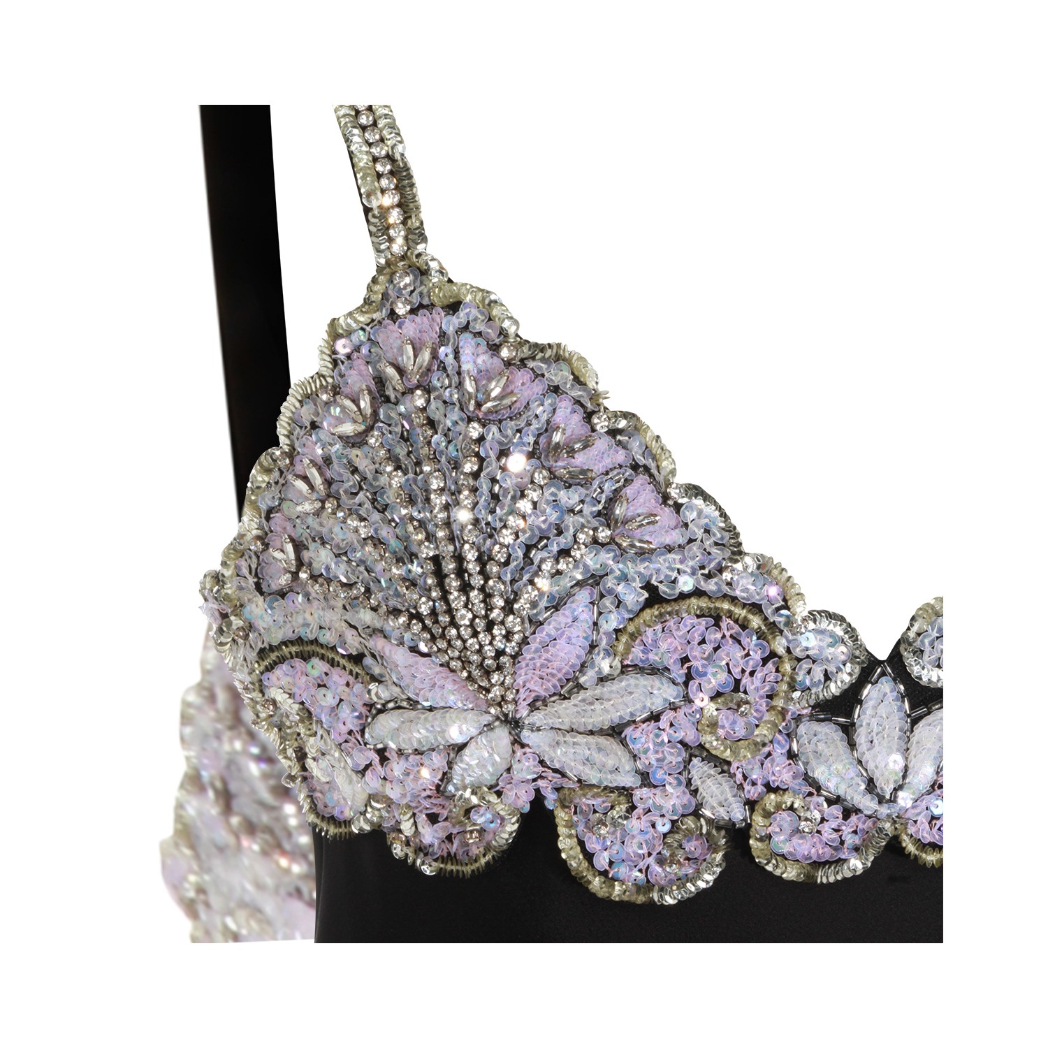 Black and silver crystal dress from Valentino featuring thin crystal sleeves, long length, deep V neck and emperor line.