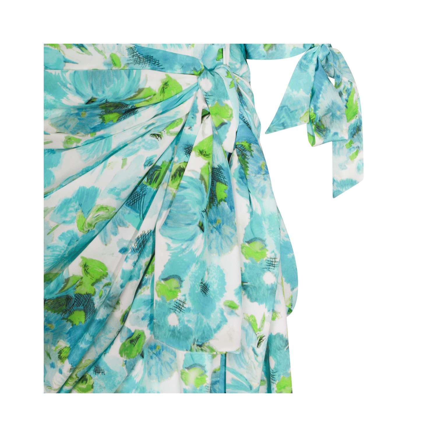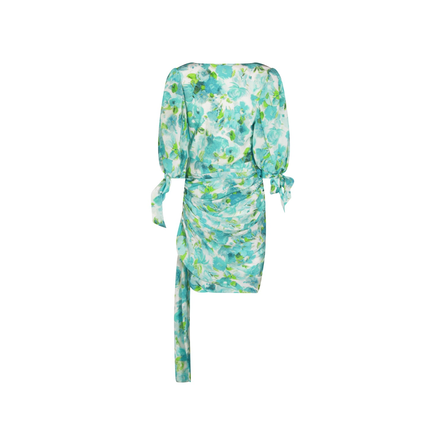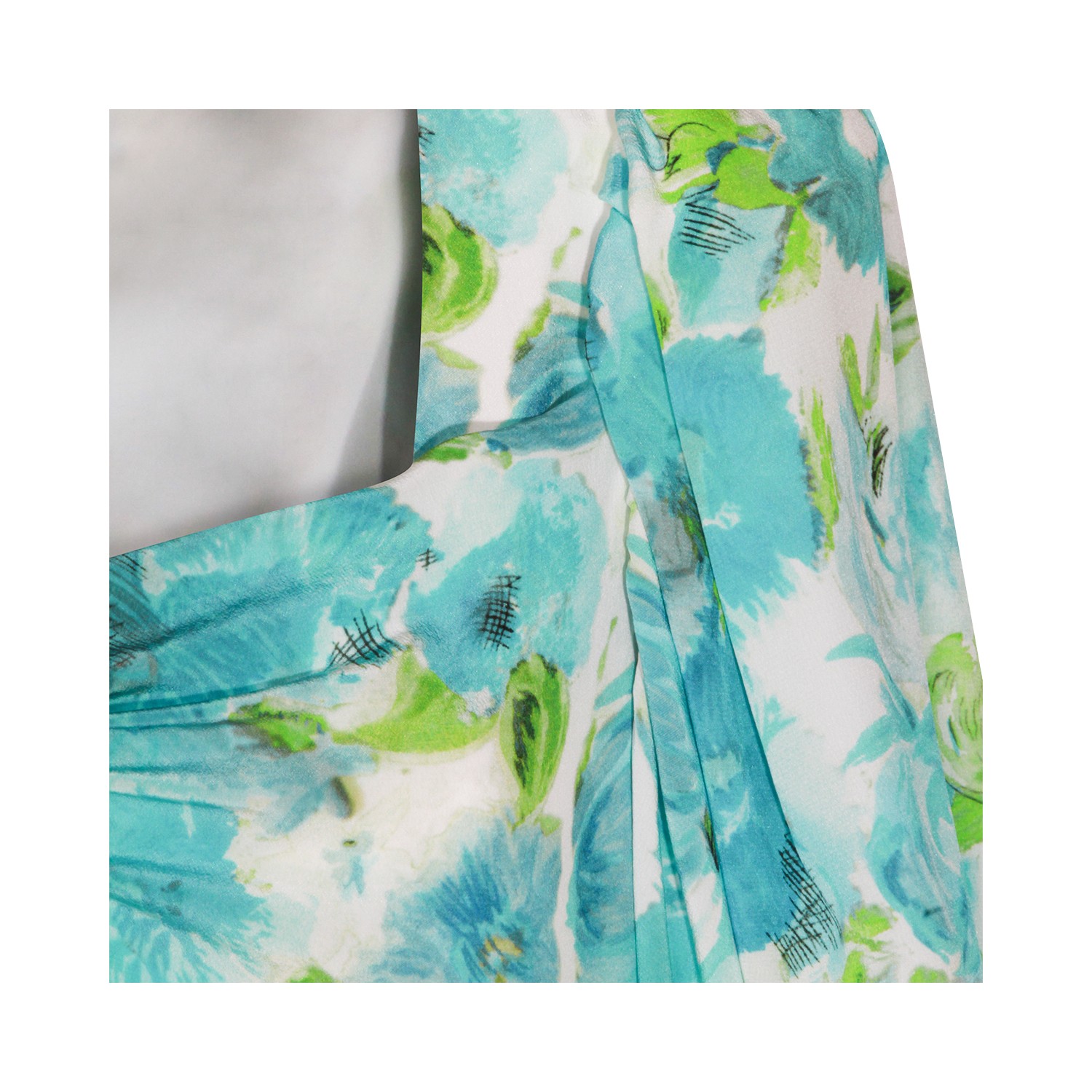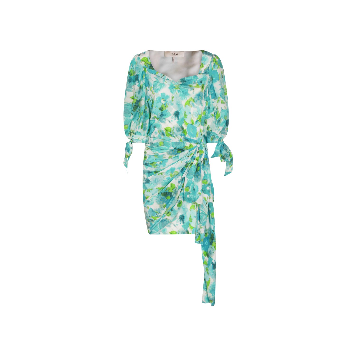 White and blue silk dress from Chloe featuring stretch fit, short line, round neck and elbow sleeves.