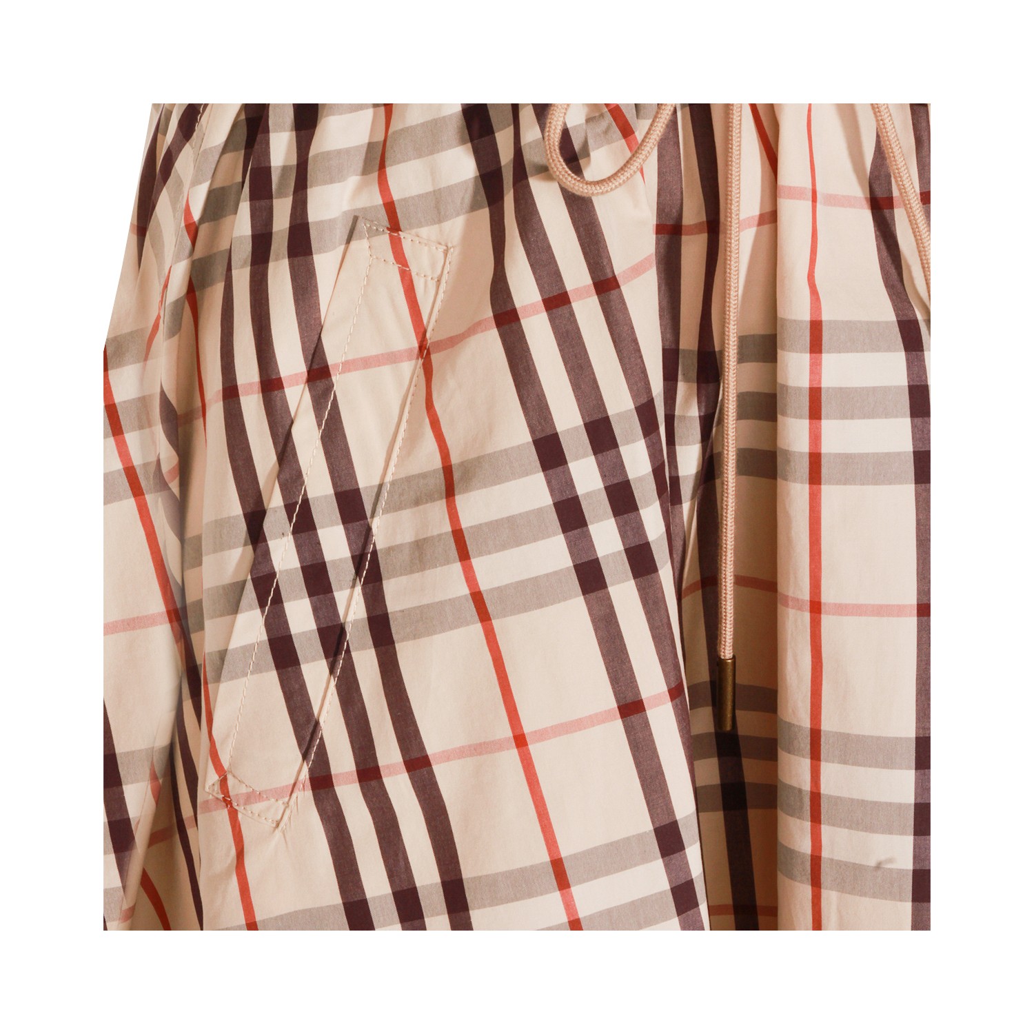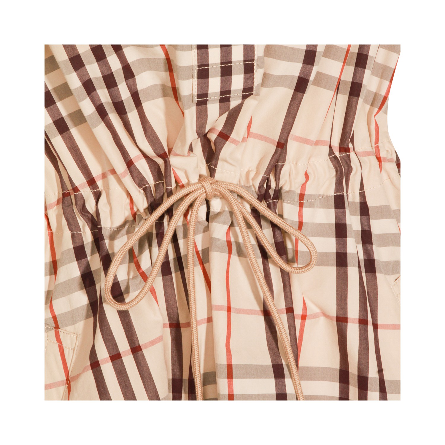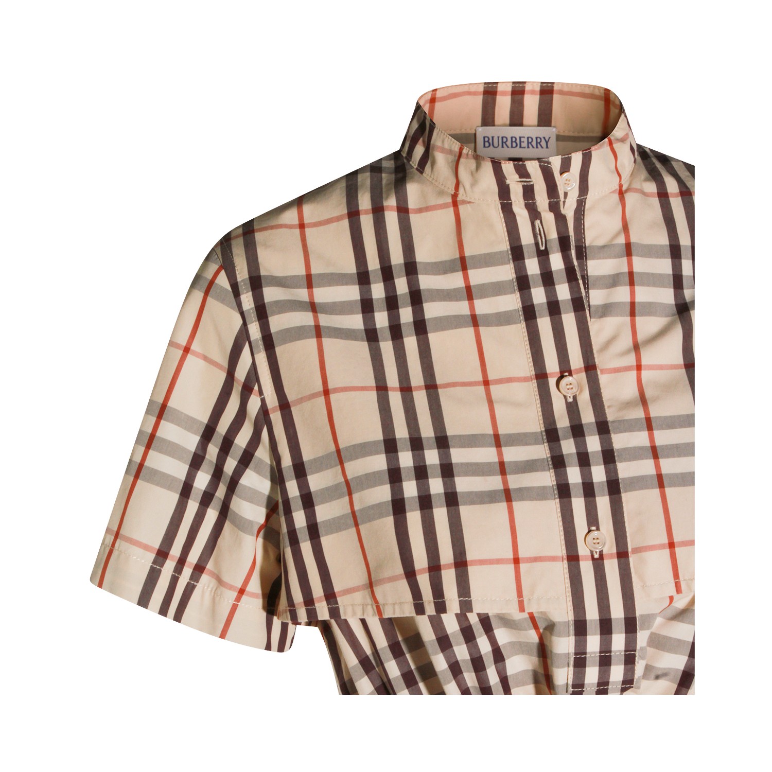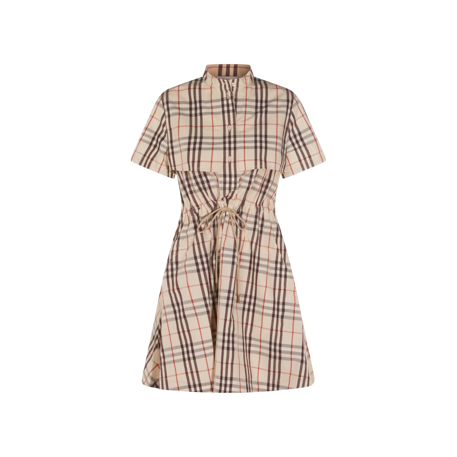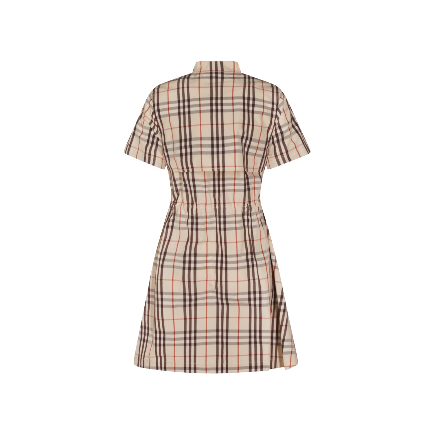 Almond beige cotton Ip Check dress from Burberry featuring all over Check motif, chemisier line, button closure, short sleeves and belted waist.