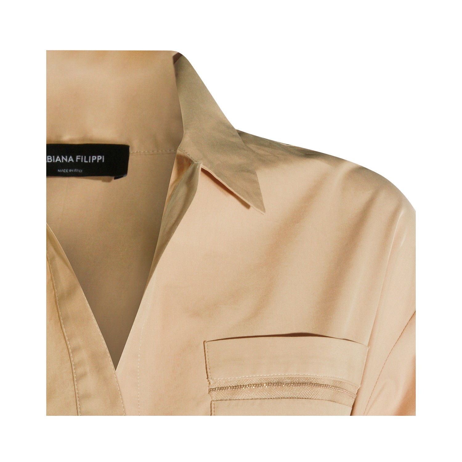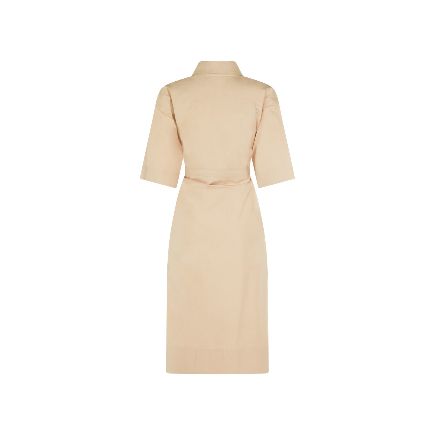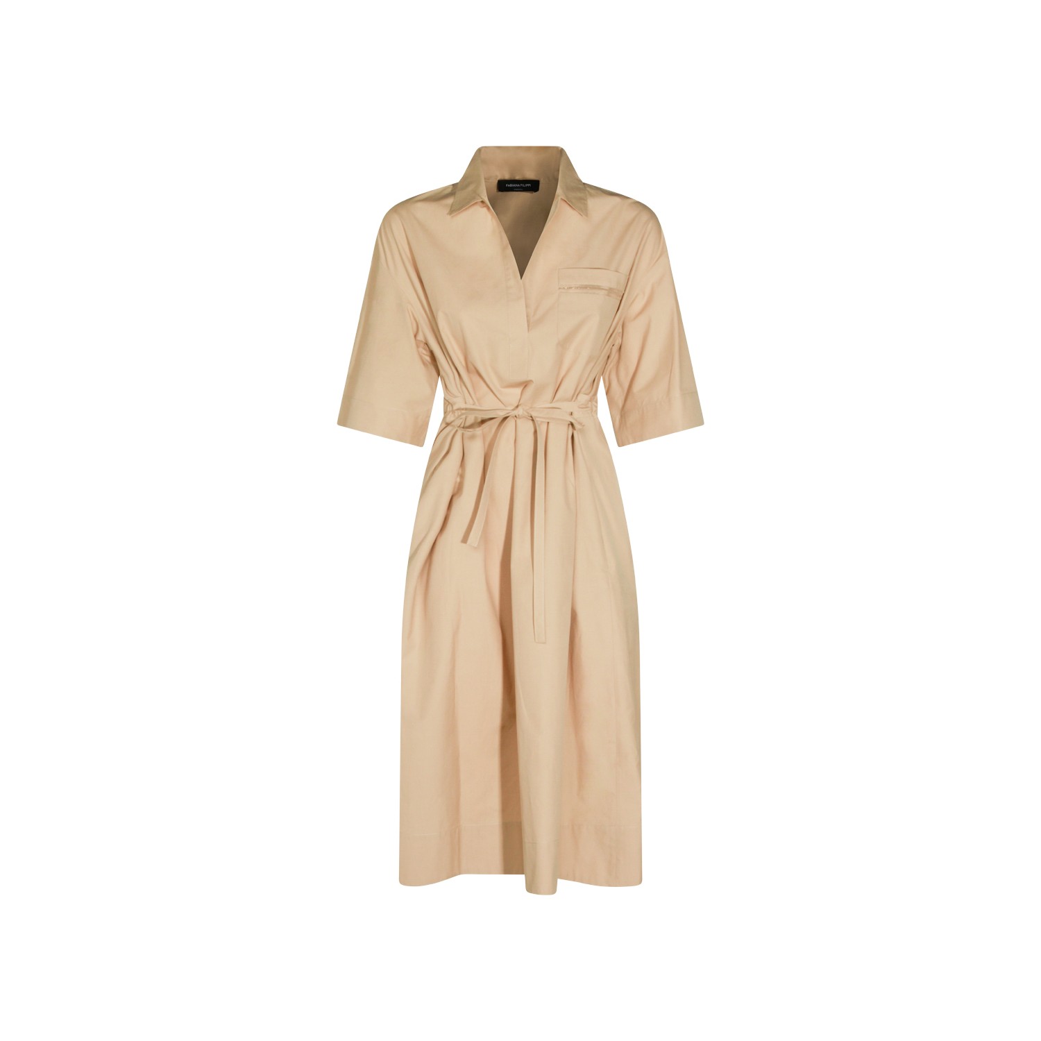 Beige cotton dress from Fabiana Filippi featuring classic collar, v neck, short sleeves, matchy belt waist and soft vestibility.