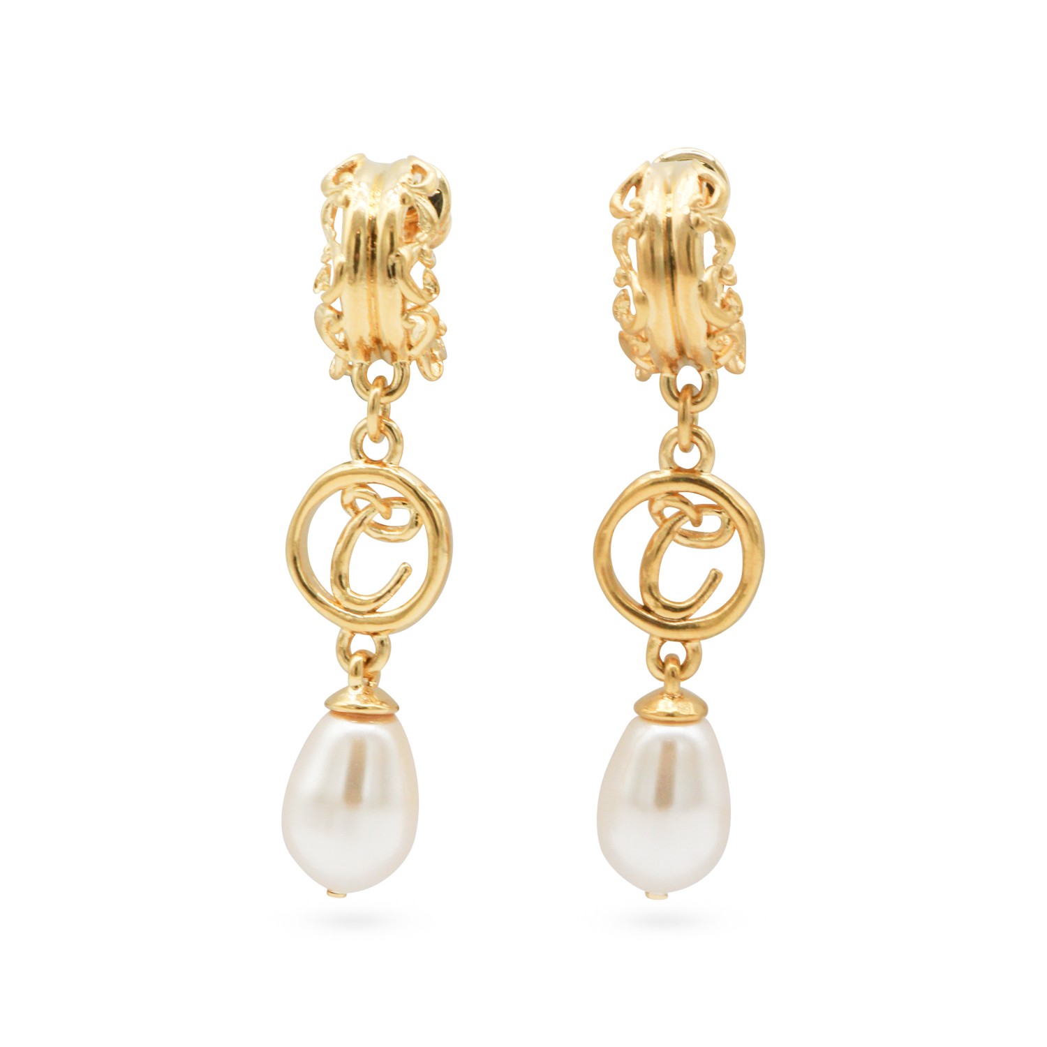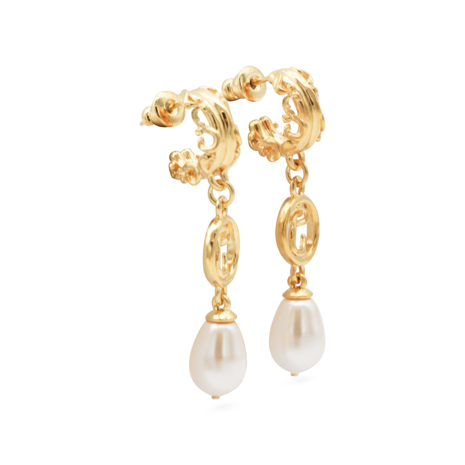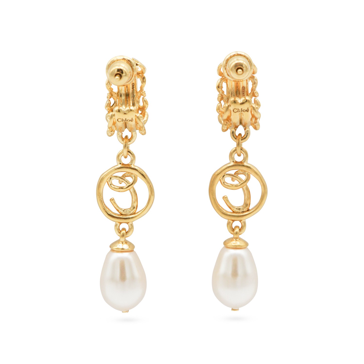 Gold and pearly brass earrings from Chlofeaturing gold tone hardware, monogram and pearls.