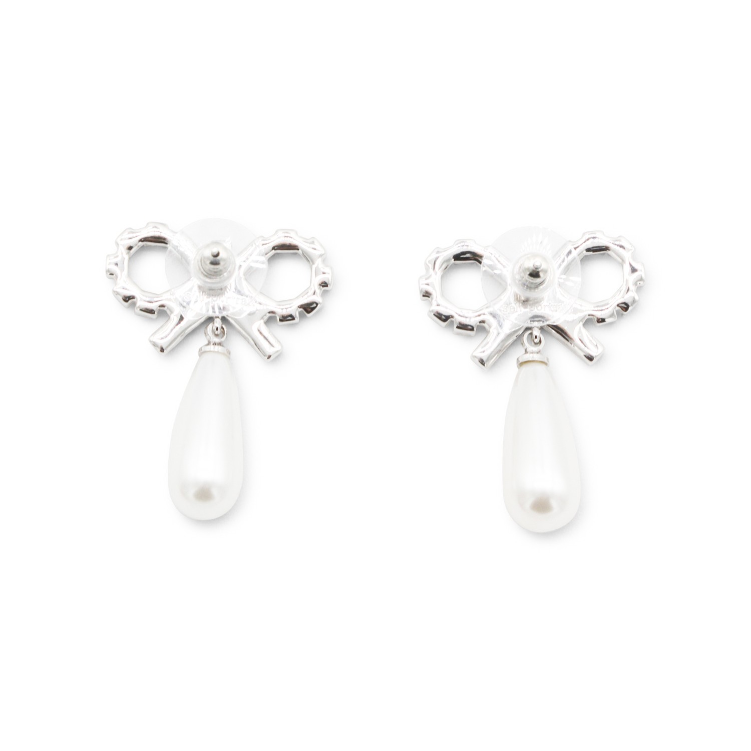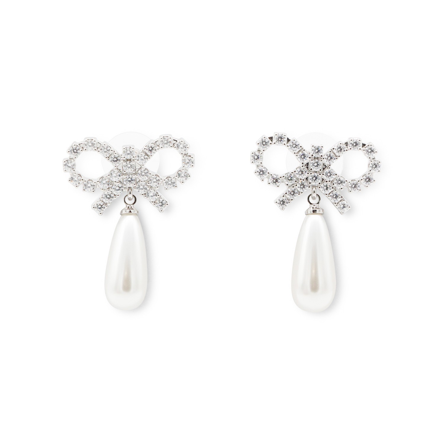 Silver metal earrings from Self-Portrait featuring bow embellishments, crystals and pearls.