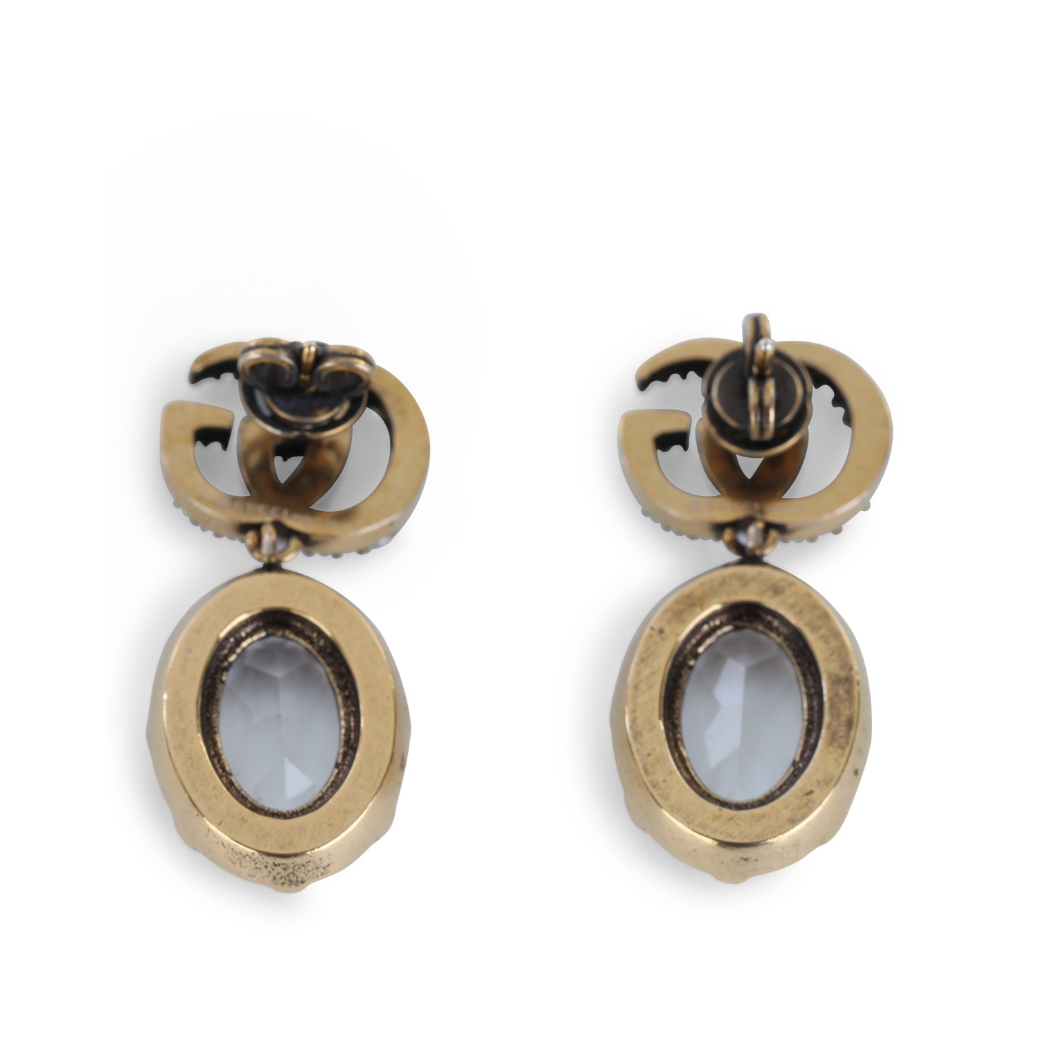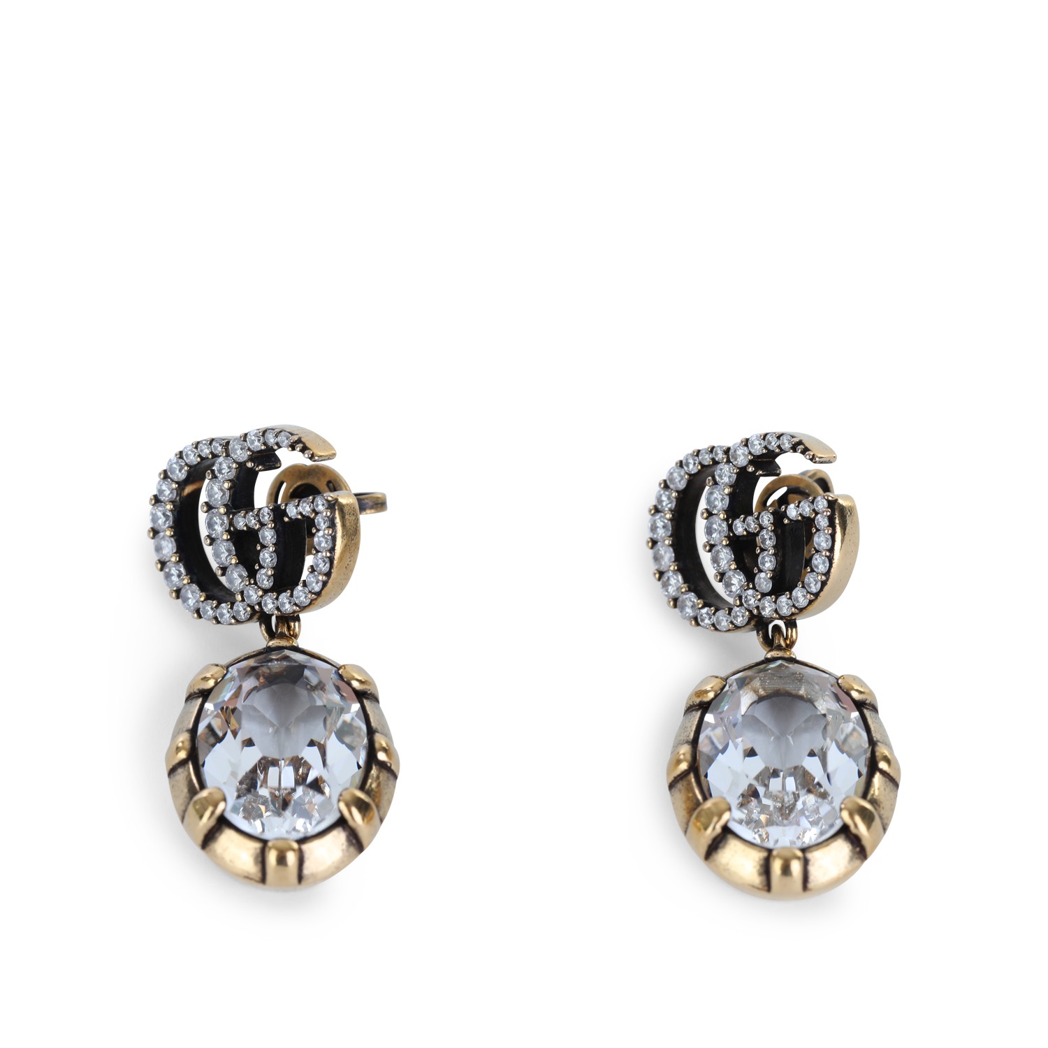 Gold brass earrings from Gucci featuring gold tone, back fastening, crystals and logo.