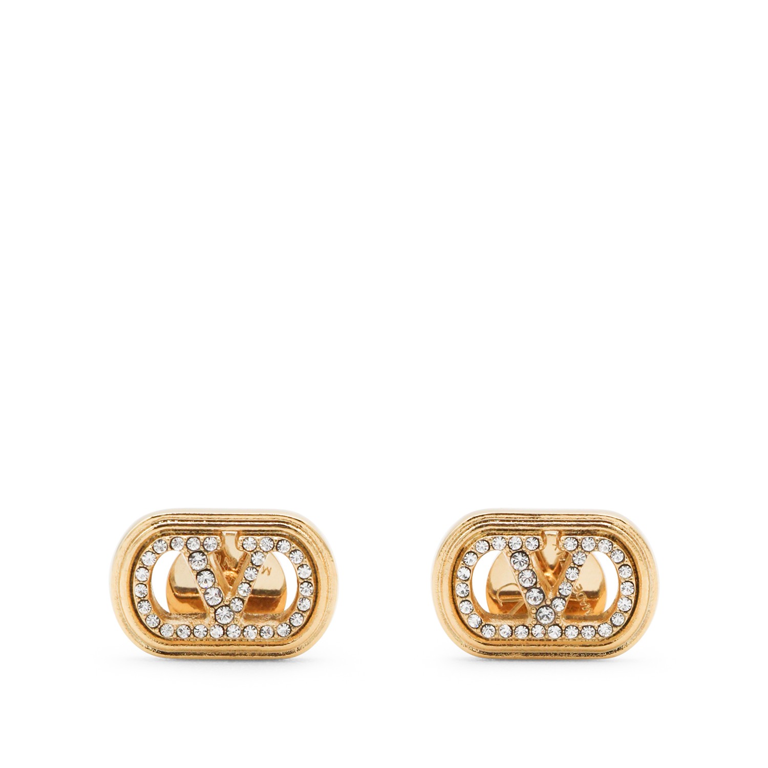Gold and crystal earrings from Valentino Garavani featuring gold tone logo, back fastening and crystal details.