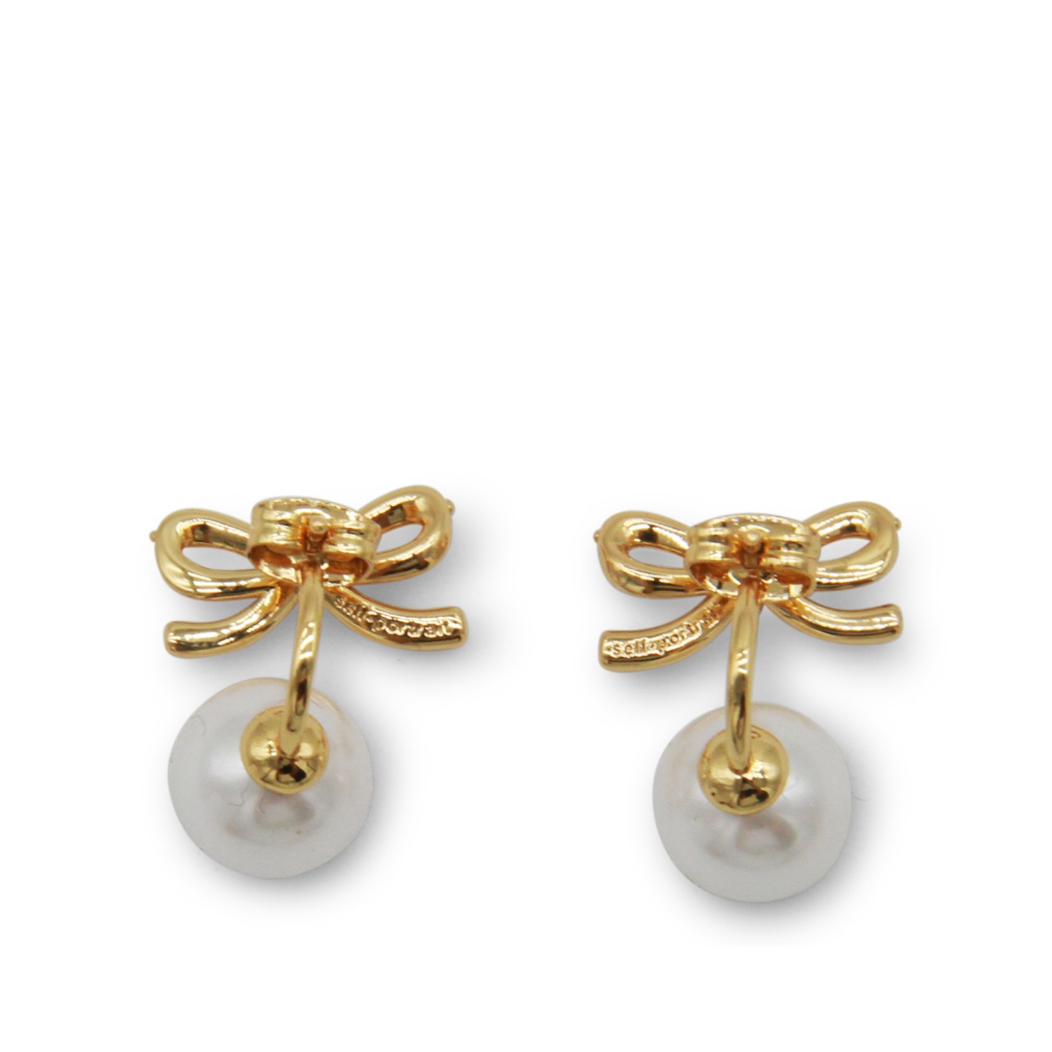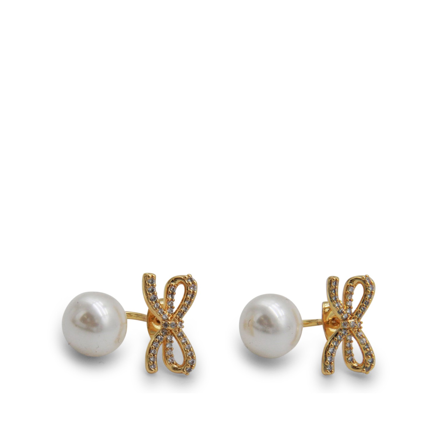 Gold and pearl earrings from Self-Portrait featuring bow embellishment, pearl pendant, back fastening and gold tone hardware.