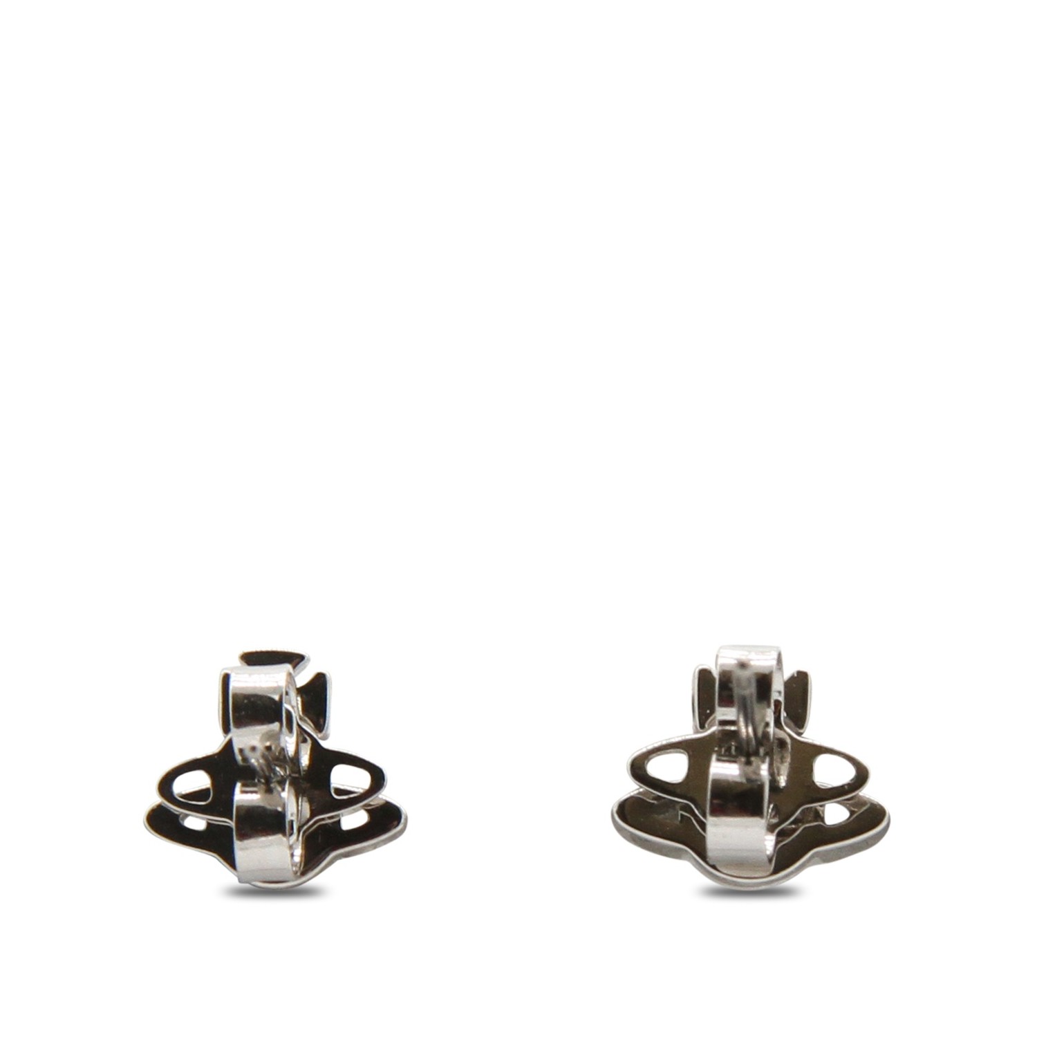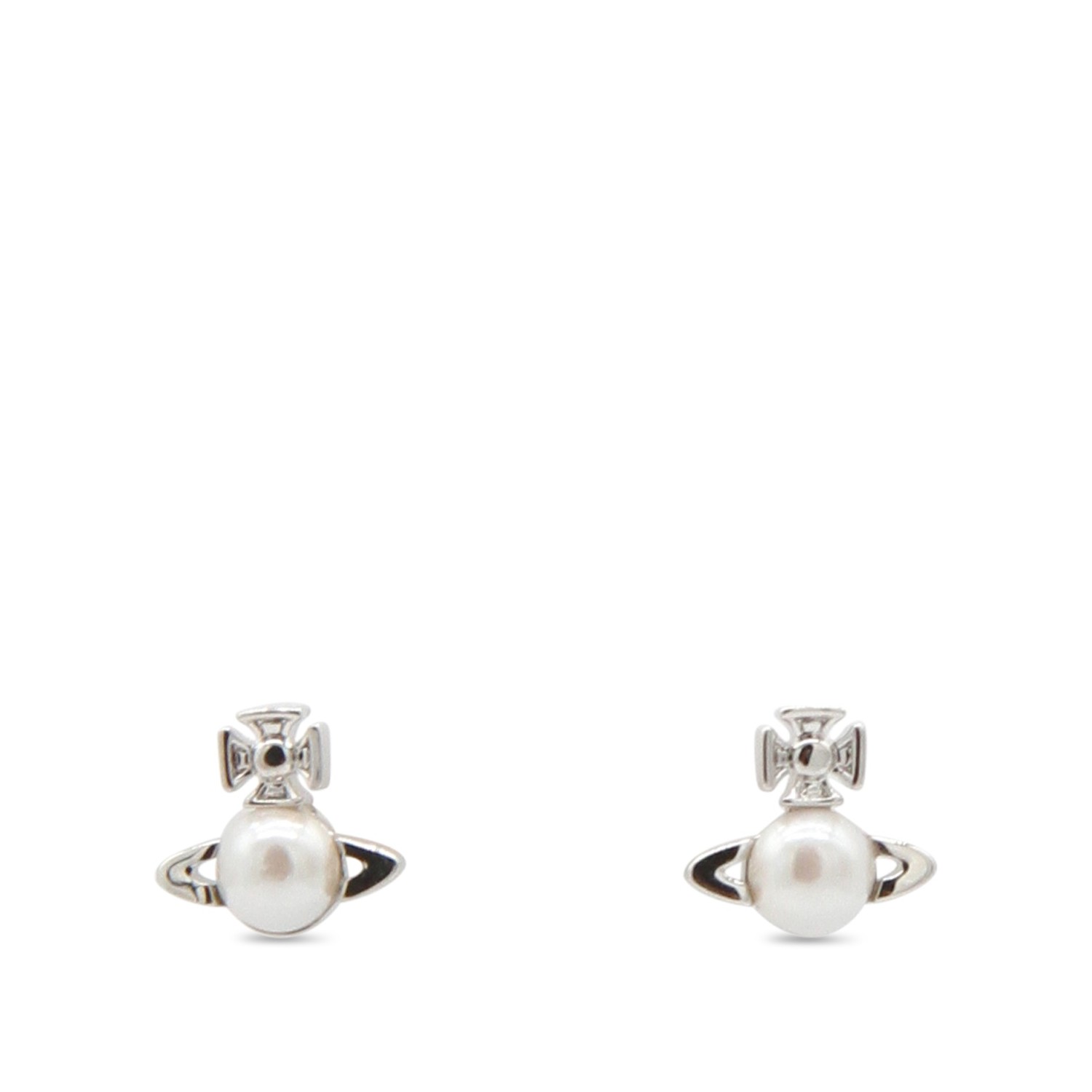 Platinum and cream pearly brass earrings from Vivienne Westwood featuring platinum tone hardware, details and back fastening.