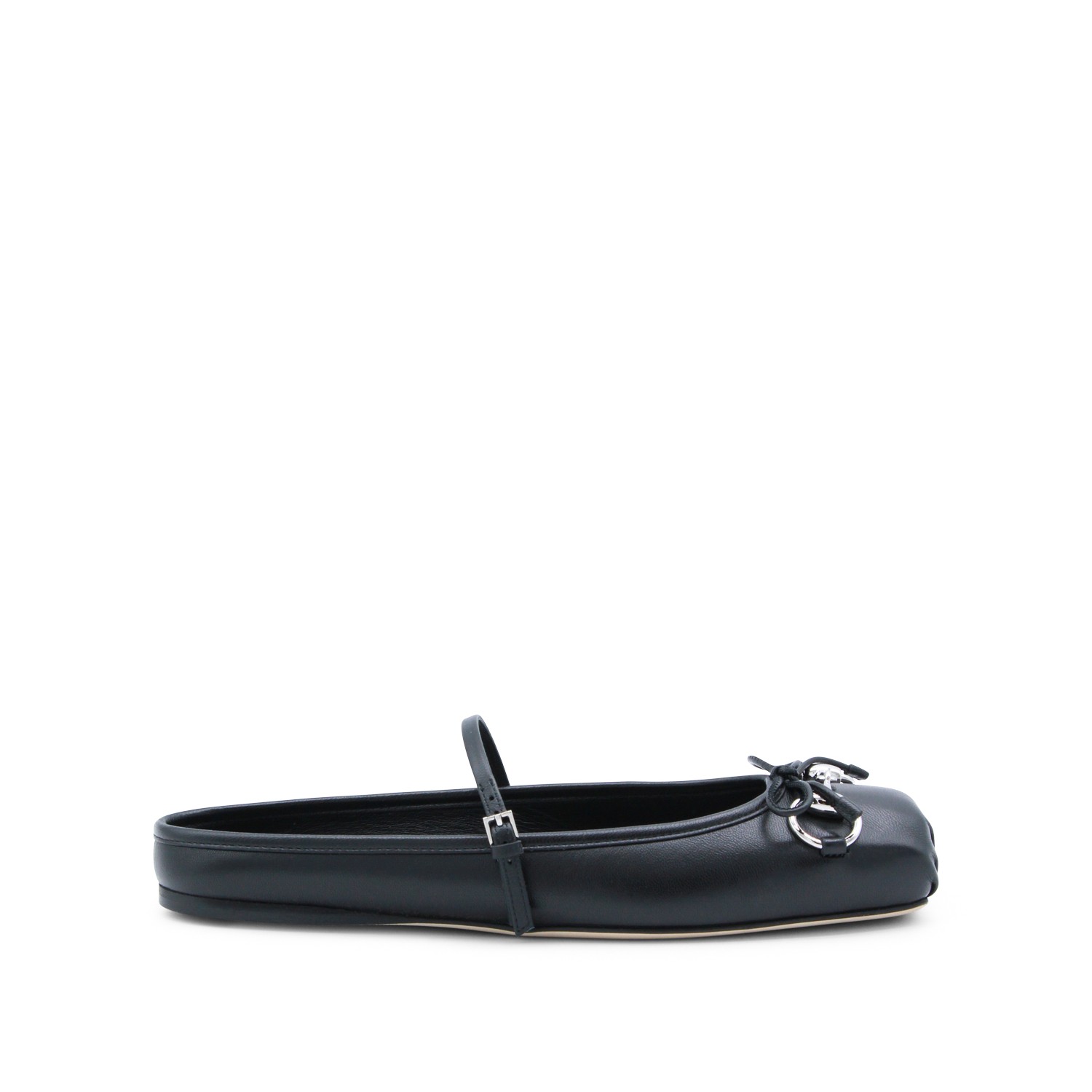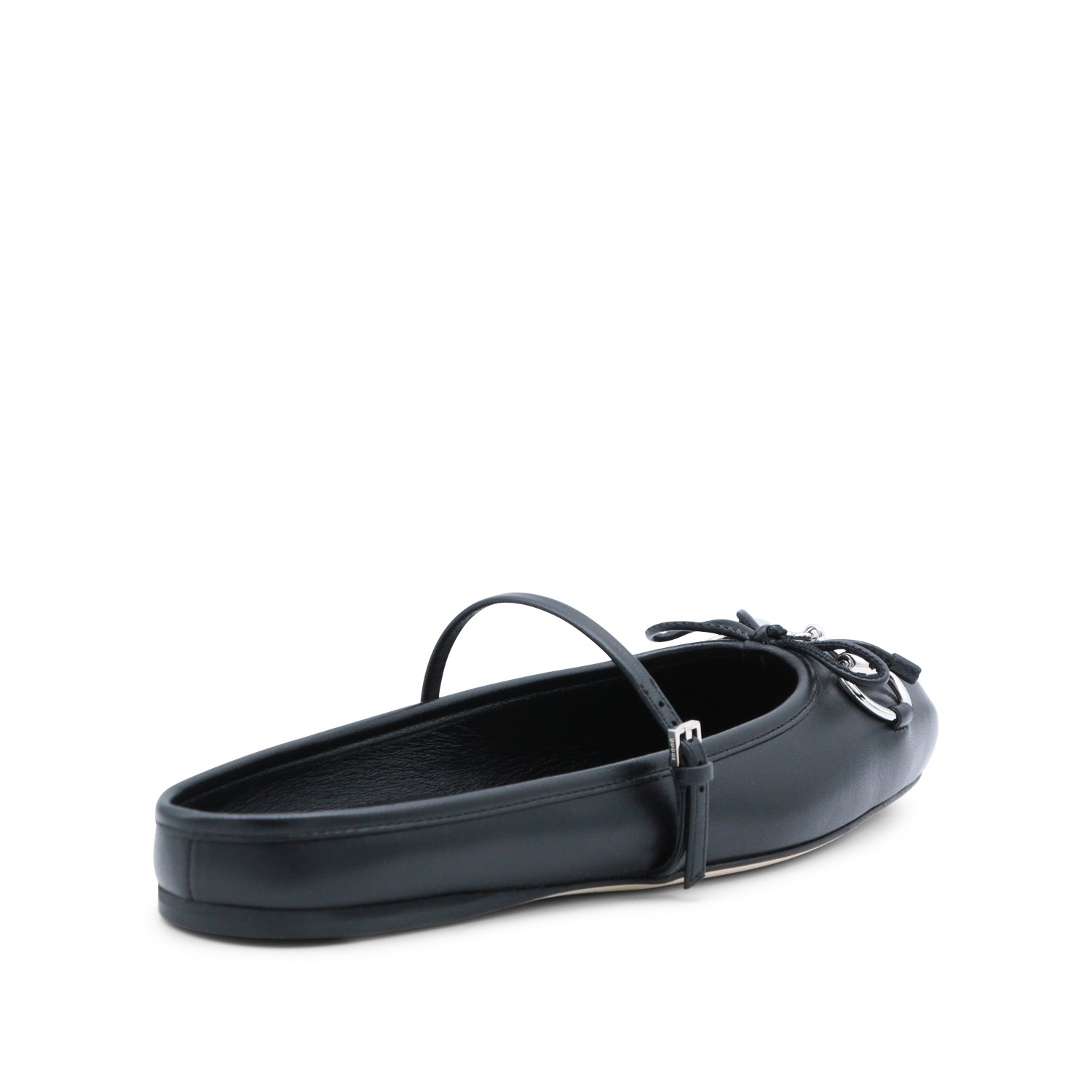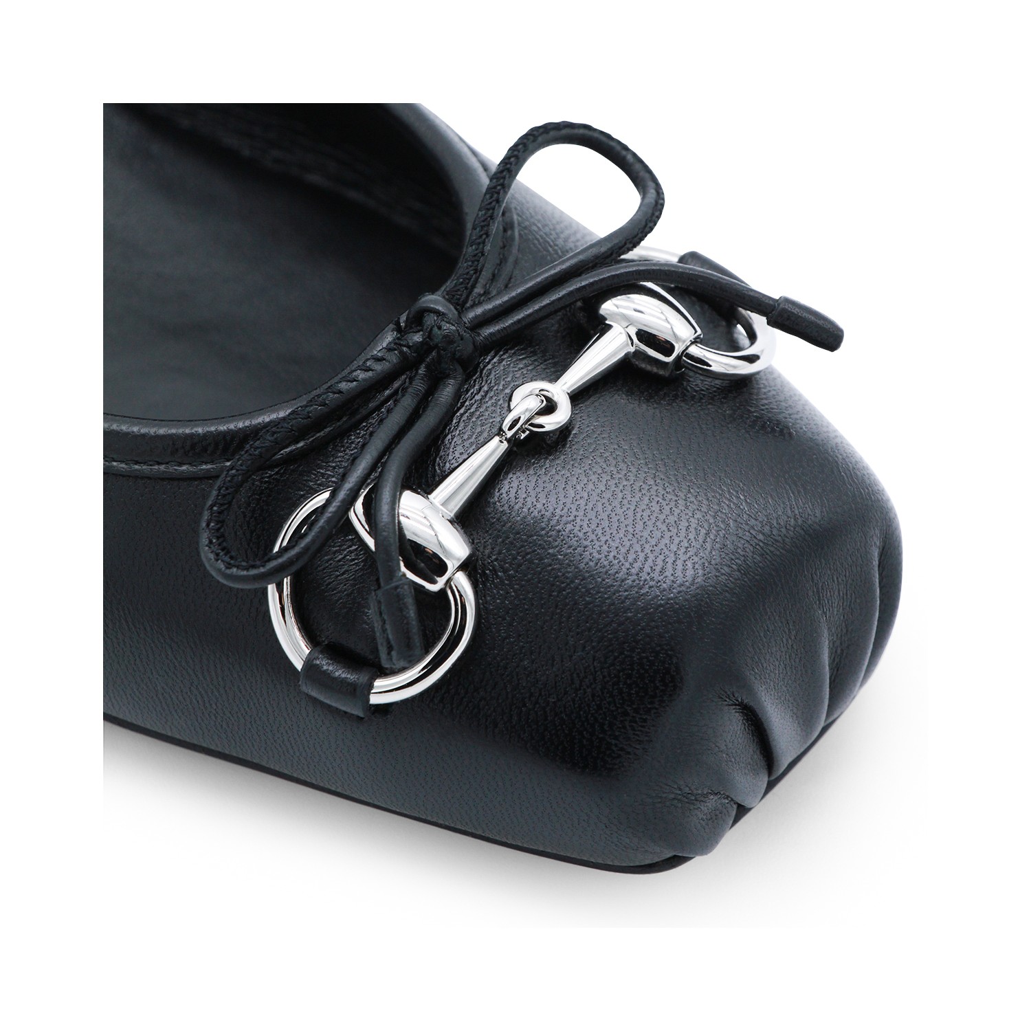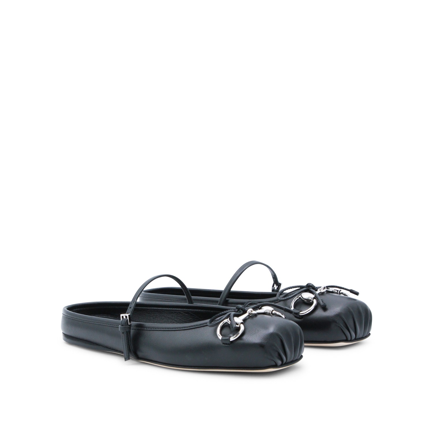 Black leather flats from Gucci featuring square toe, slip-on style, bow details, Horsebit, strap closure, branded insole and flat rubber sole.
