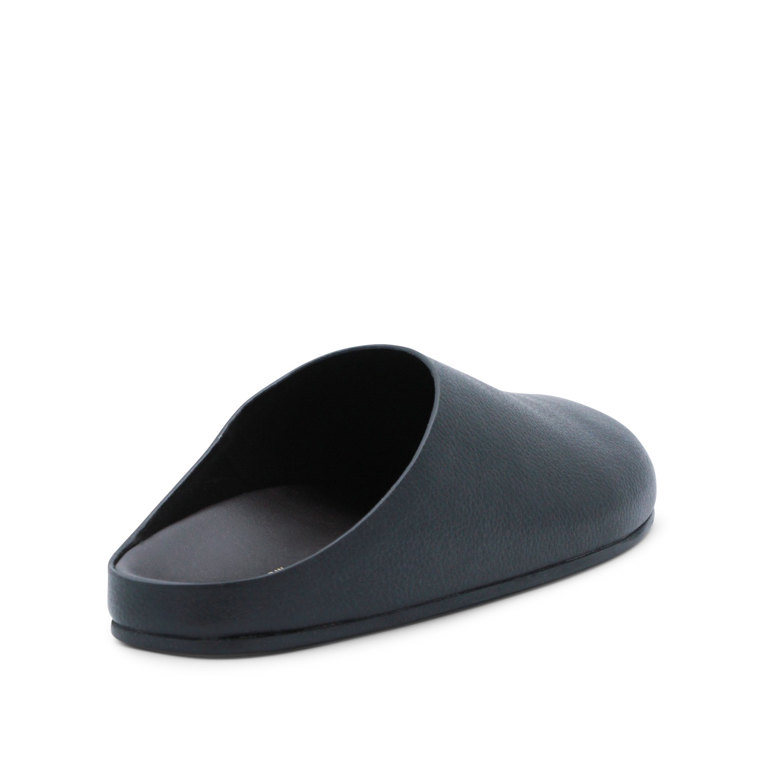 Black leather flats from The Row featuring round toe, open back, slip-on style and flat rubber sole.