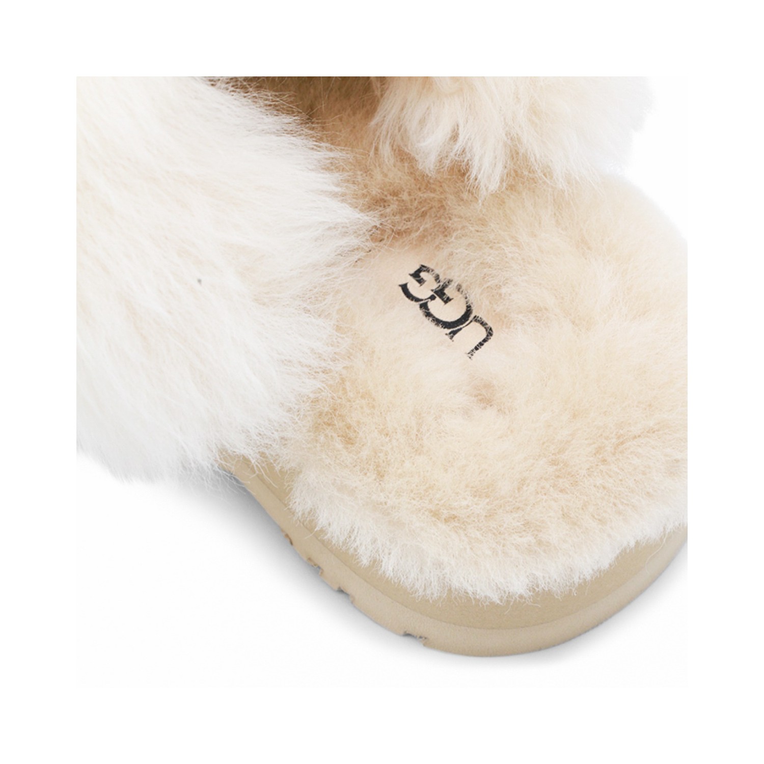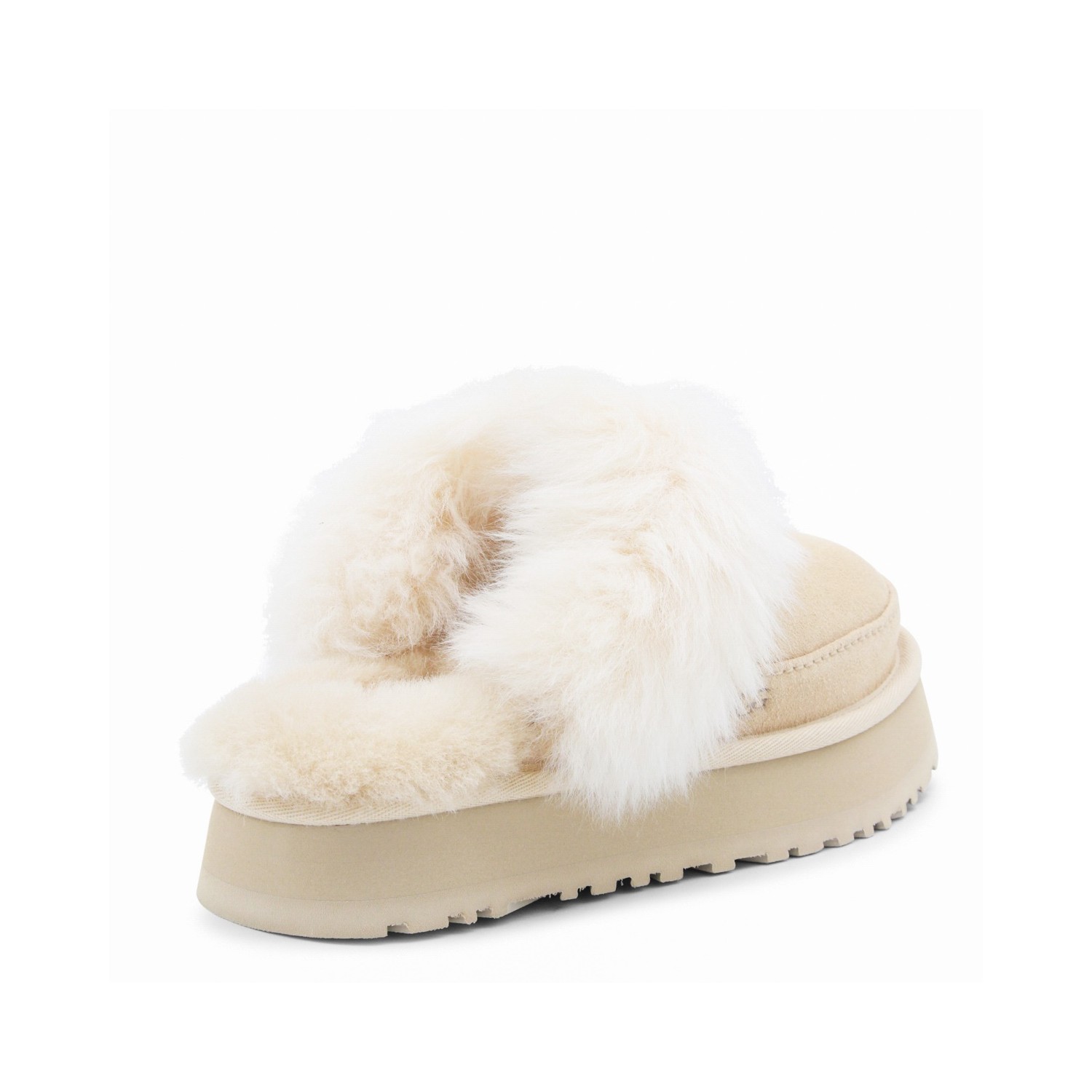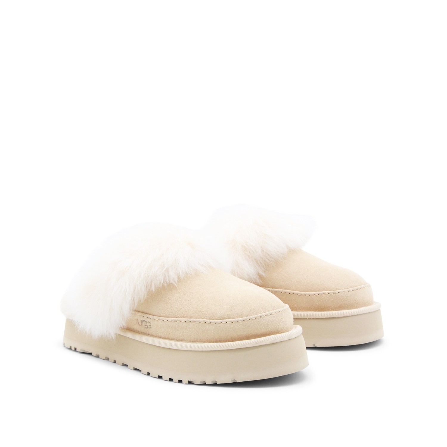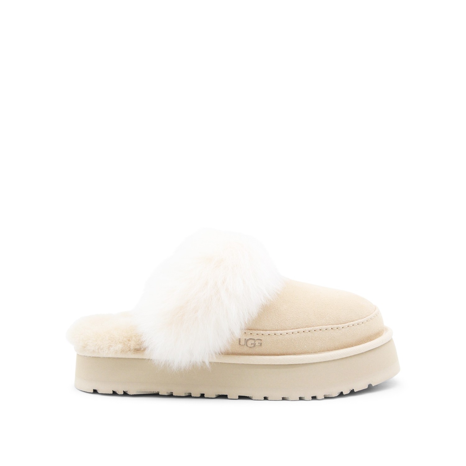 Beige Disquette Chalet flats from UGG featuring round toe, open back, slip-on style, suede, sheepskin details and flat rubber sole.