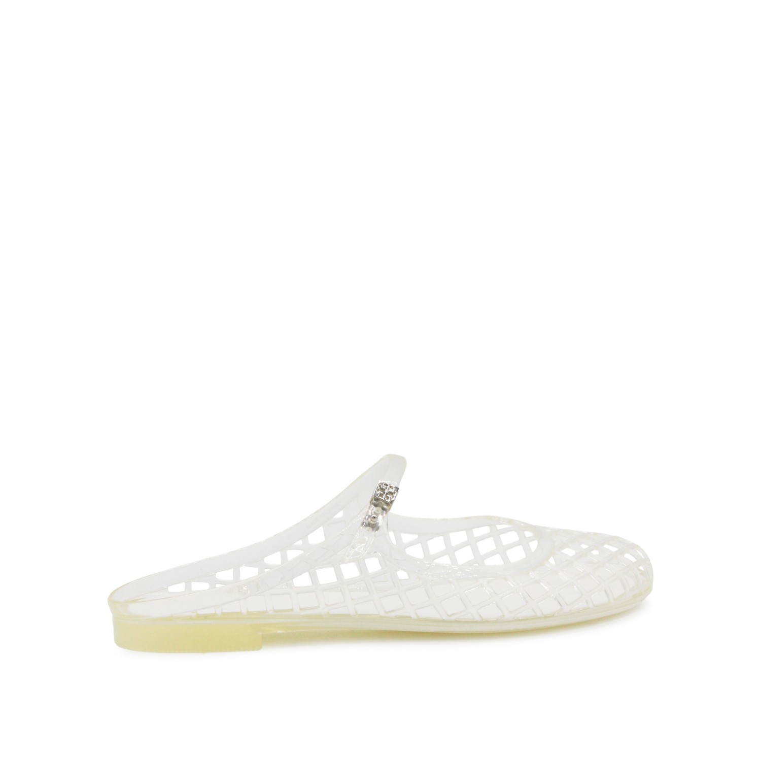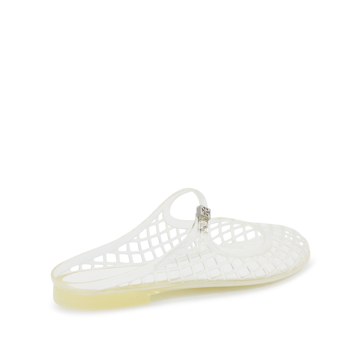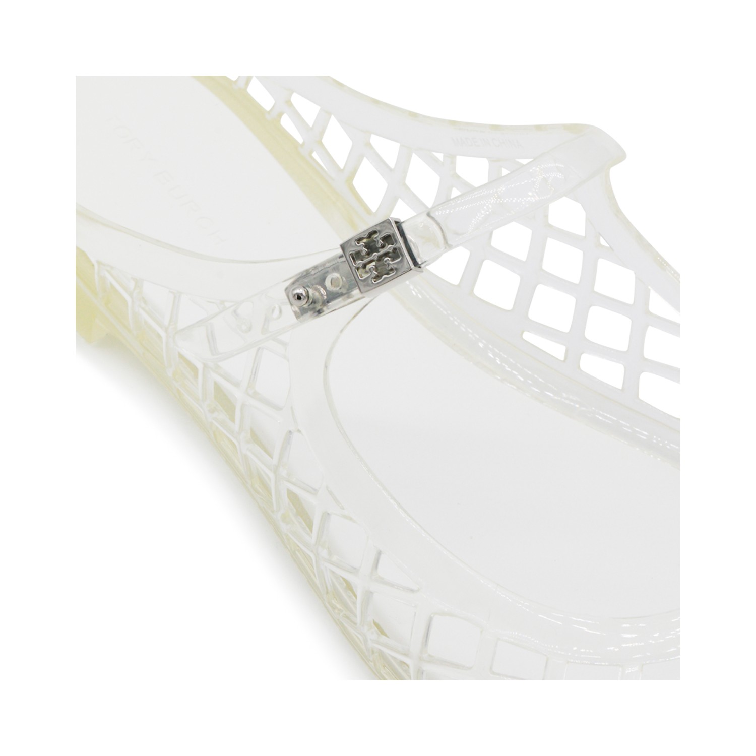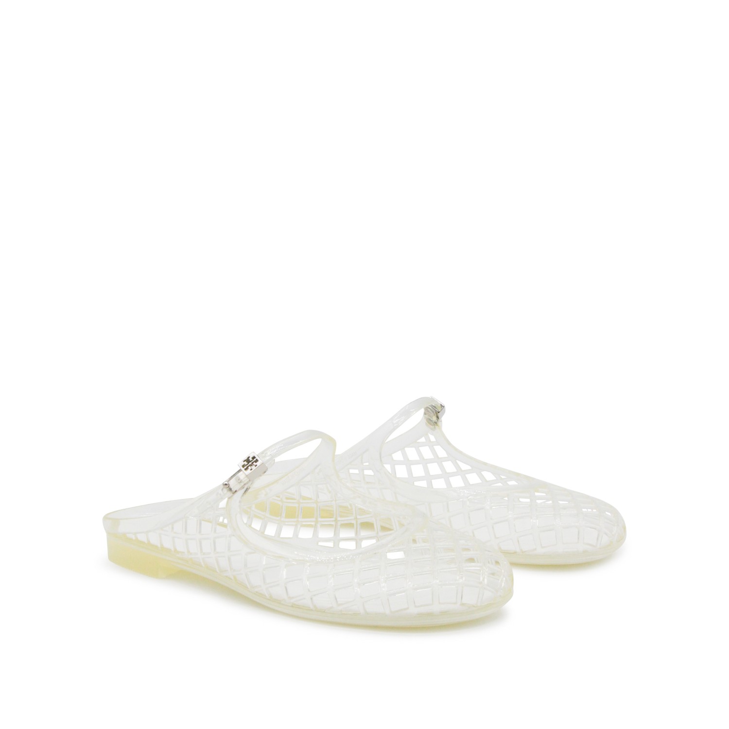 Clear and silver flats from Tory Burch featuring round open toe, open back, slip-on style, buckle fastening and silver hardware.