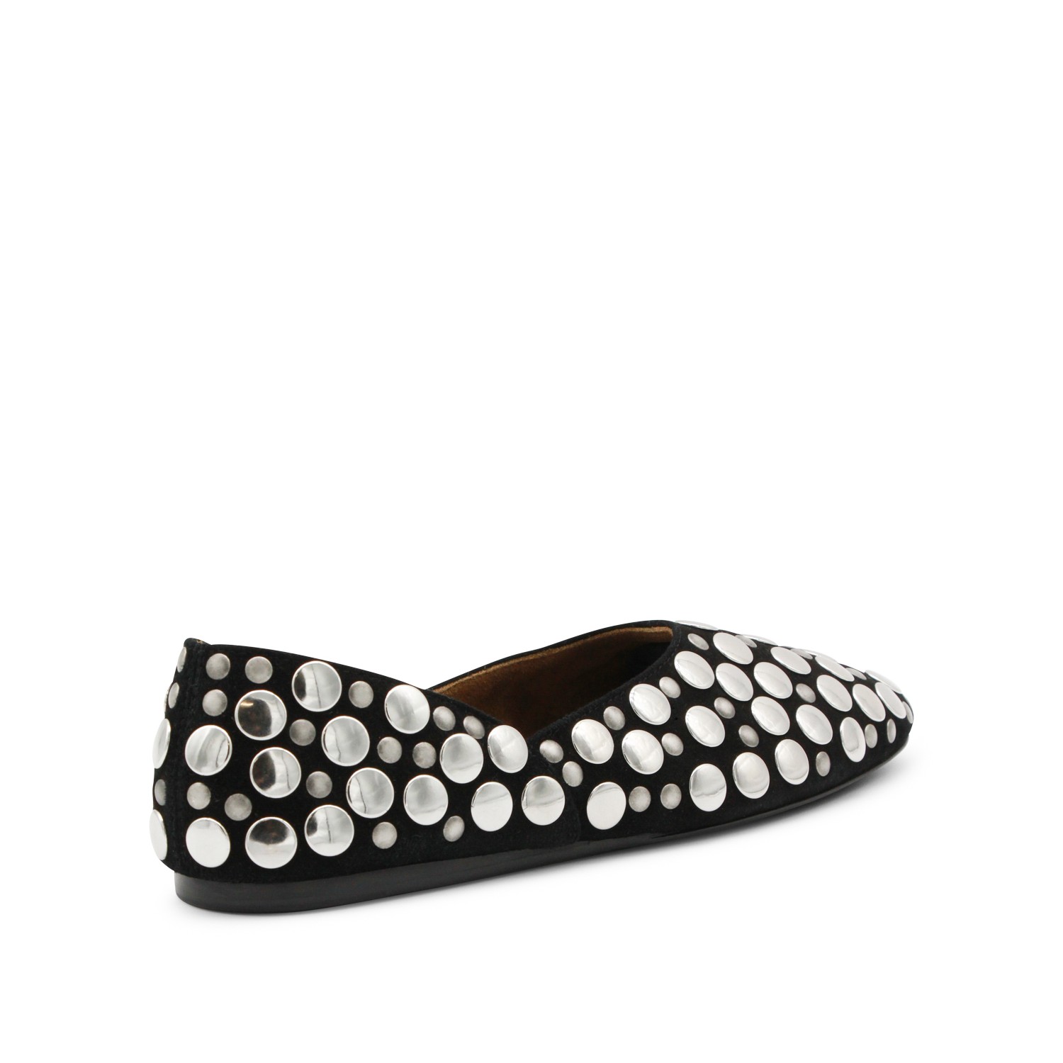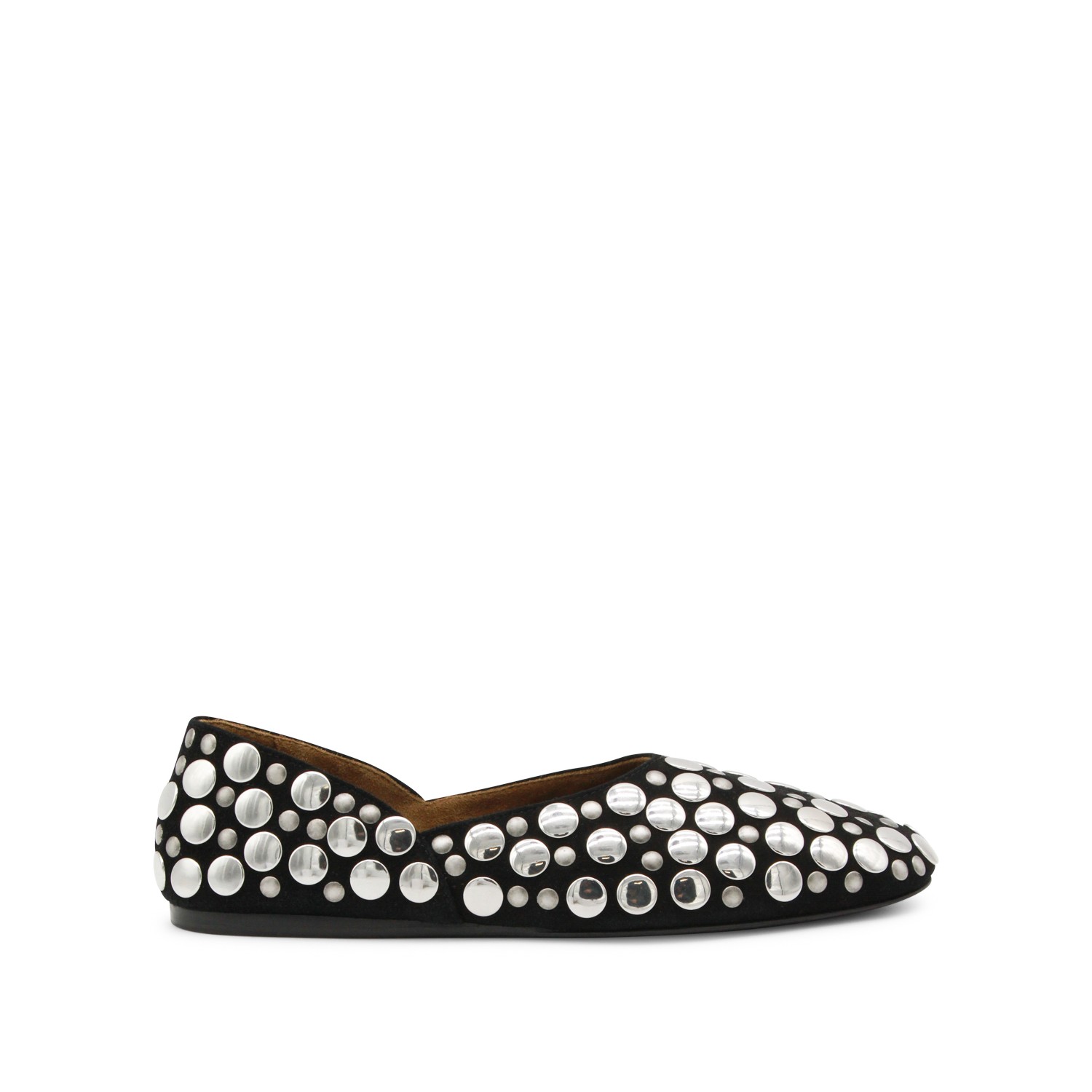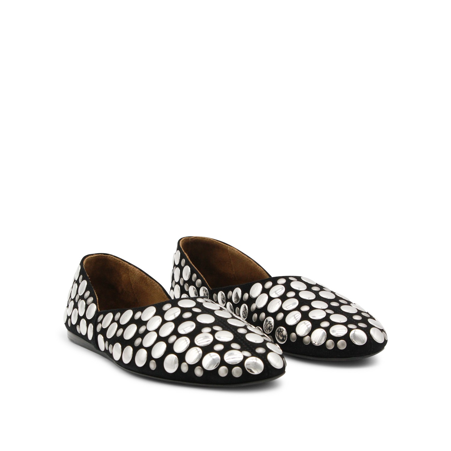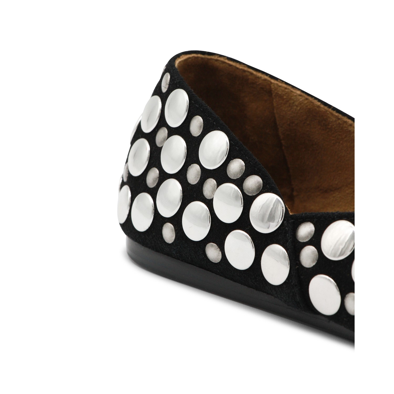 Black leather flats from Khaite featuring round toe, slip-on style, flat sole and all over silver tone studs.