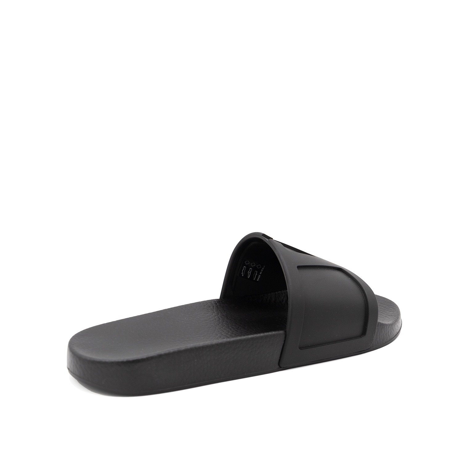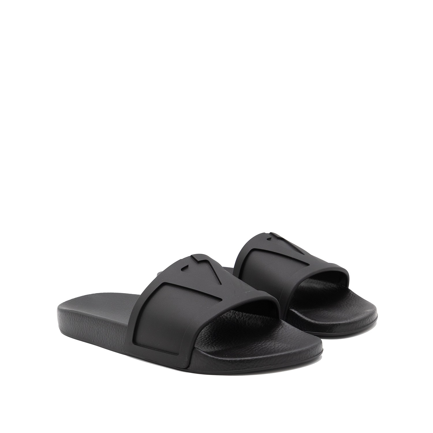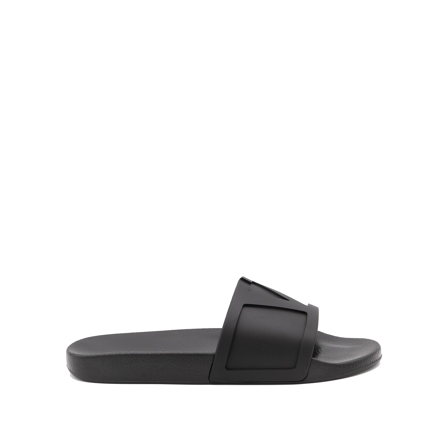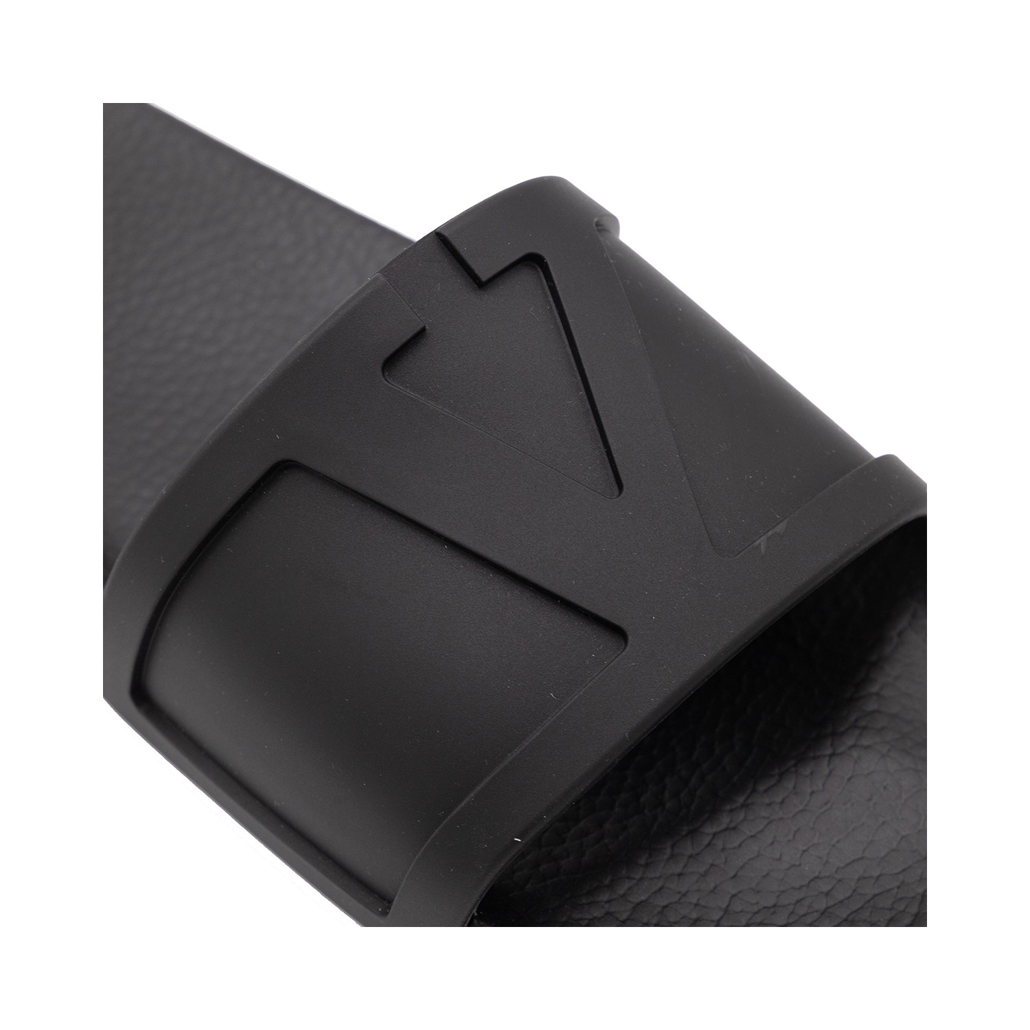 Black leather flats from Valentino Garavani featuring open toe, slip on style, frontal logo and flat sole.