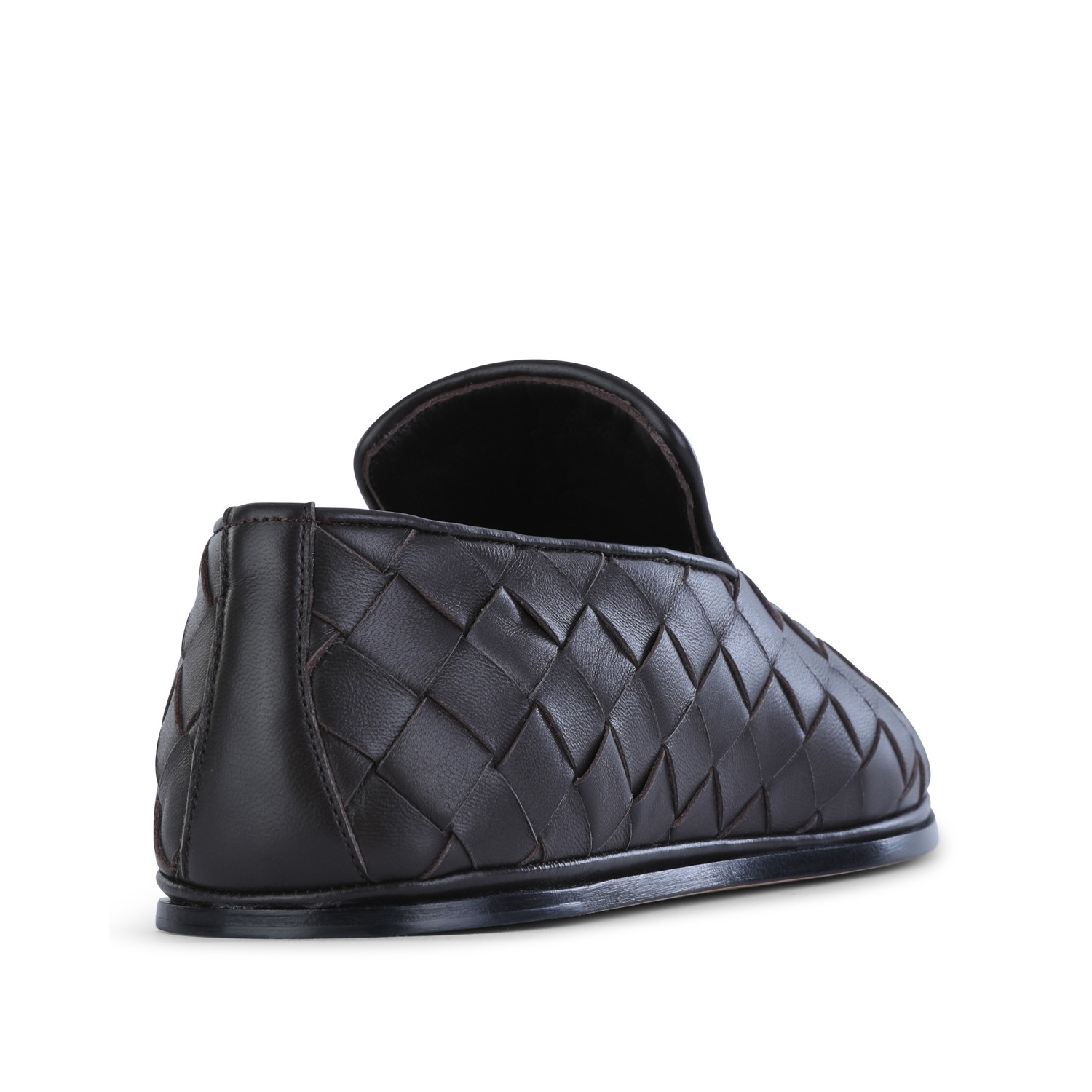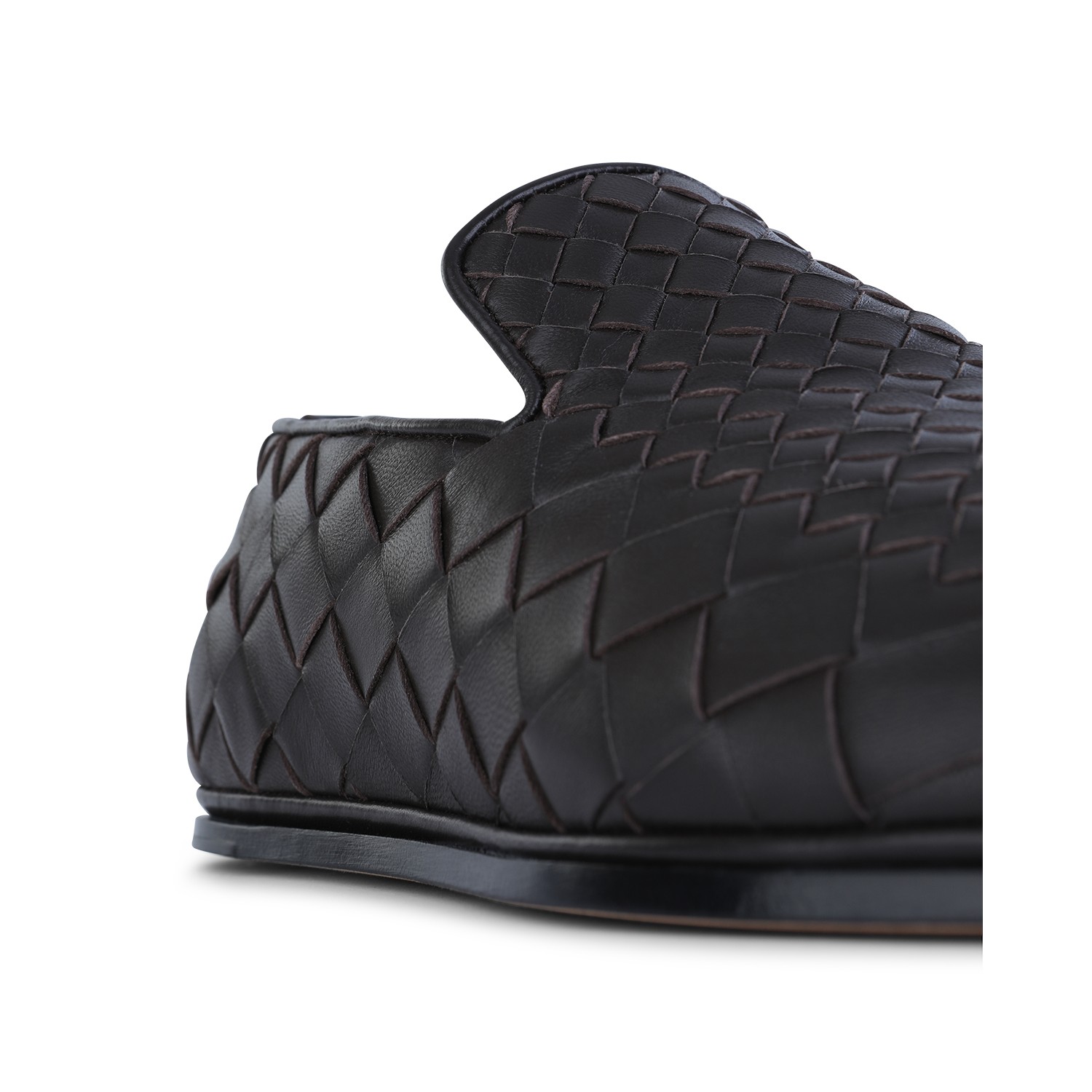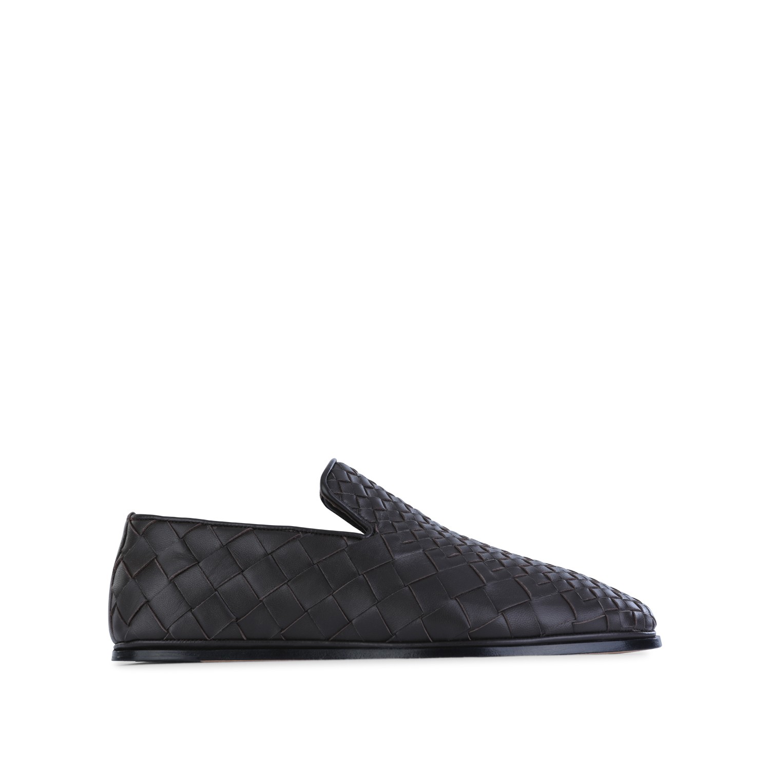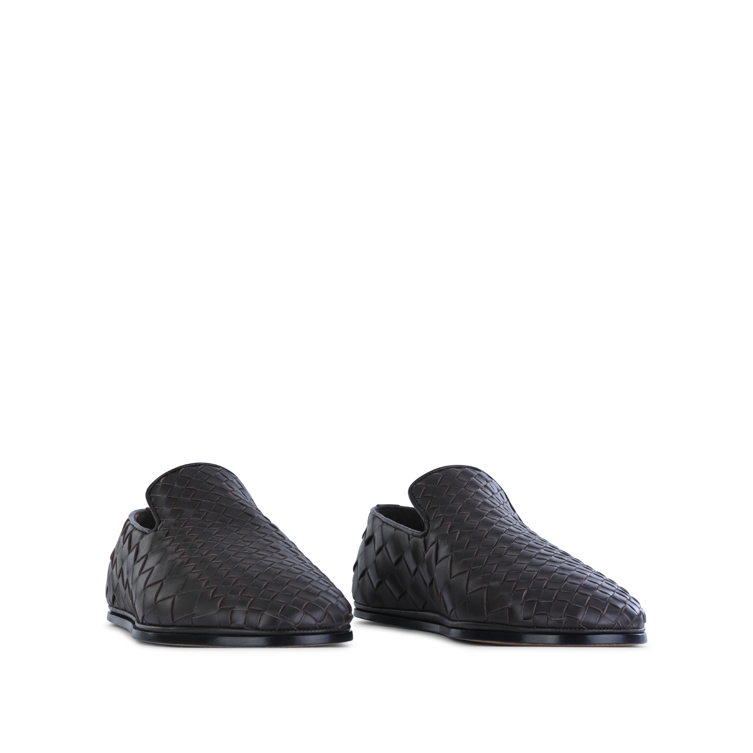 Black leather flats from Bottega Veneta featuring round toe, slip-on style, all-over Intreccio motif and leather sole.