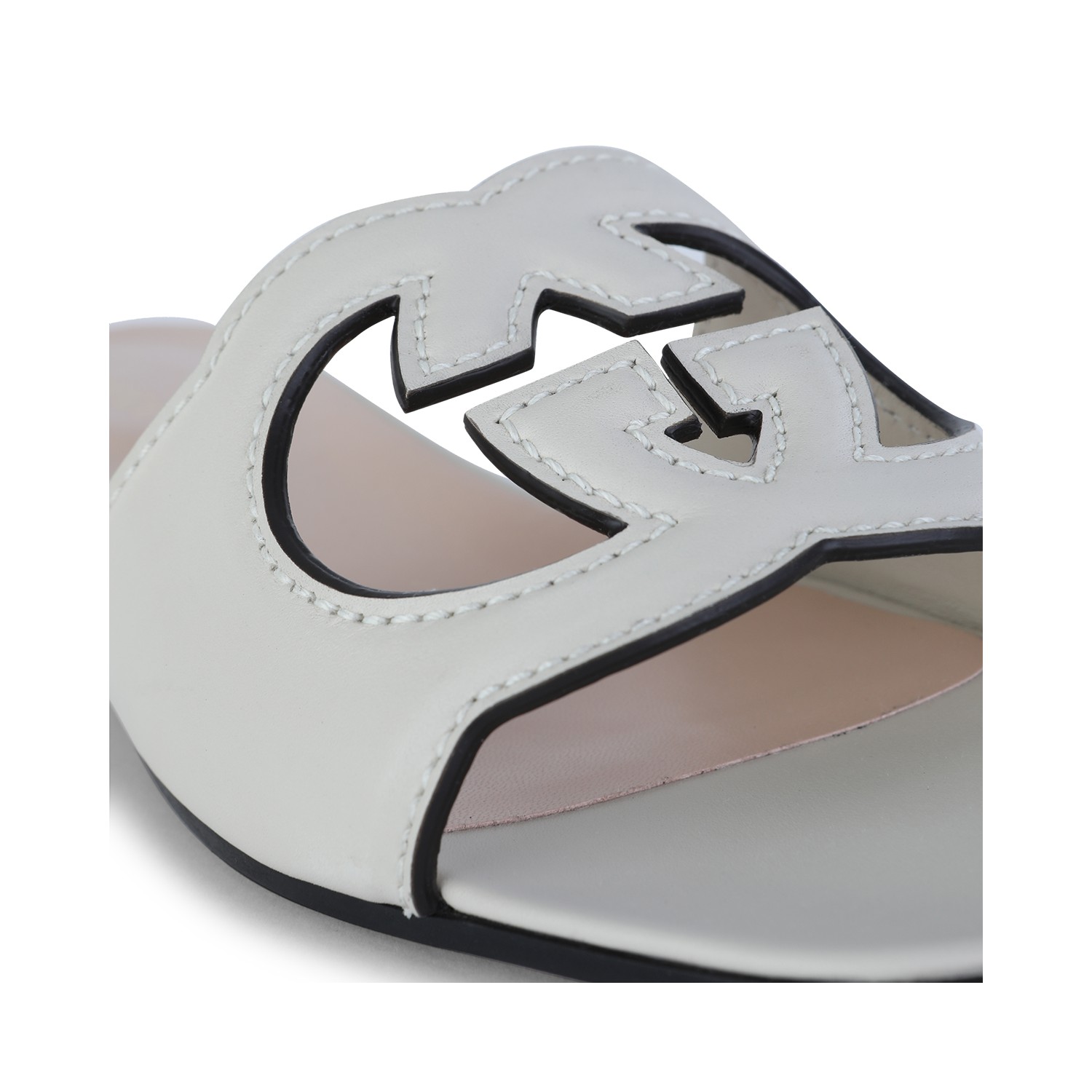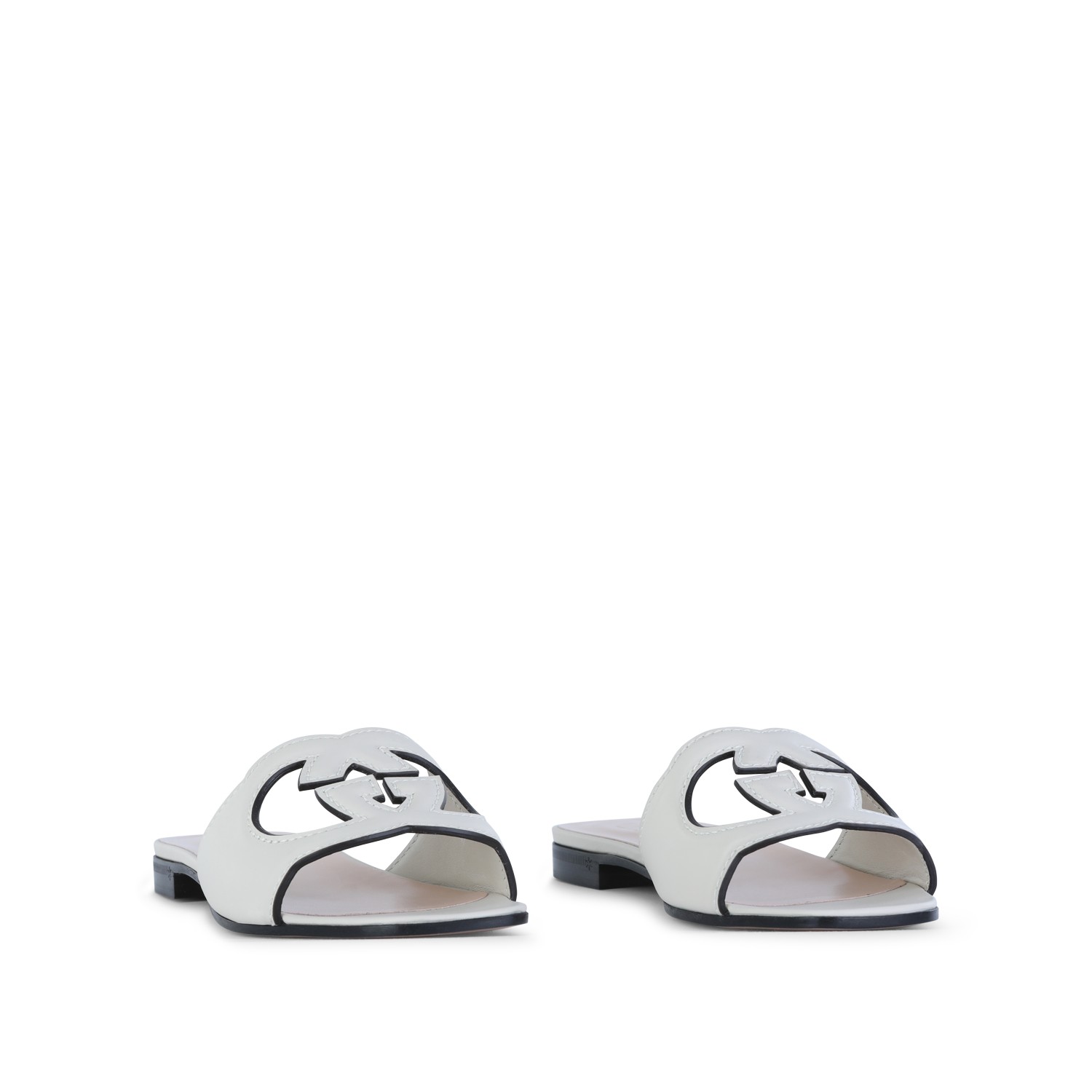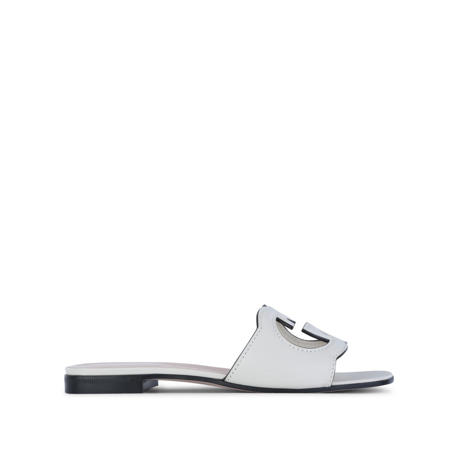 White leather flats from Gucci featuring square open toe, open back, leather sole and frontal logo.
