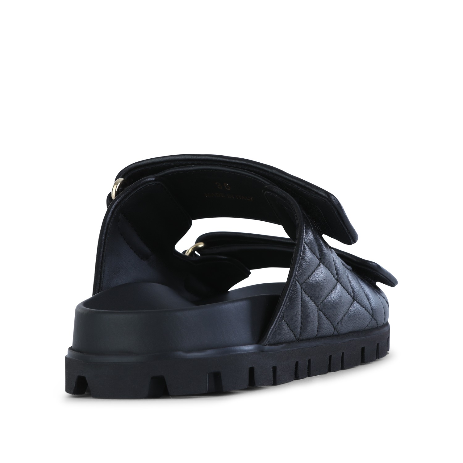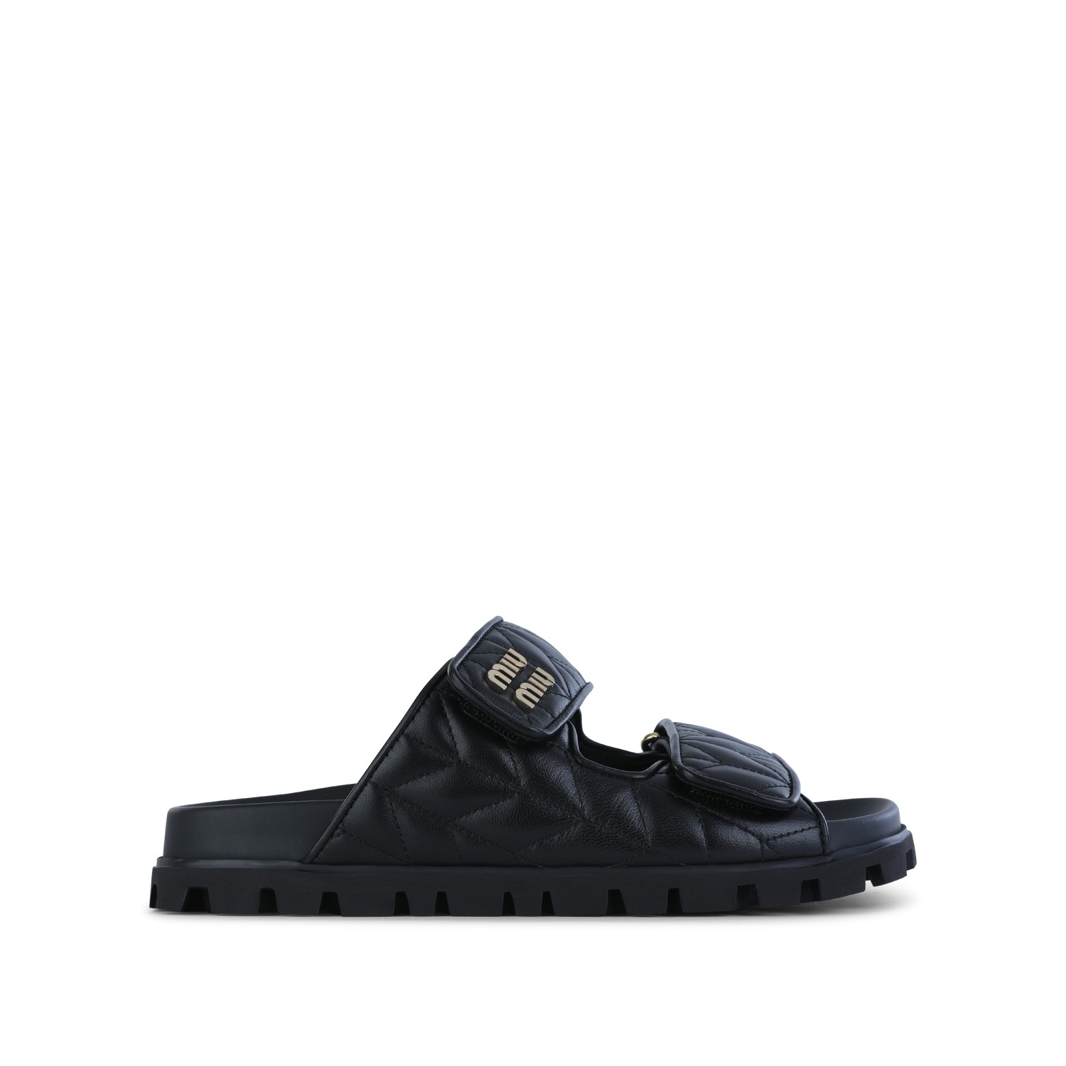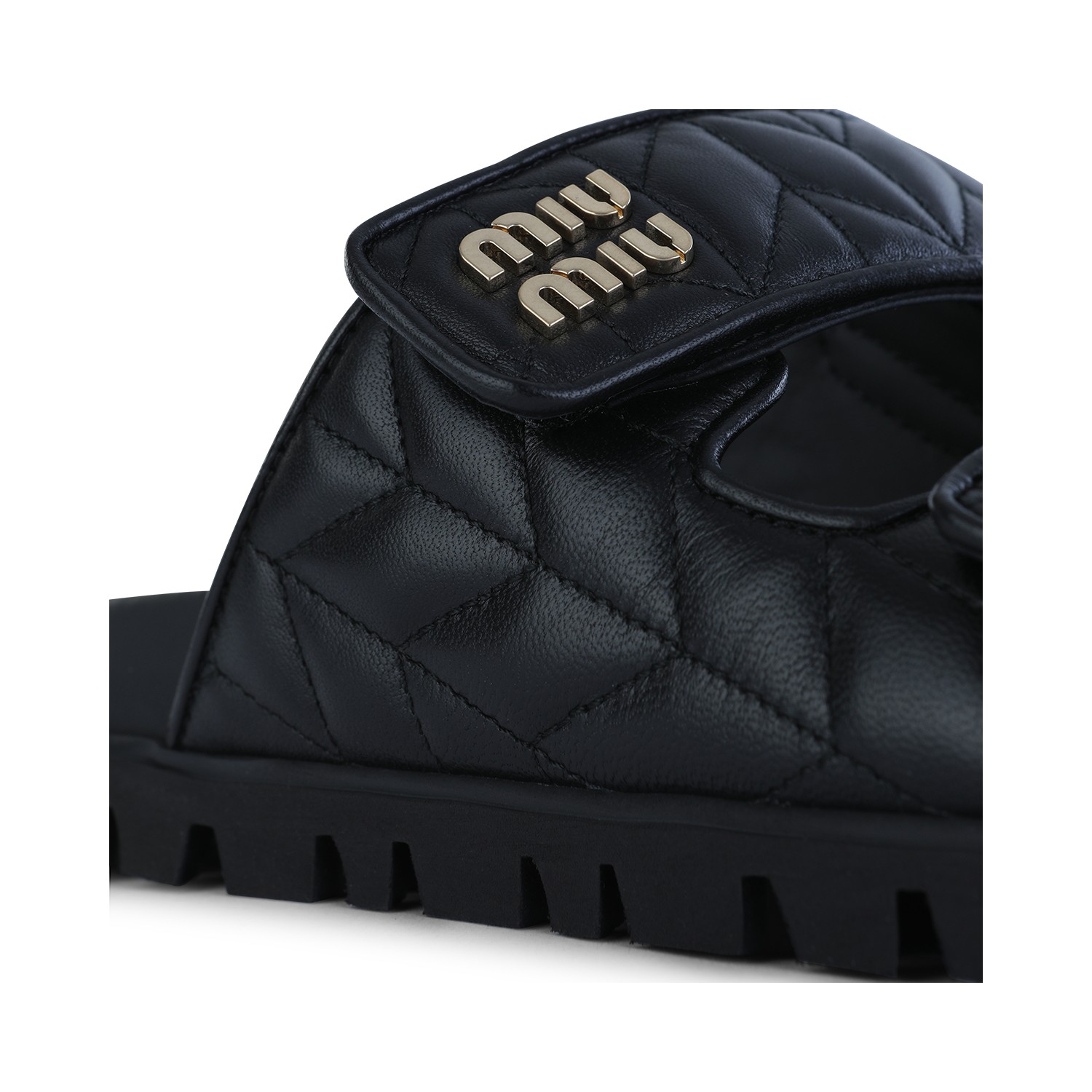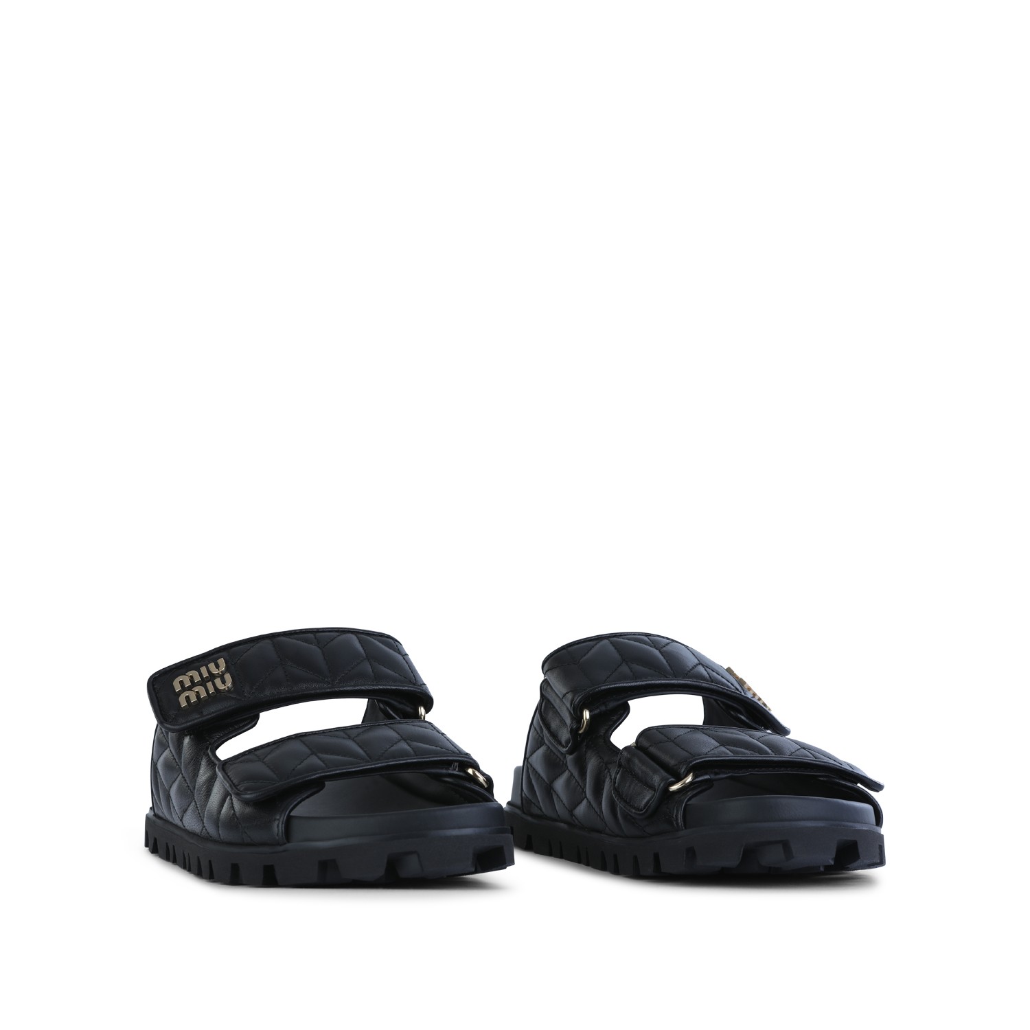 Black leather flats from Miu Miu featuring open toe, double velcro straps, logo details, rubber sole and flat line.