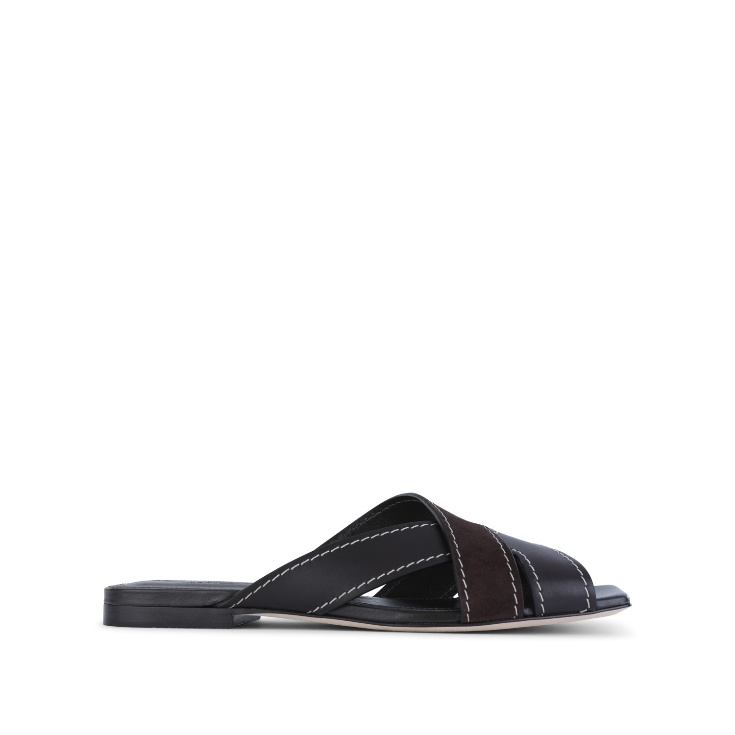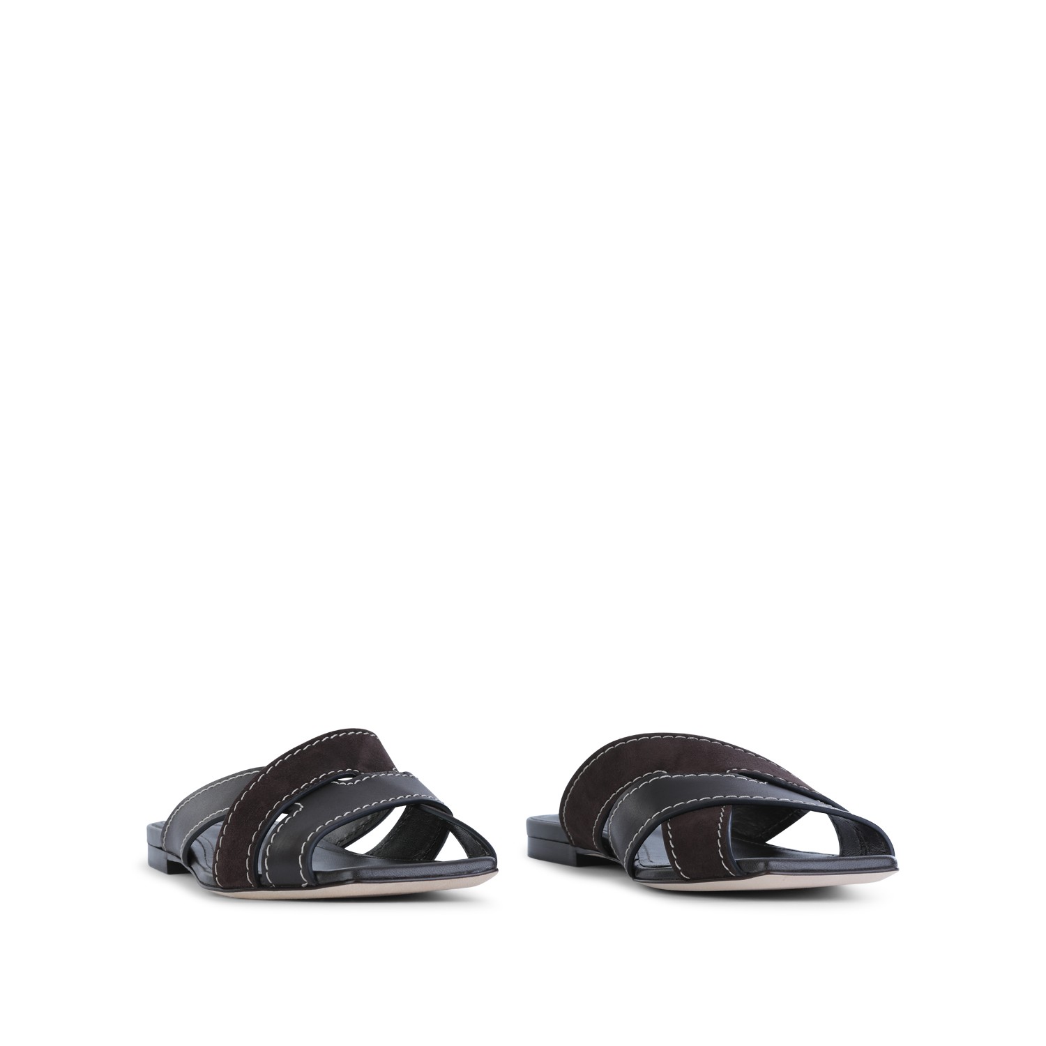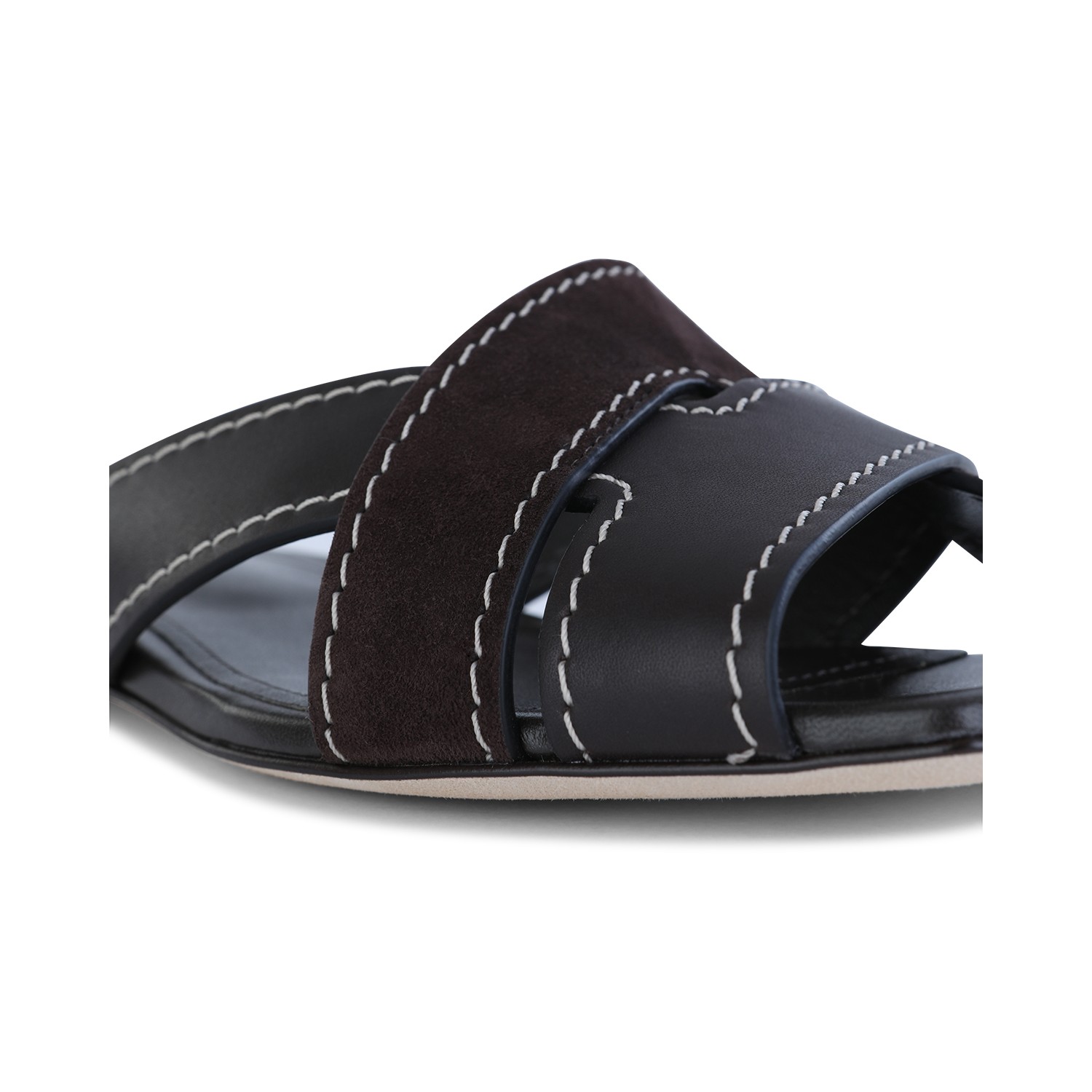 Dark brown leather flats from Tod's featuring square open toe, straps in leather and suede, contrasting stitchings, slip-on style, open back and leather sole.