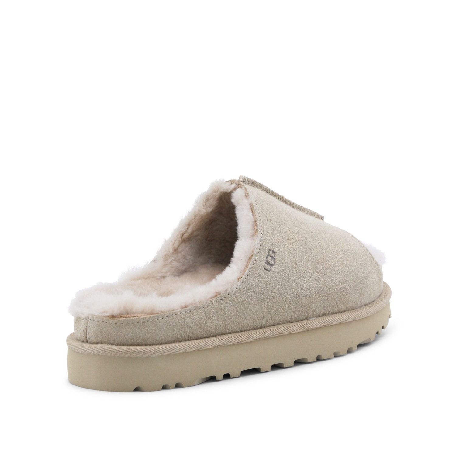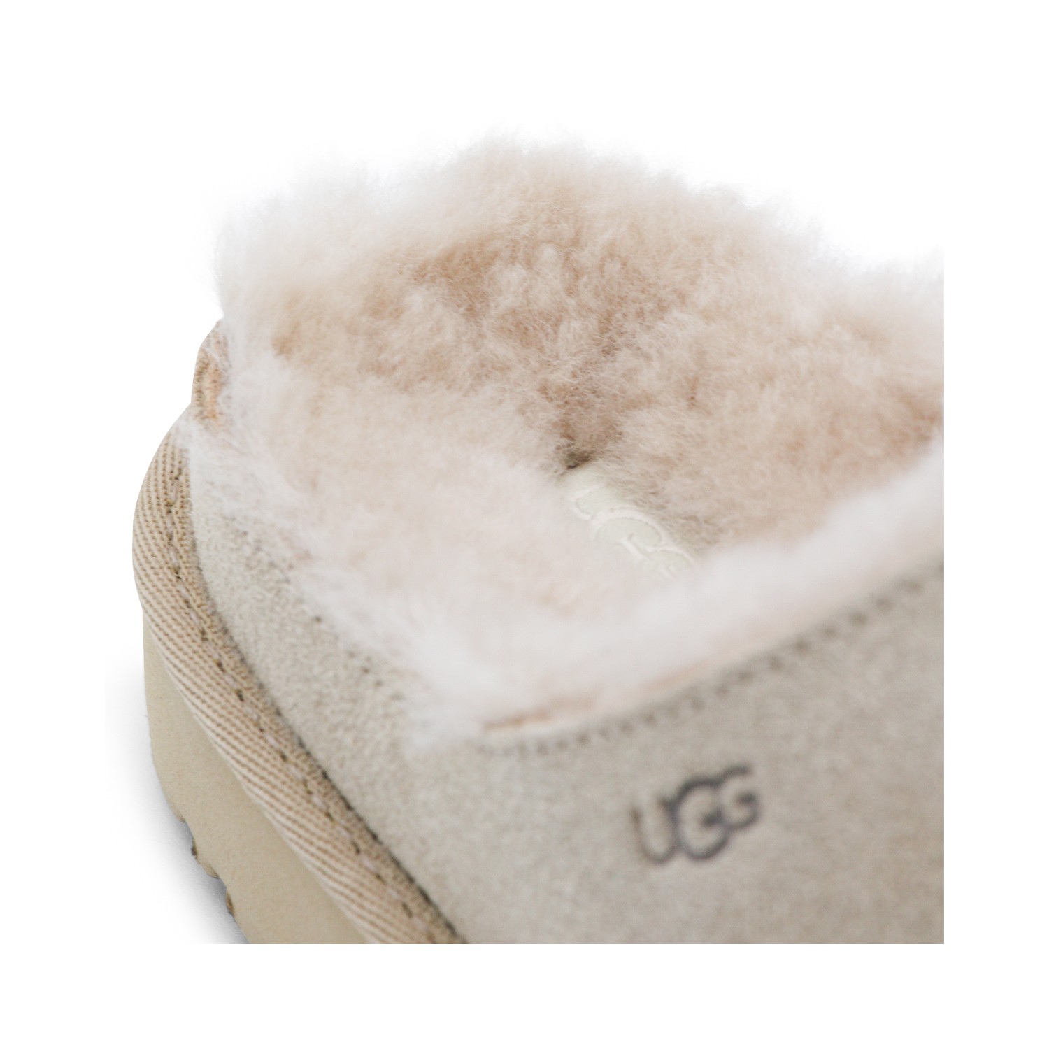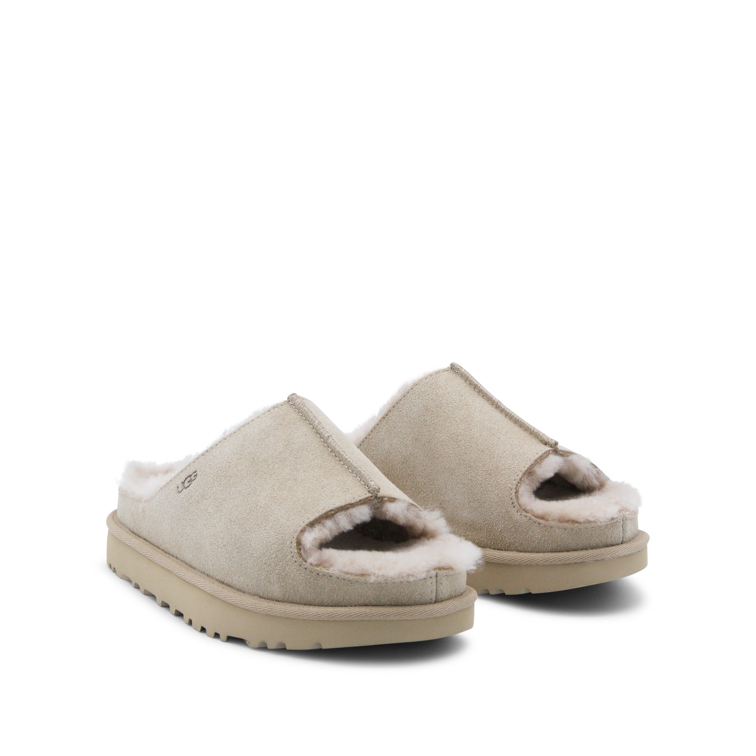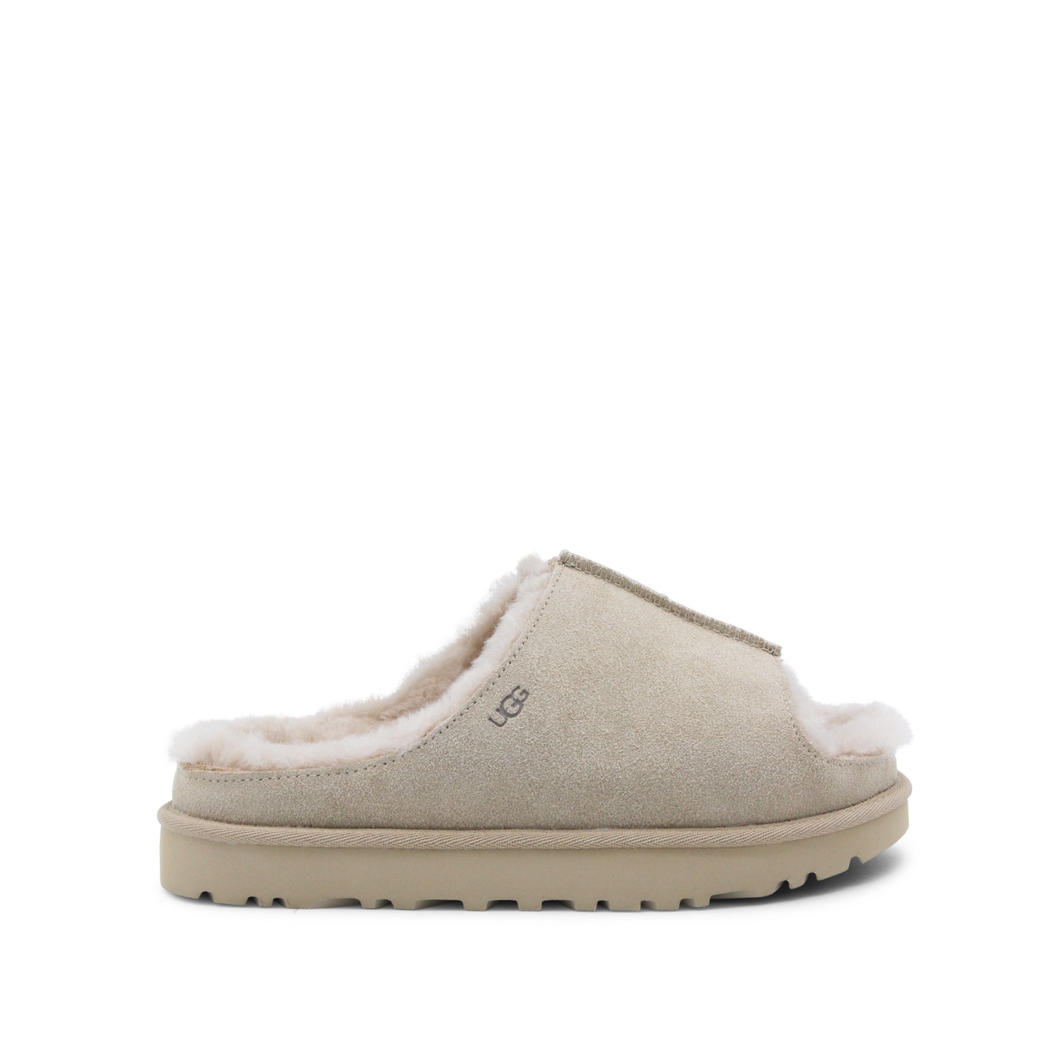 Sand leather flats from Ugg featuring round open toe, open back, lateral logo, inside hair and leather sole.