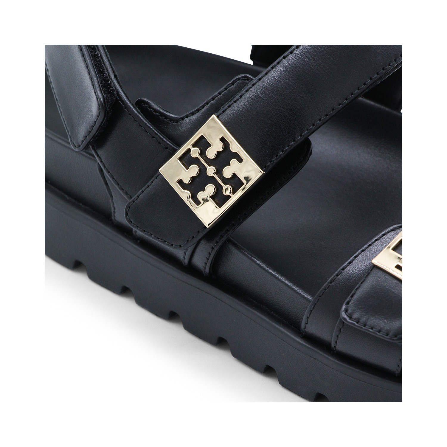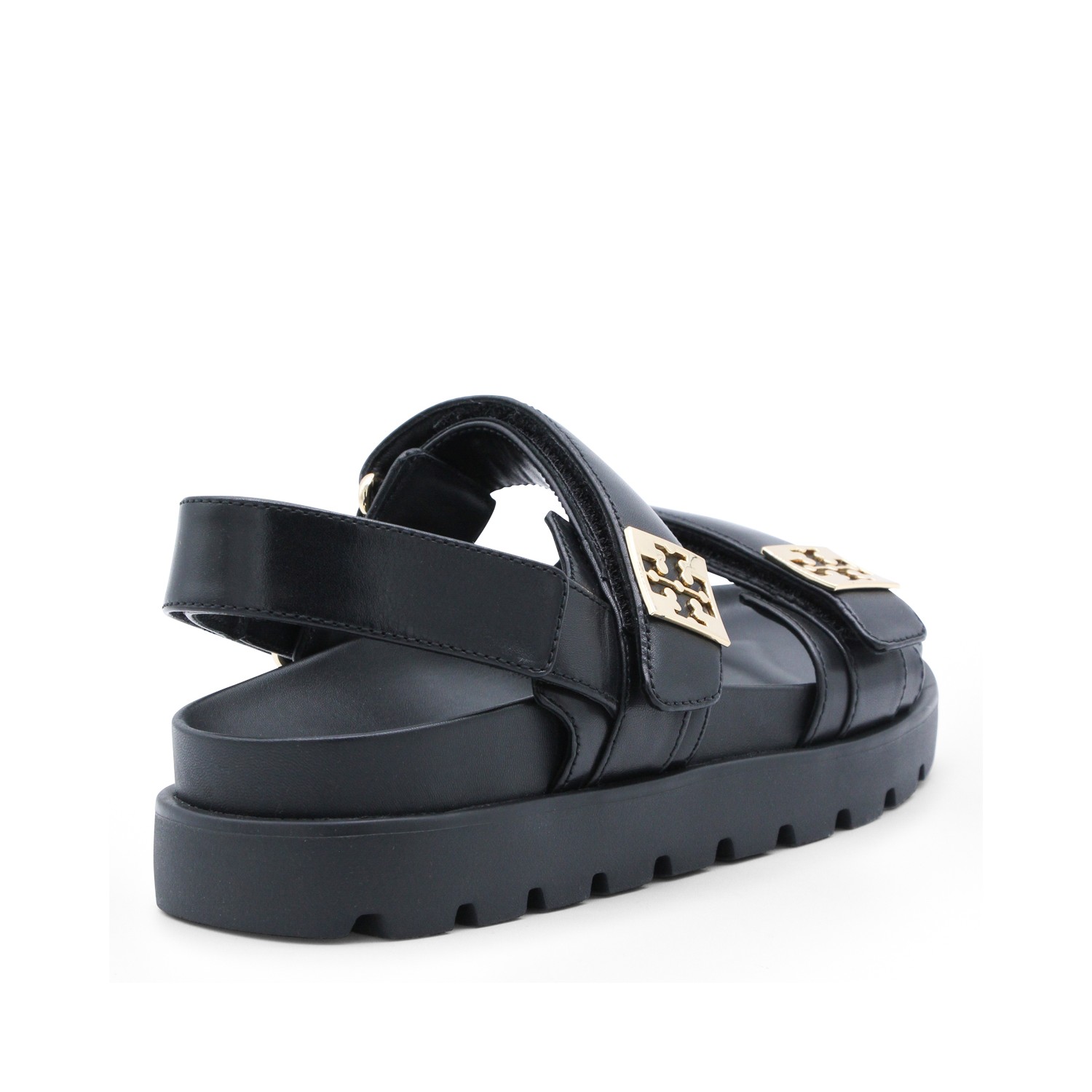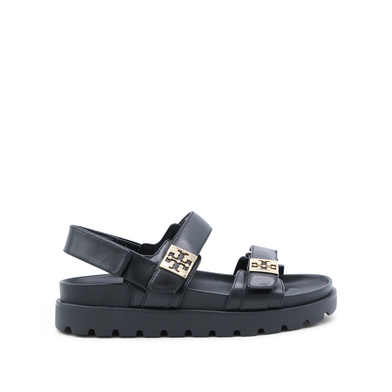 Black leather flats from Tory Burch featuring round open toe, gold tone logo details, buckles, branded insole and rubber sole.