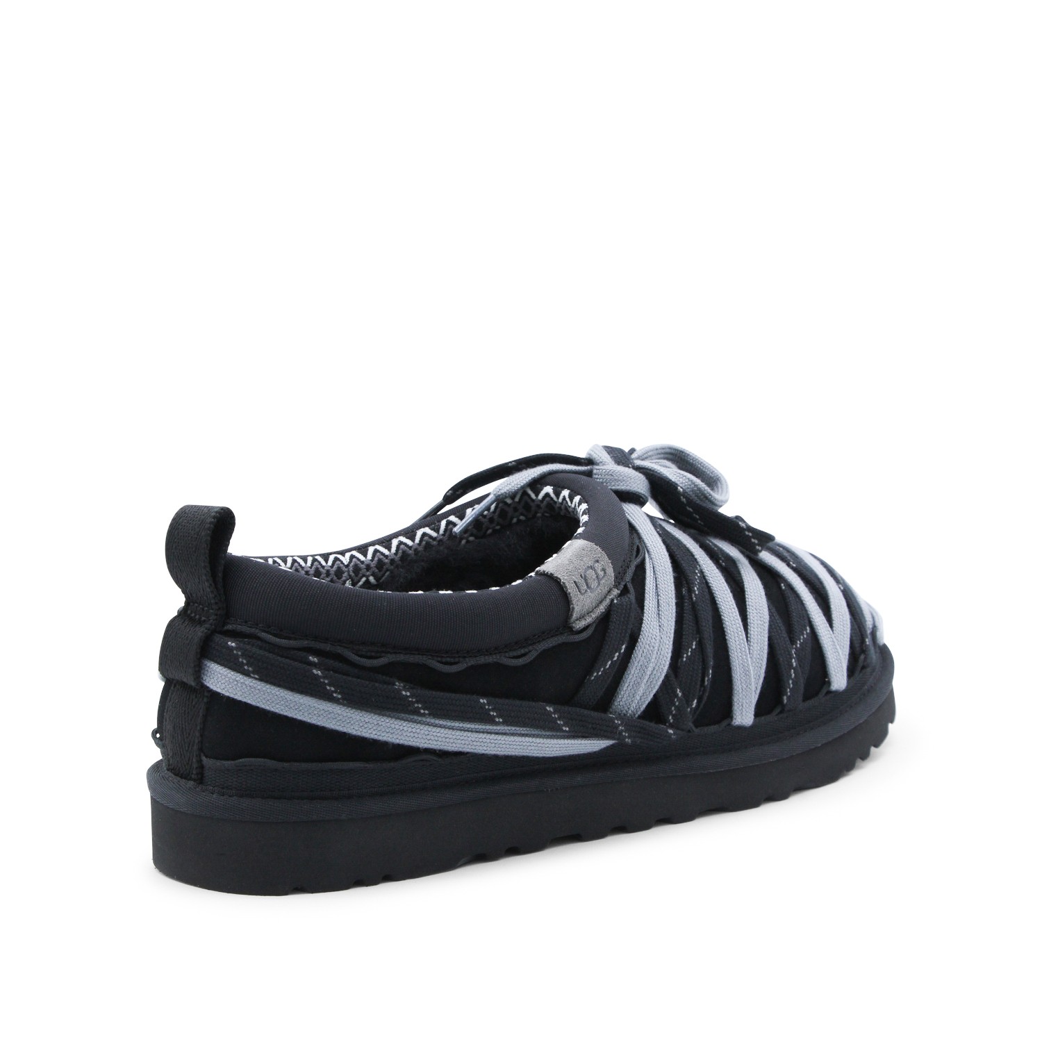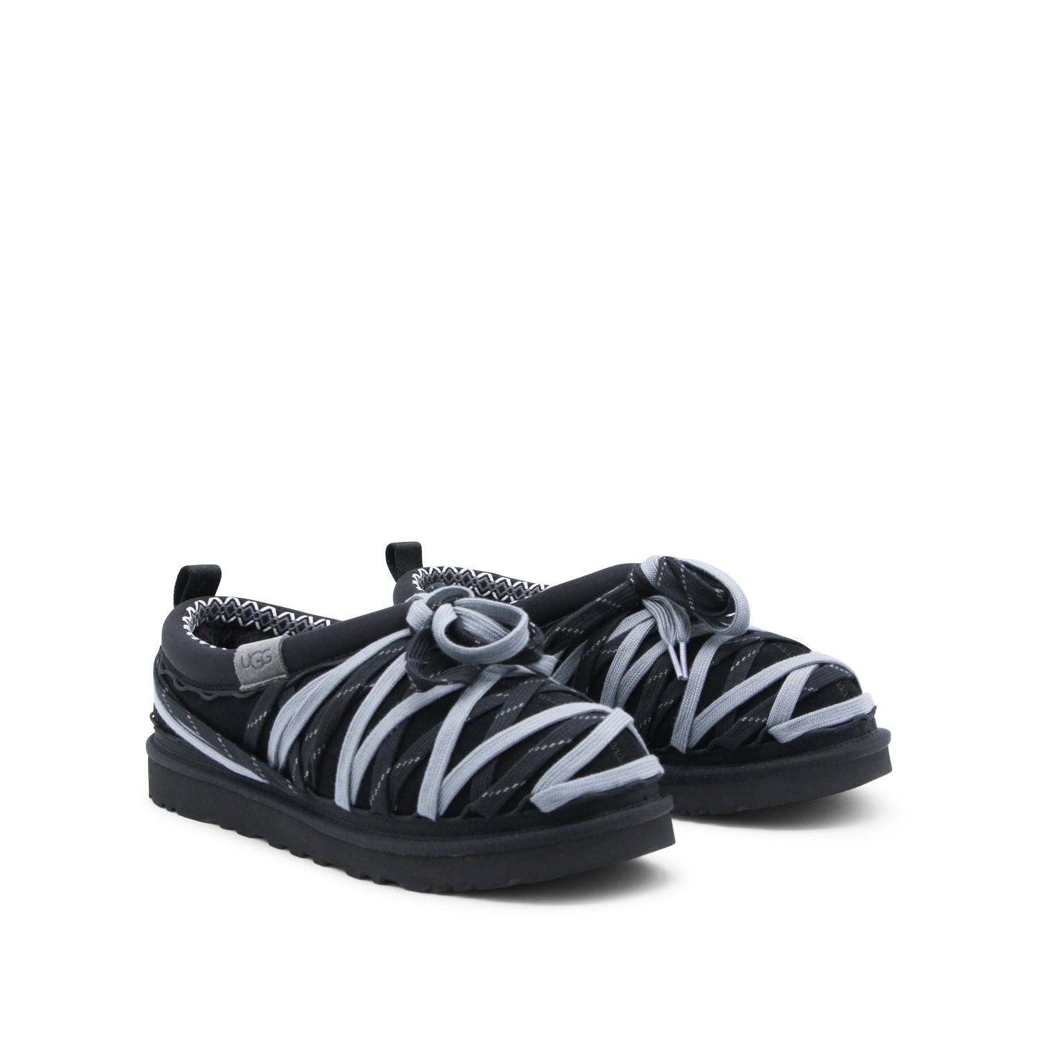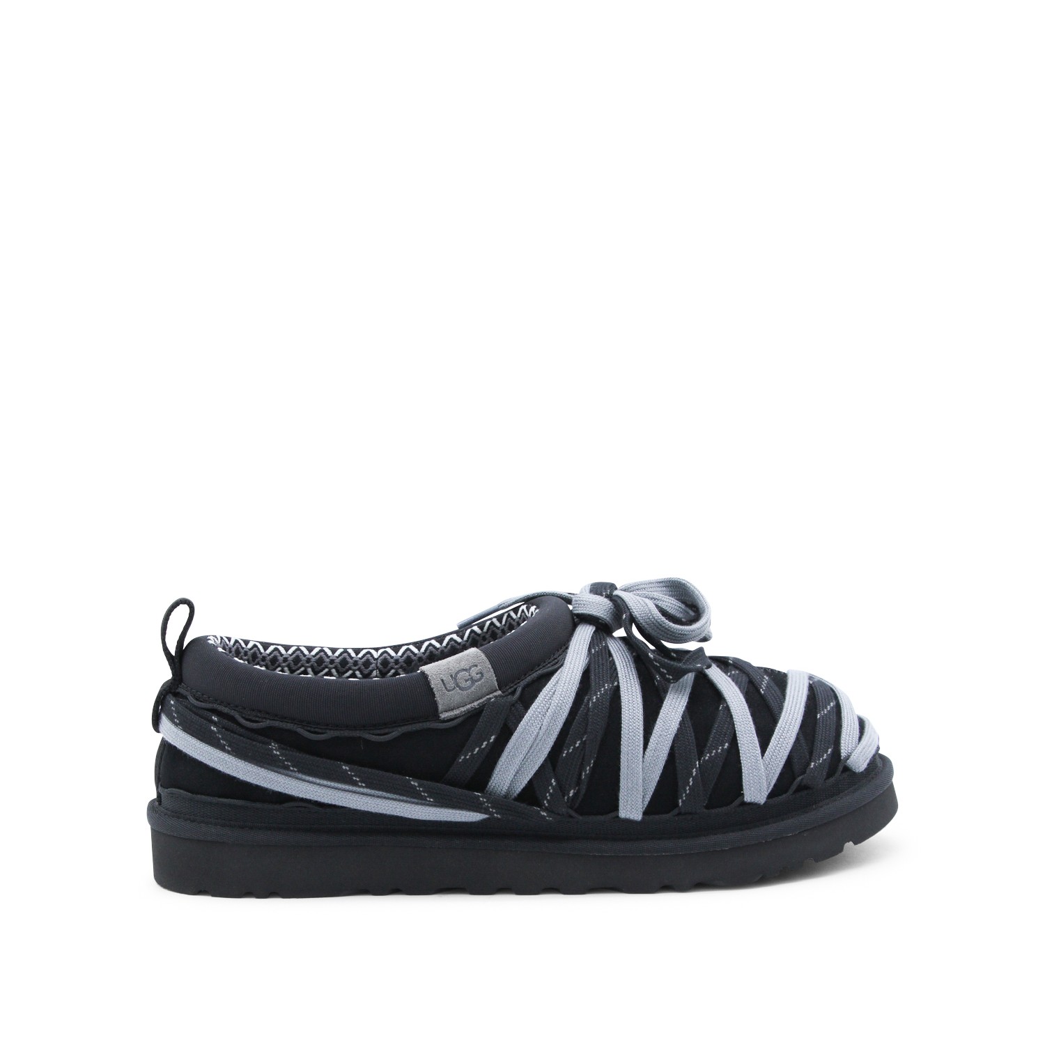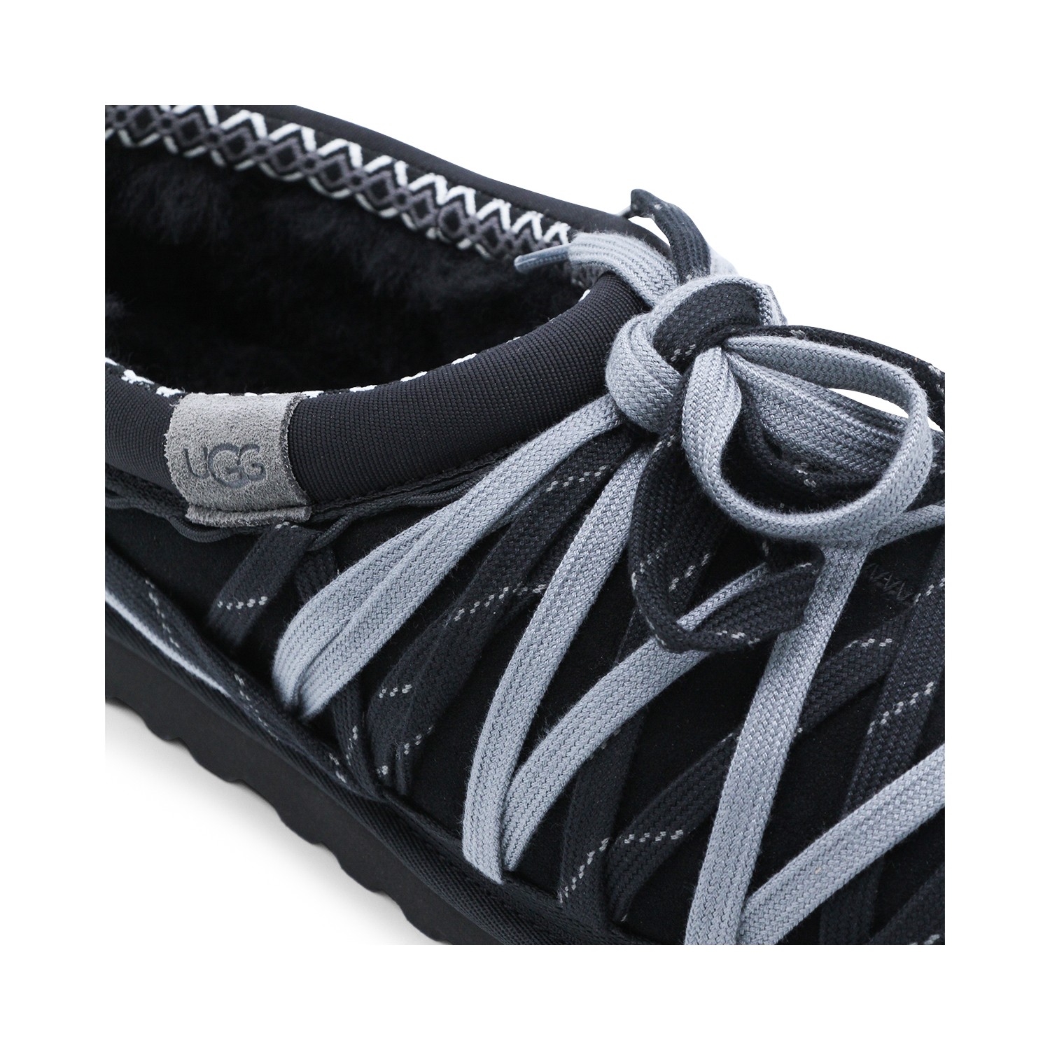Black leather Tasman Laces flats from Ugg featuring round toe, slip-on style, logo patch, laces detail and rubber sole.