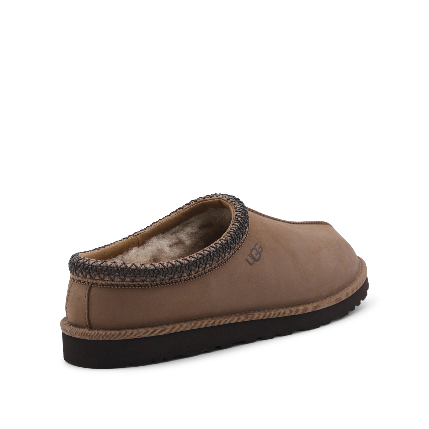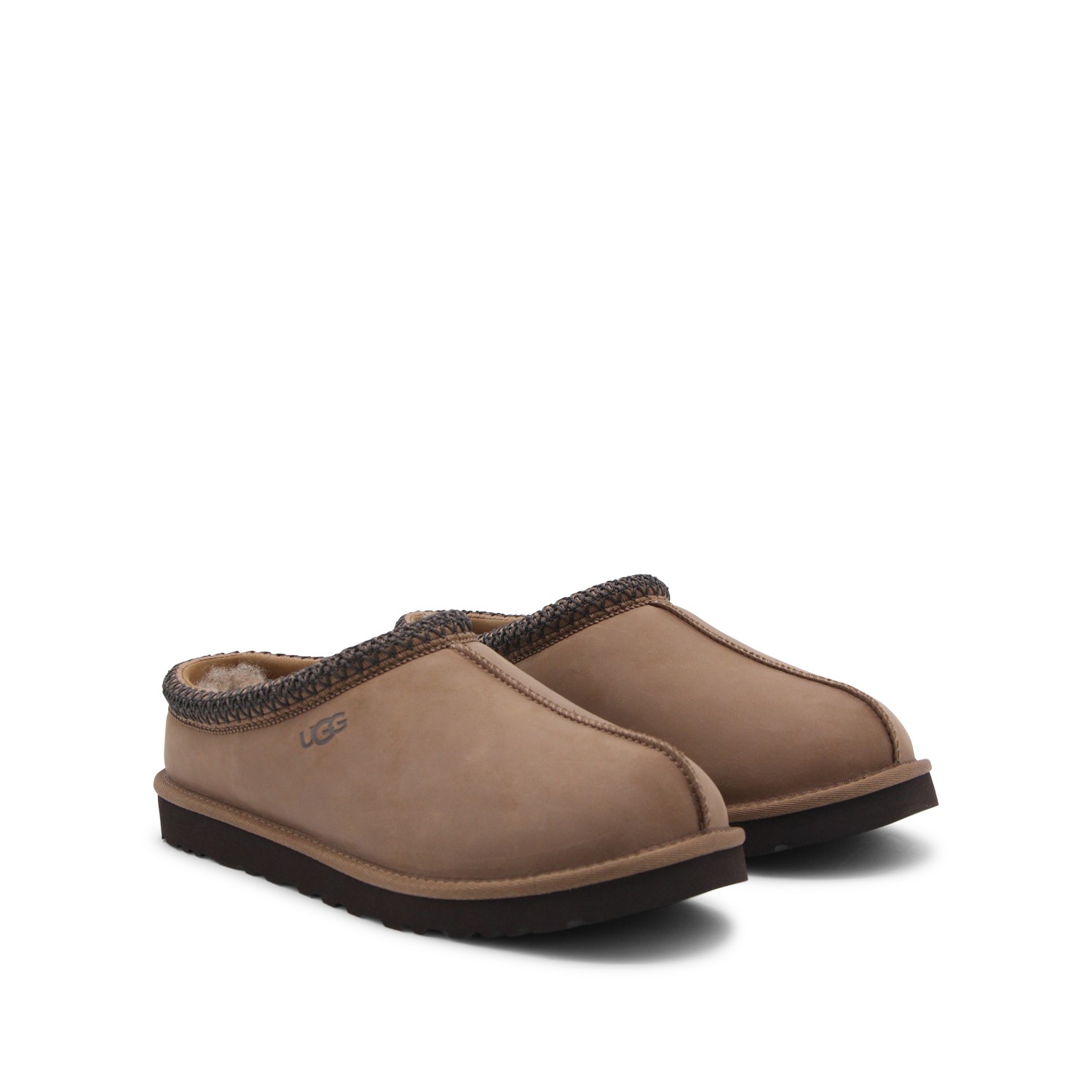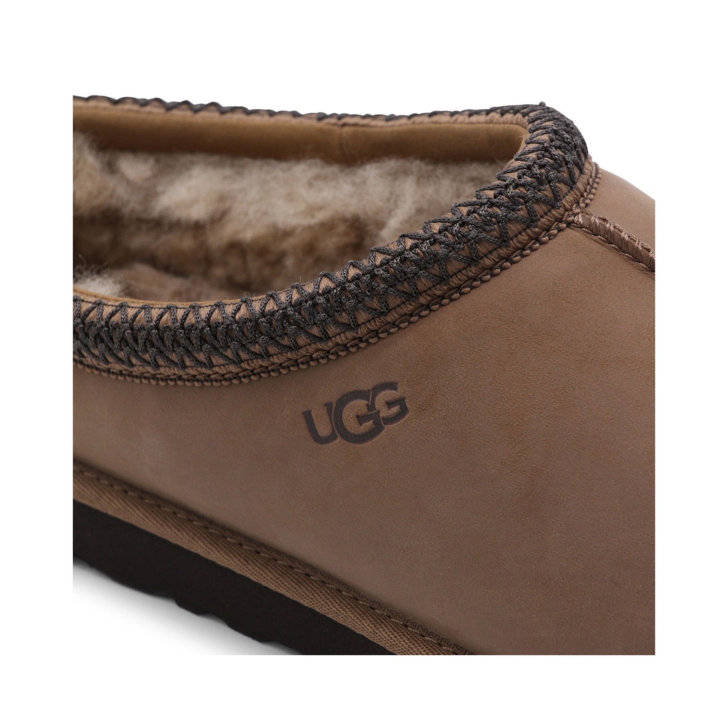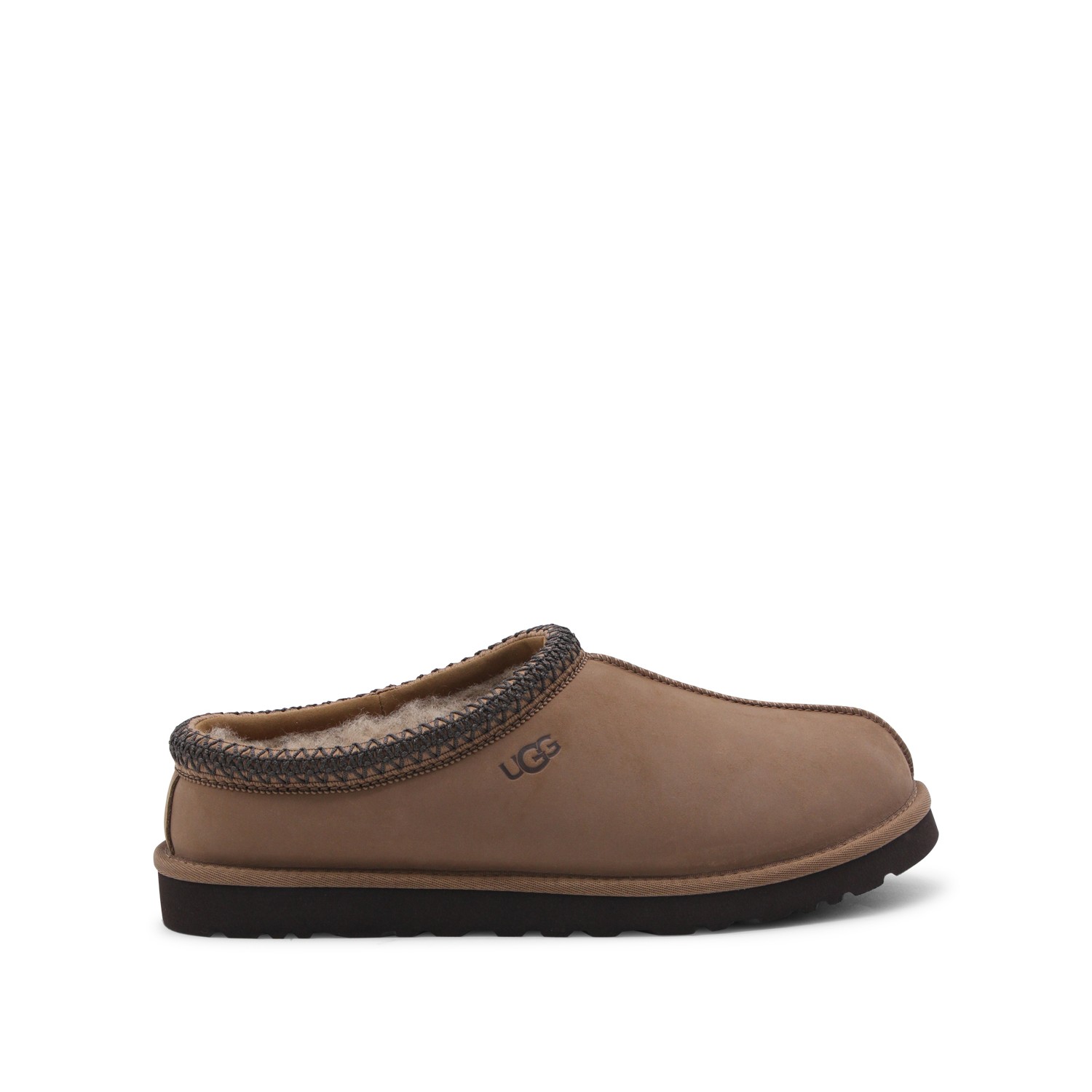 Brown Tasman II flats from UGG featuring round toe, slip-on style, flat line, rubber sole and embossed logo at side.