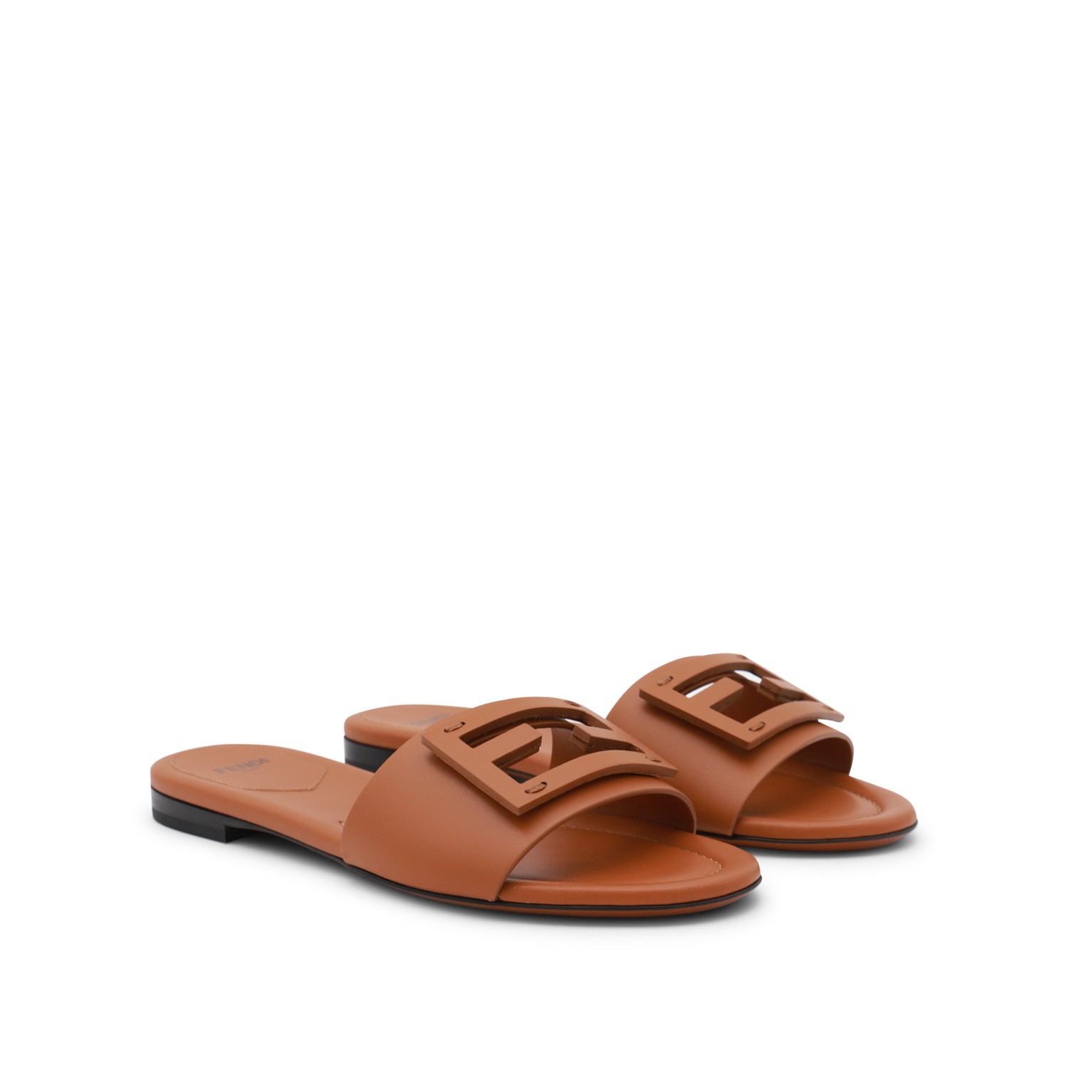 Brown leather flats from Fendi featuring round toe, frontal black tone logo embellishment, open back and leather sole.