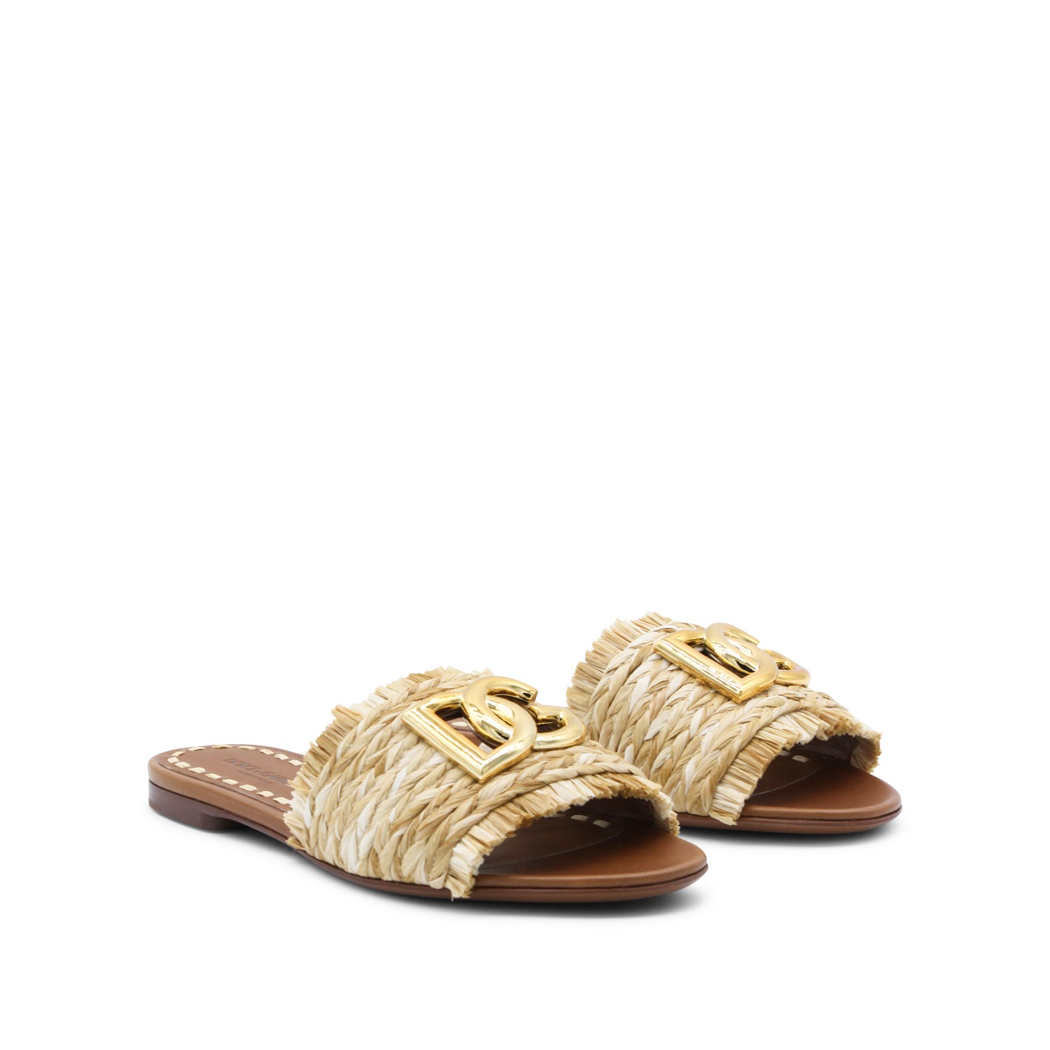 Beige leather flats from Dolce&Gabbana featuring round open toe, open back, raffia and logo.