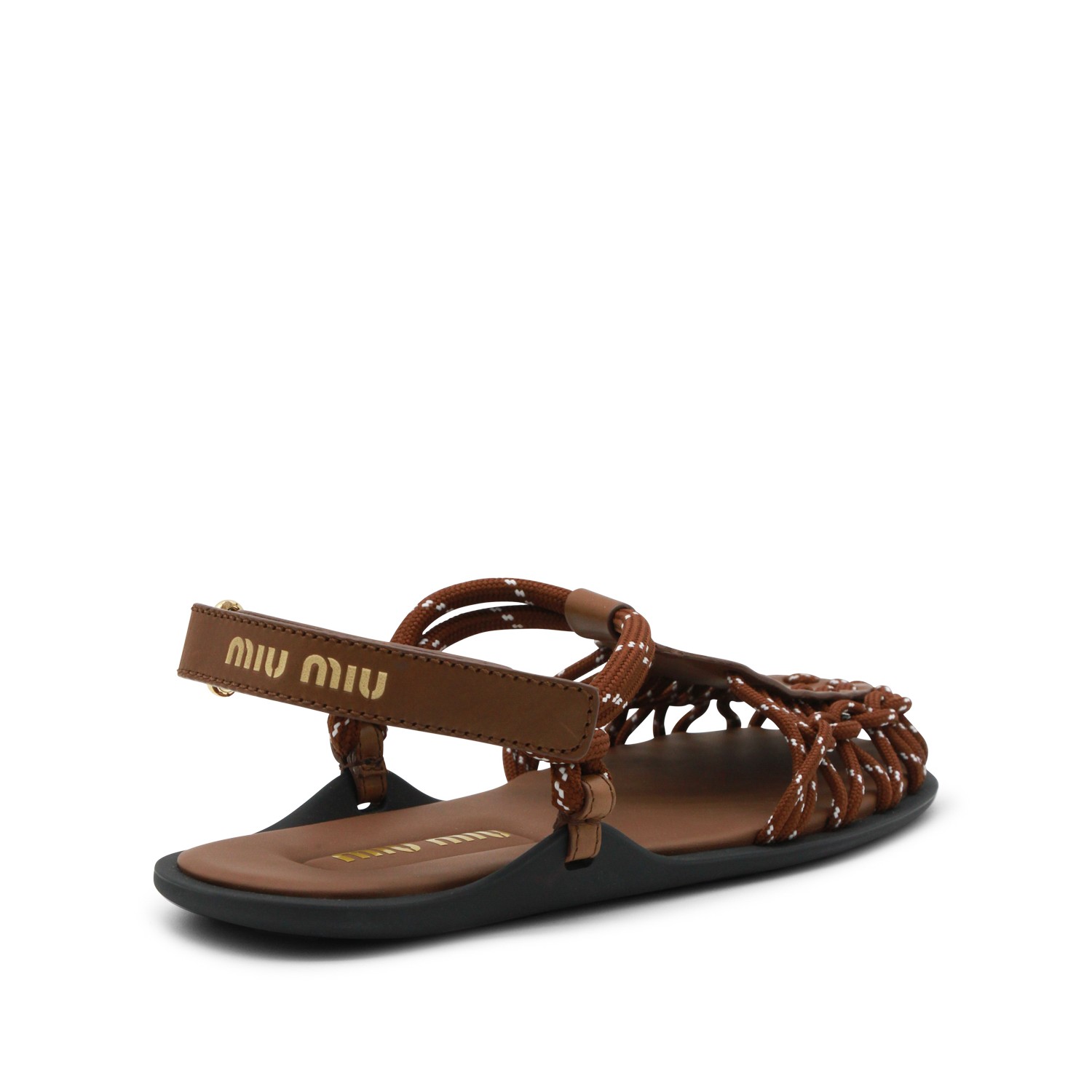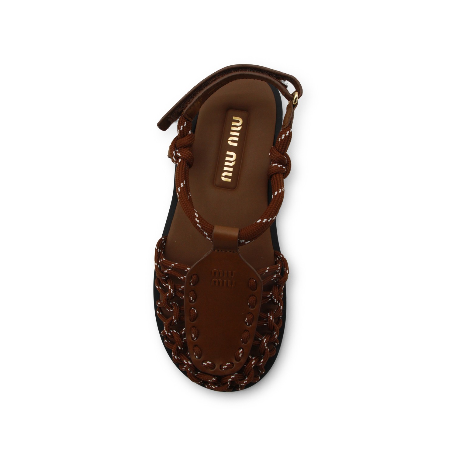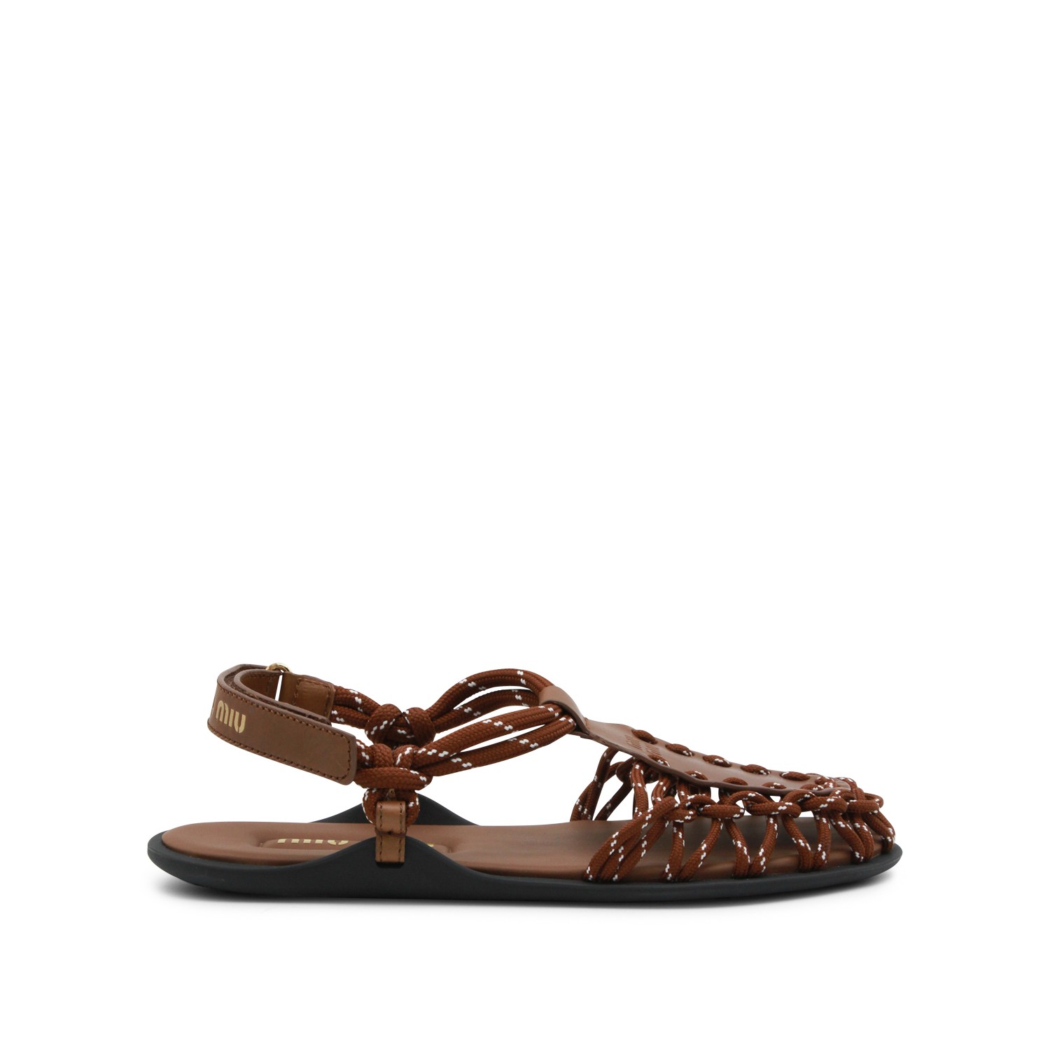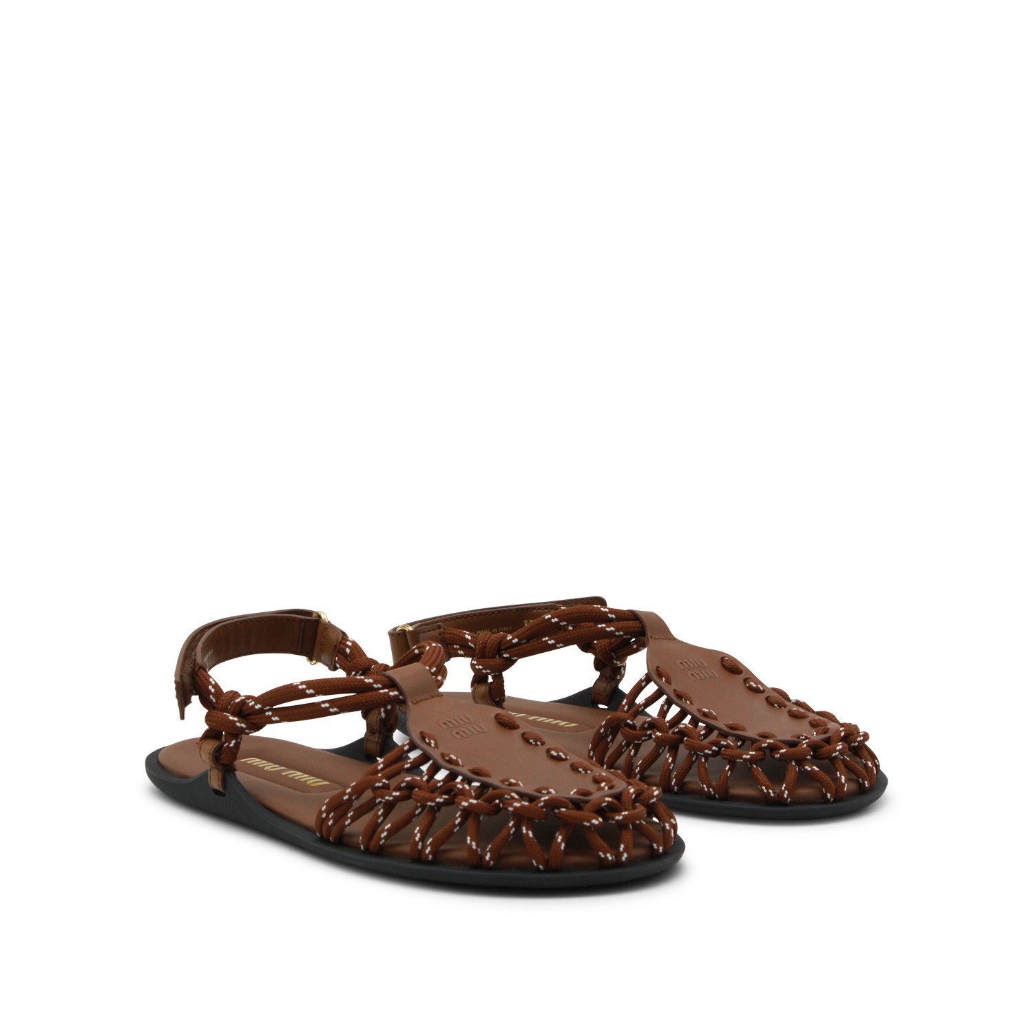 Brown leather flats from Miu Miu featuring crochet texture, flat line, logo, branded insole and rubber sole.