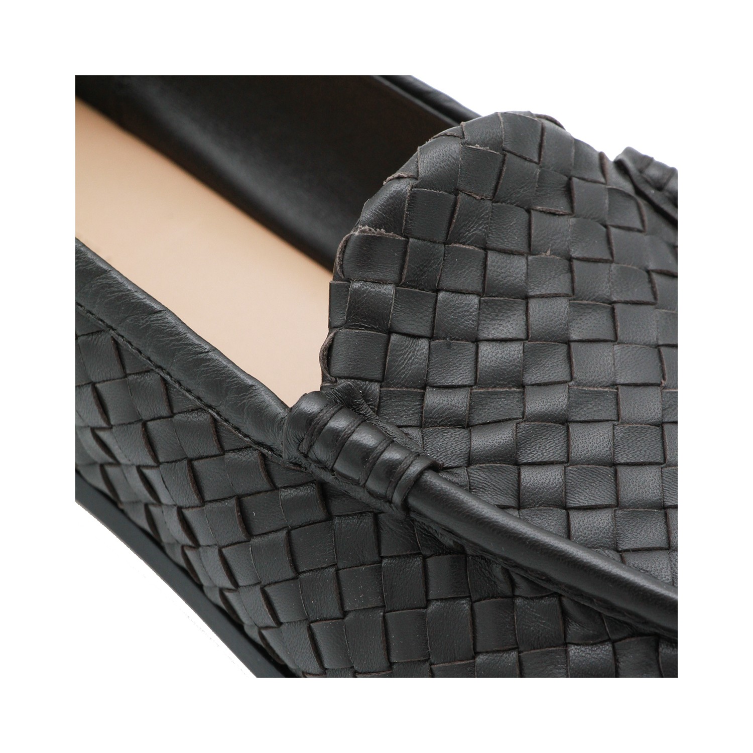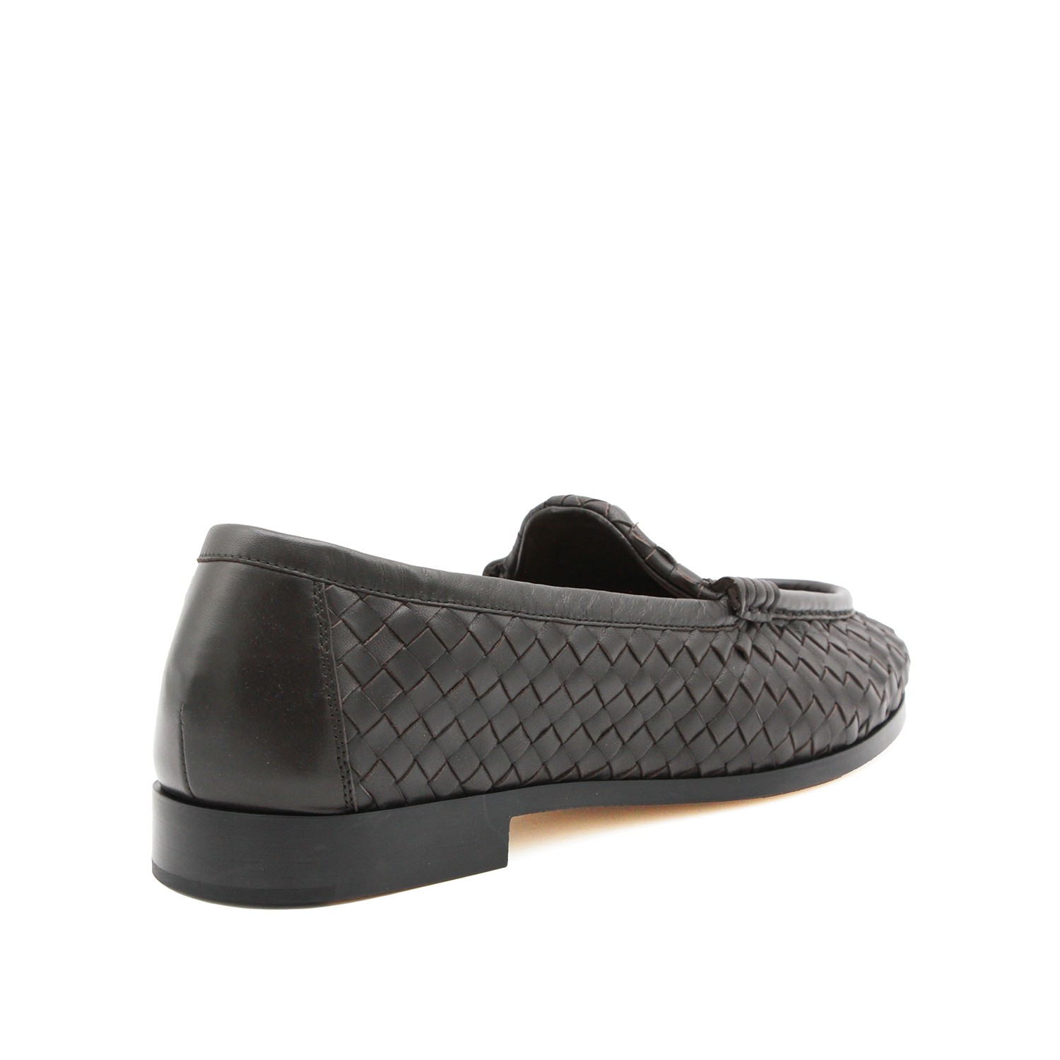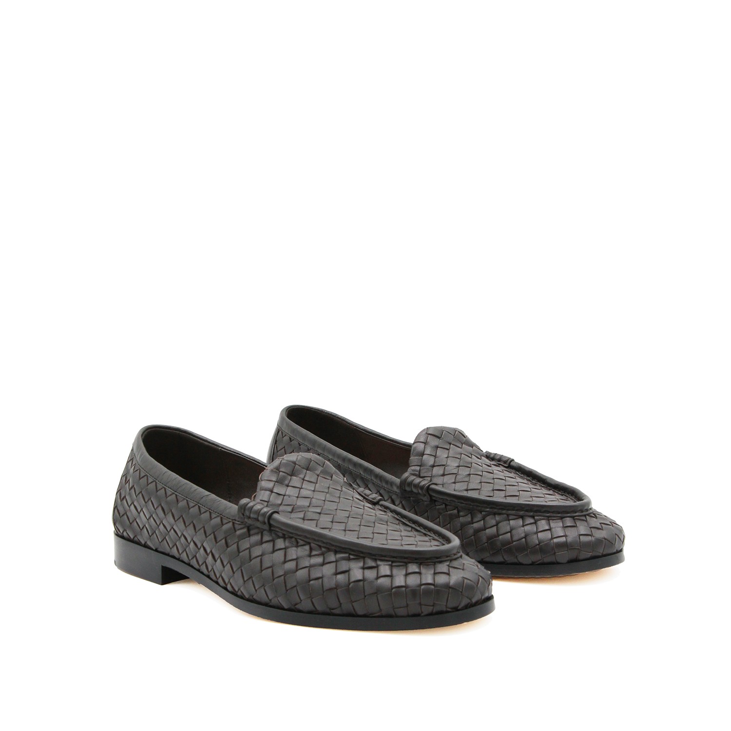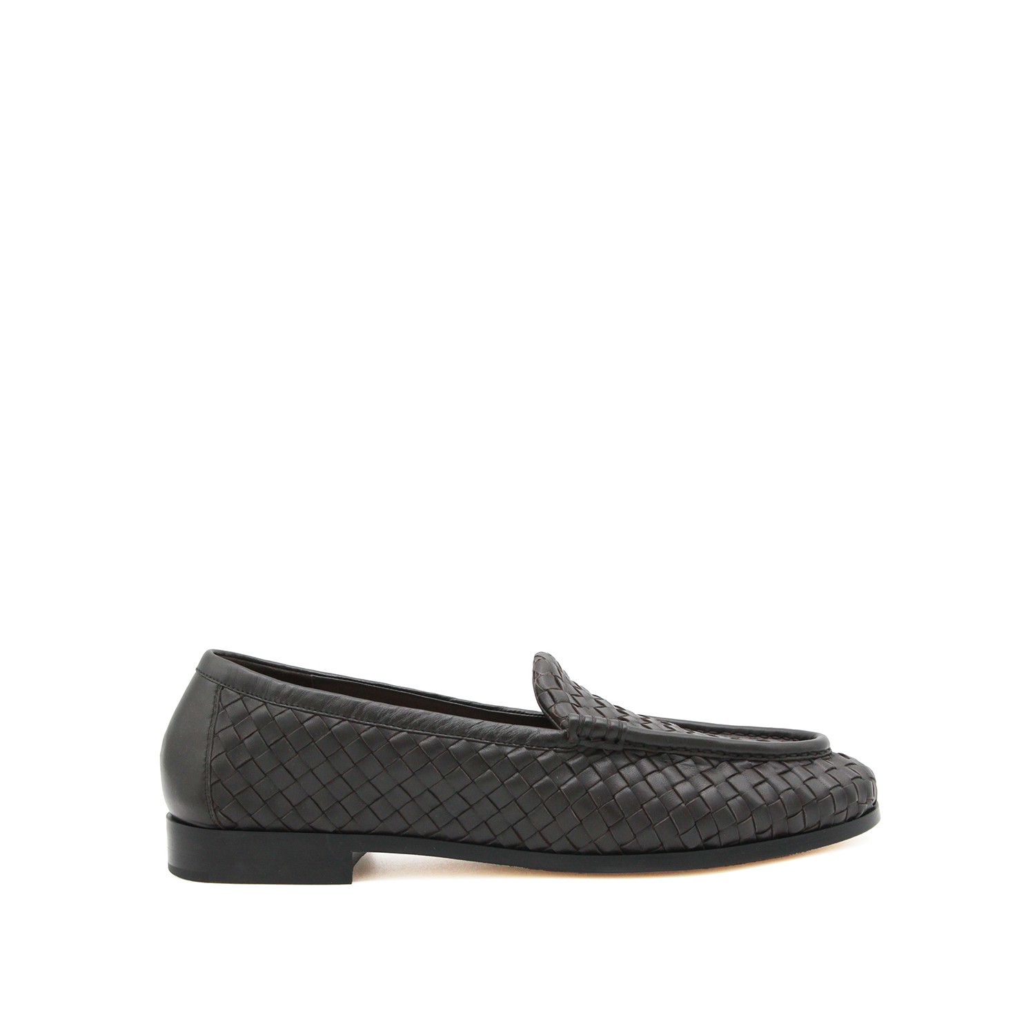 Dark brown leather flats from Bottega Veneta featuring round toe, slip-on style, all-over Intreccio motif, branded insole and rubber sole.