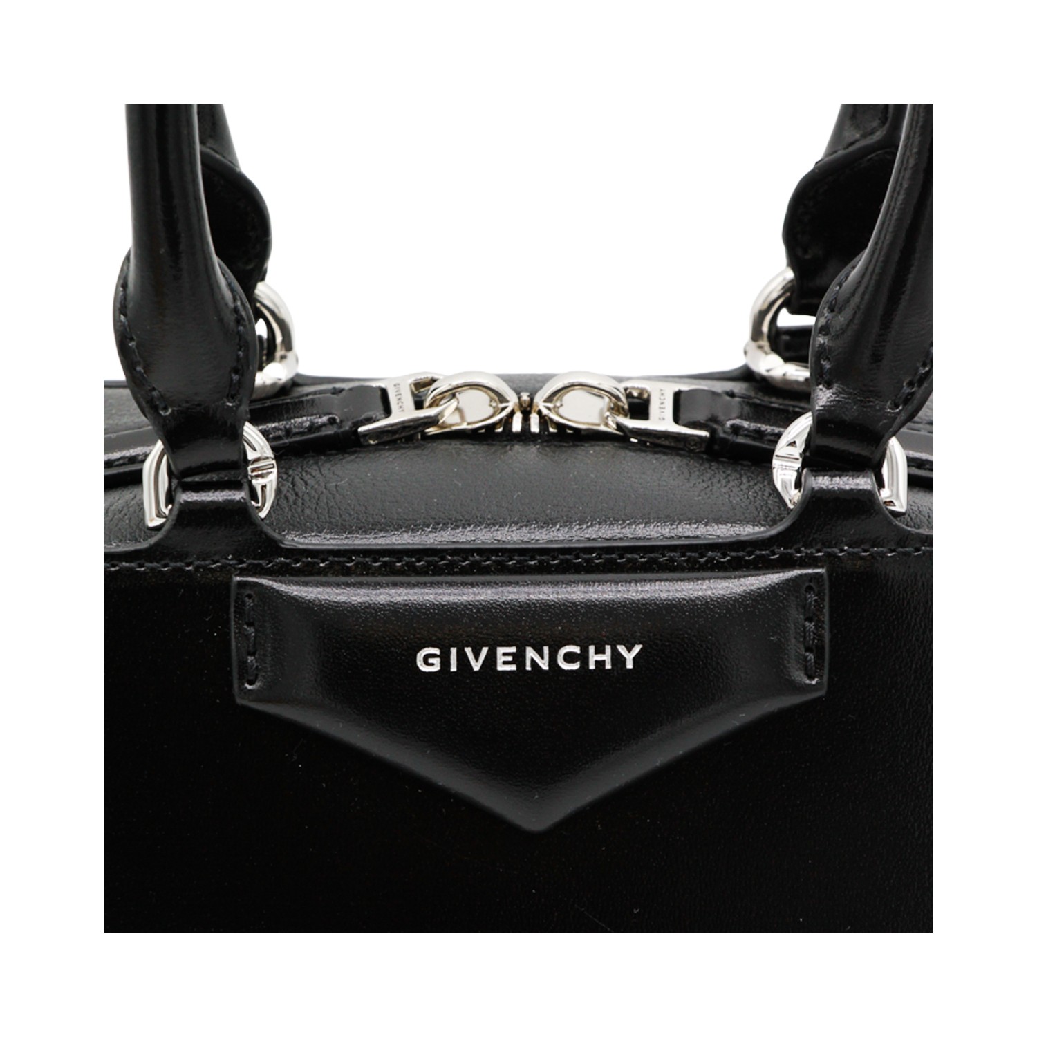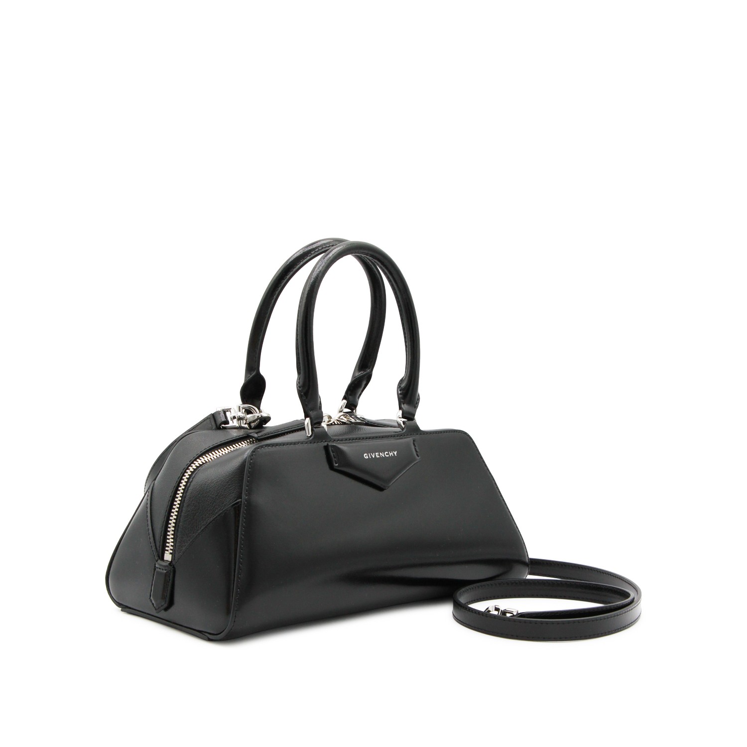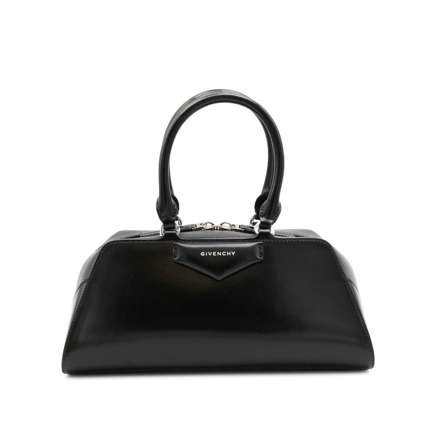 Black leather Antigona East-West top handle bag from Givenchy featuring top handle, adjustable and removable shoulder strap, double zip fastening and main compartment.