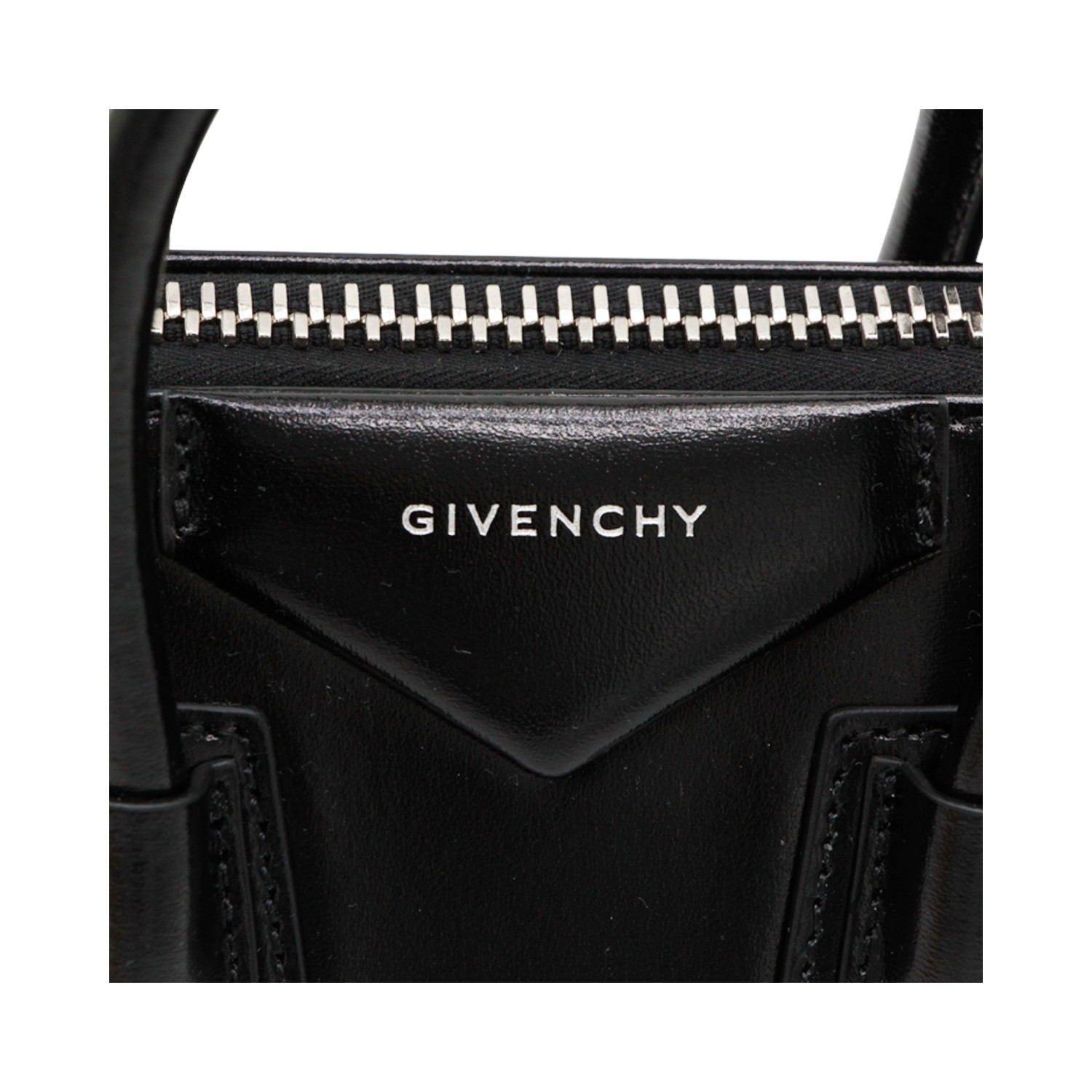 Black leather Antigona top handle bag from Givenchy featuring top handles, zip fastening, inside pocket and frontal logo.
