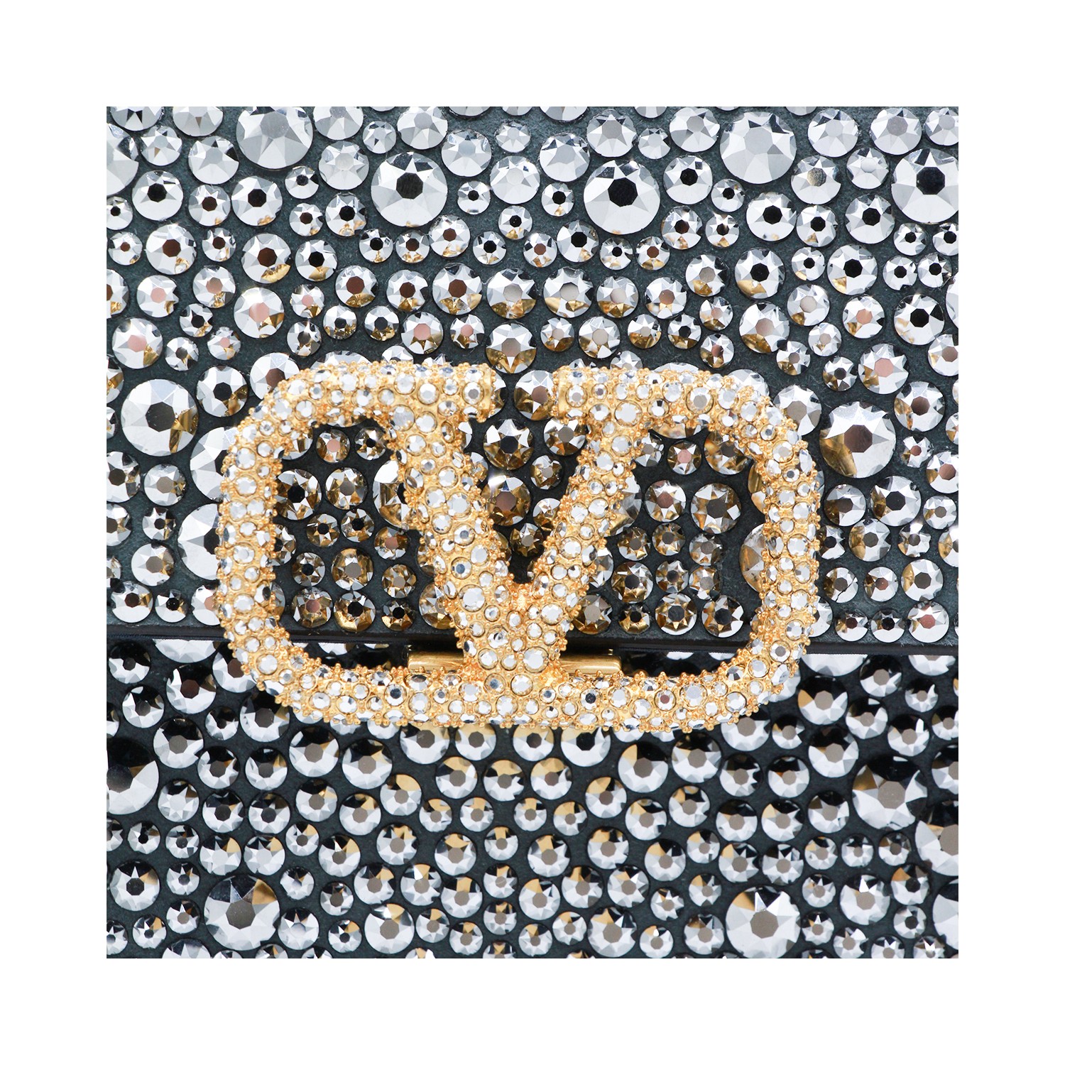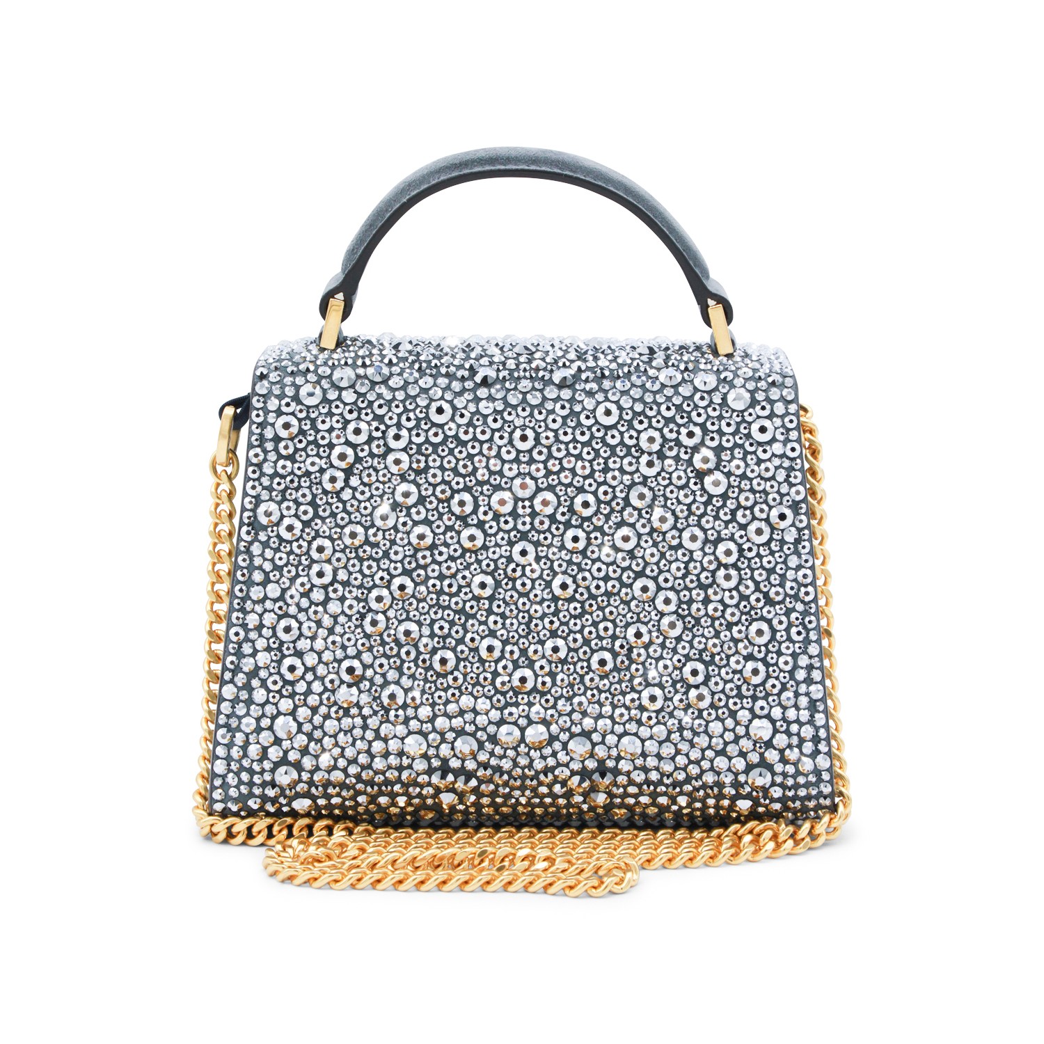 Crystal VSling small top handle bag from Valentino Garavani featuring suede, top handle, removable chain strap, crystal embellishments, gold tone hardware, magnetic closure, main compartment and internal pocket.