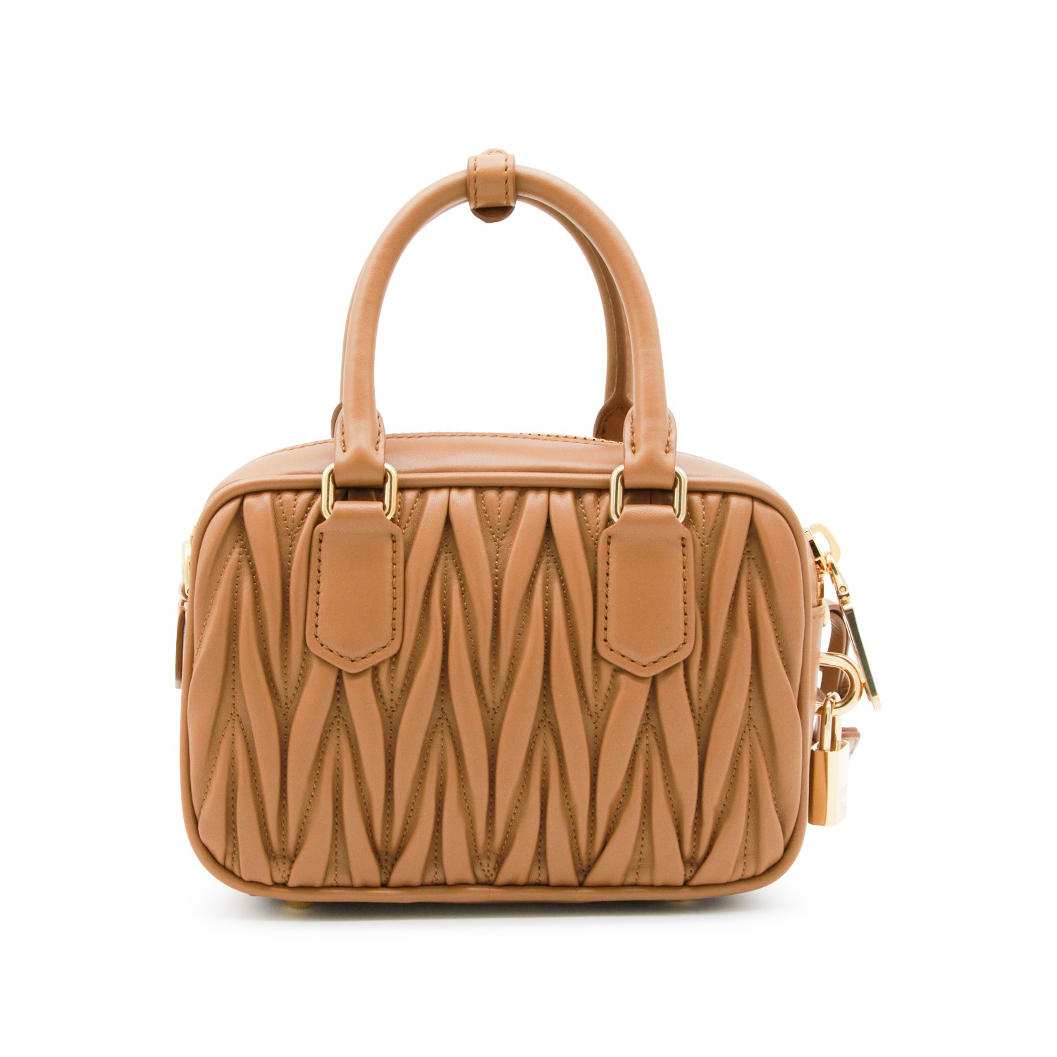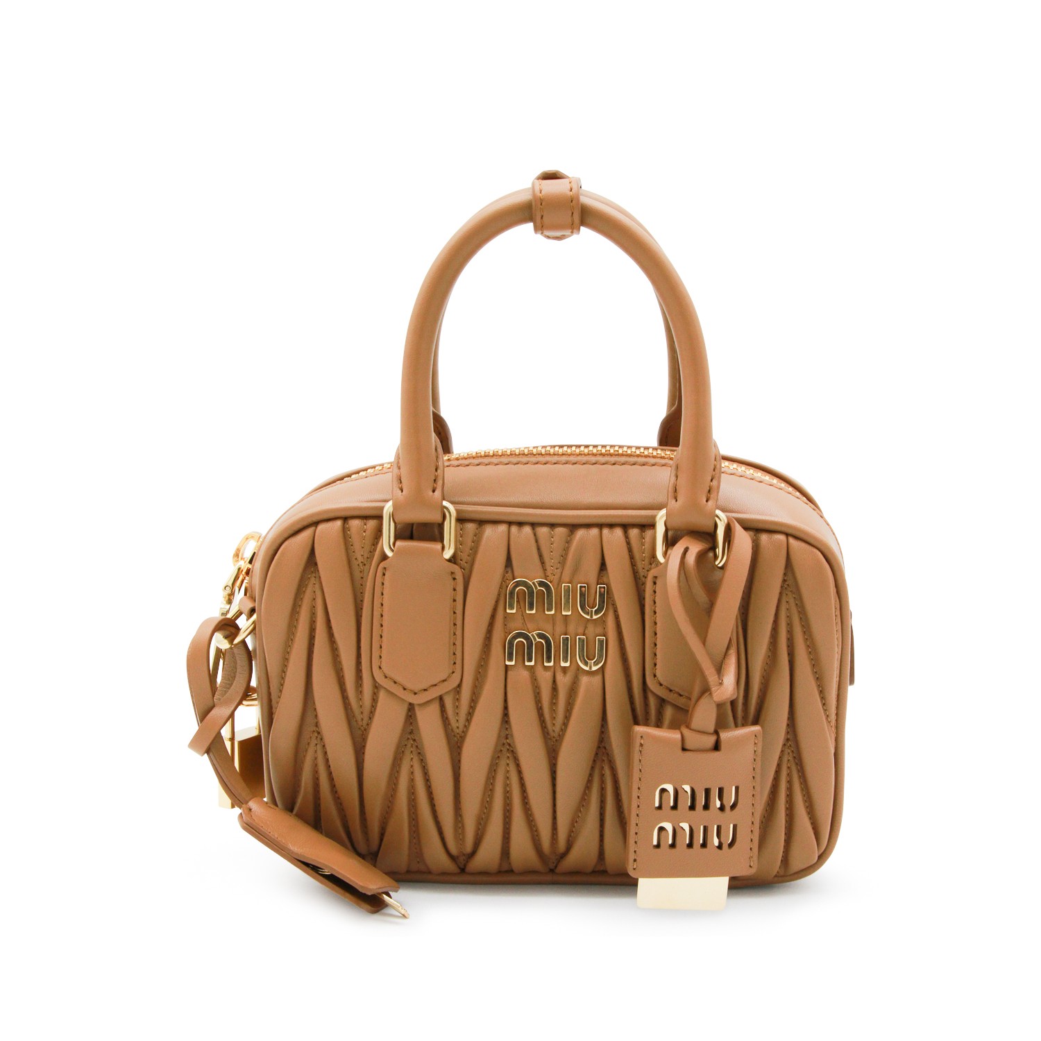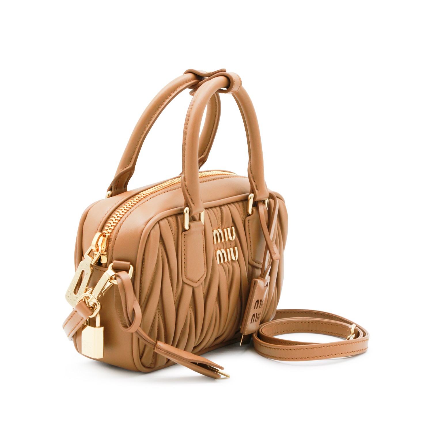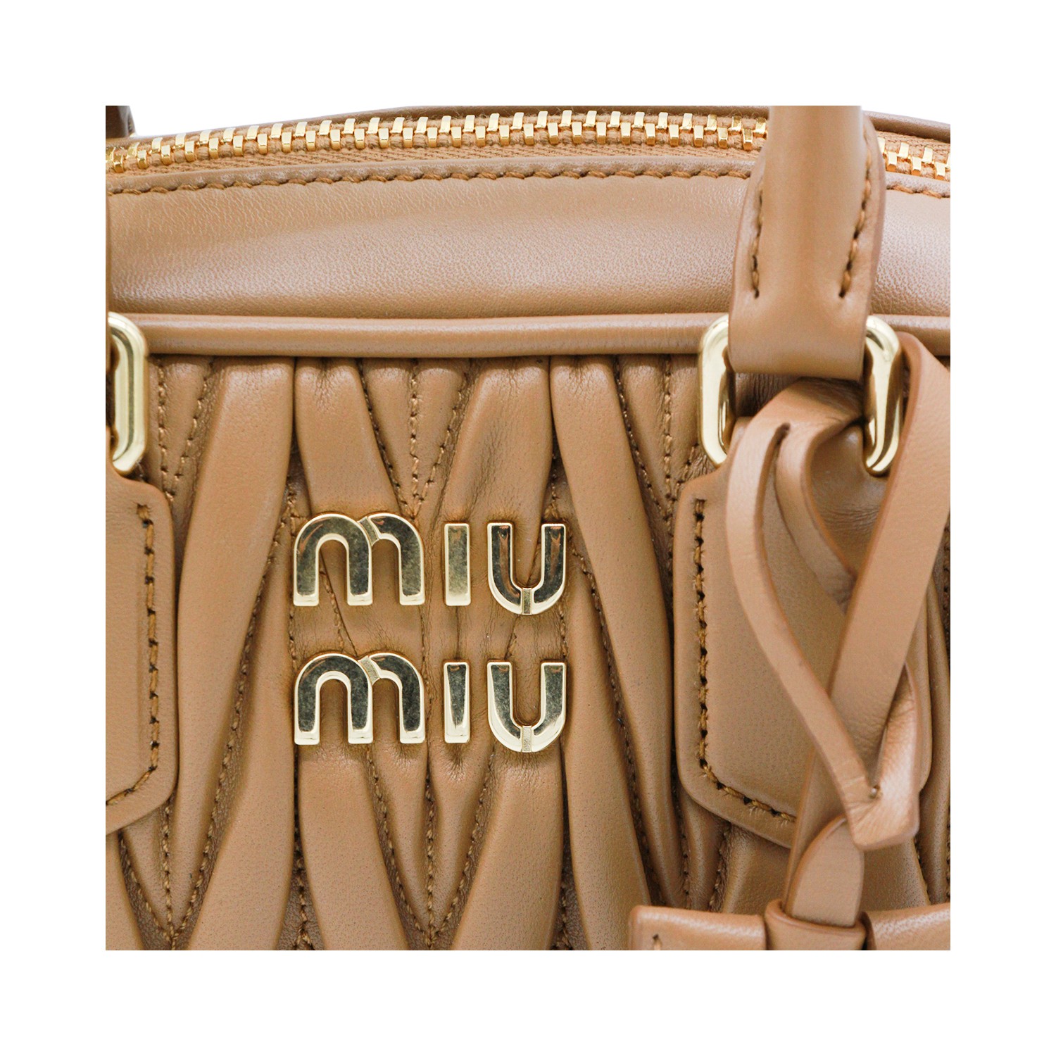 Caramel leather top handle bag from Miu Miu featuring top handles, removable and adjustable shoulder strap, zip fastening, main compartment, internal zip pocket and all over details.