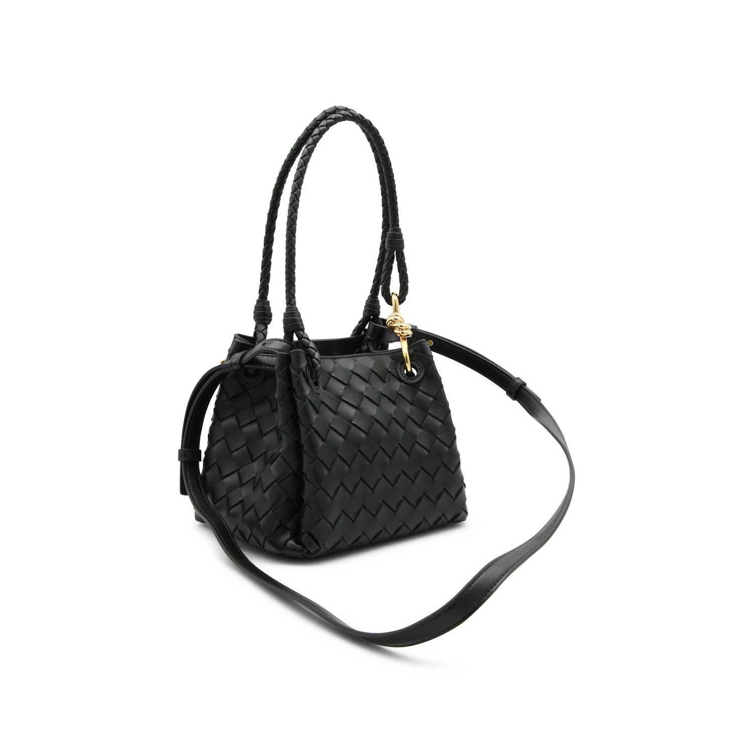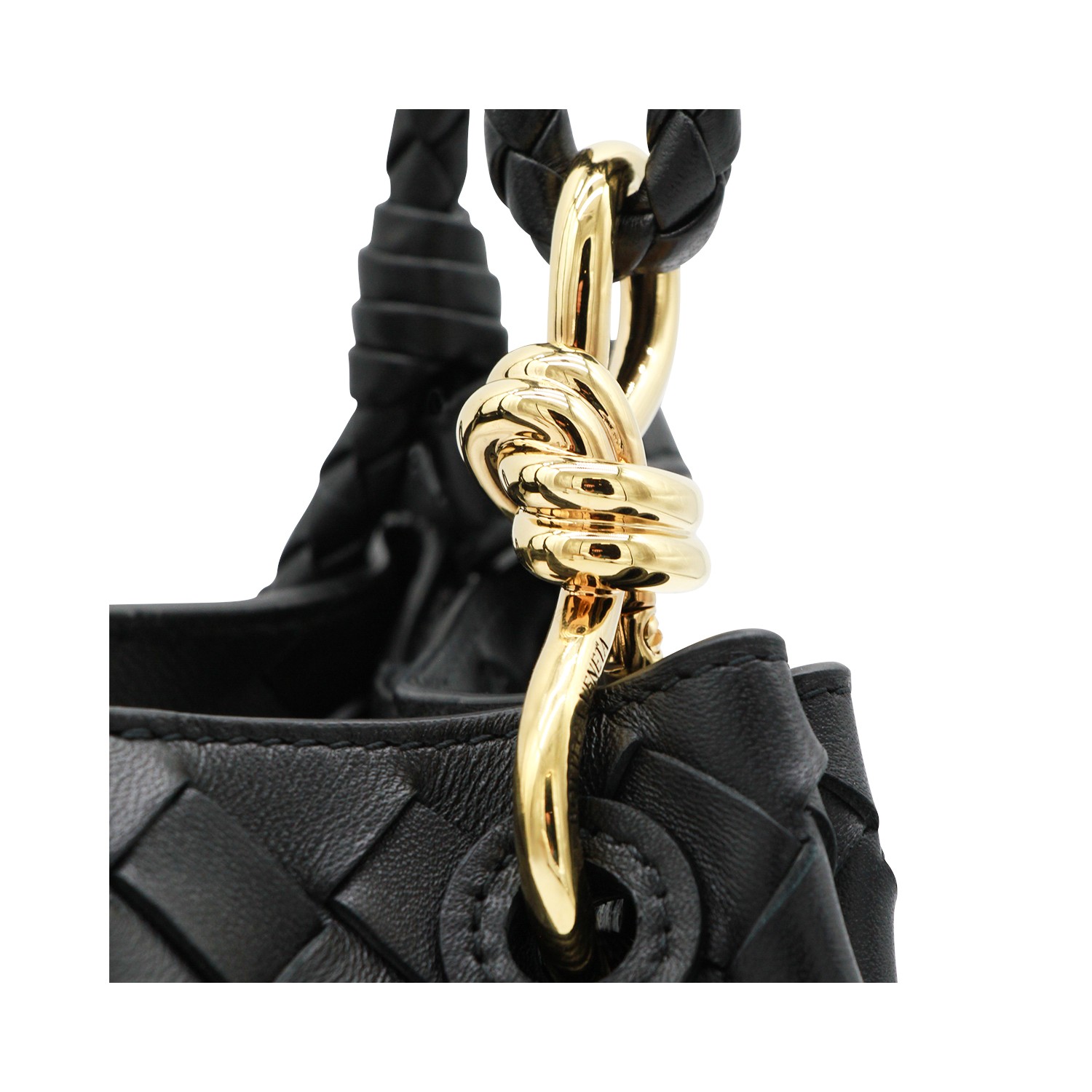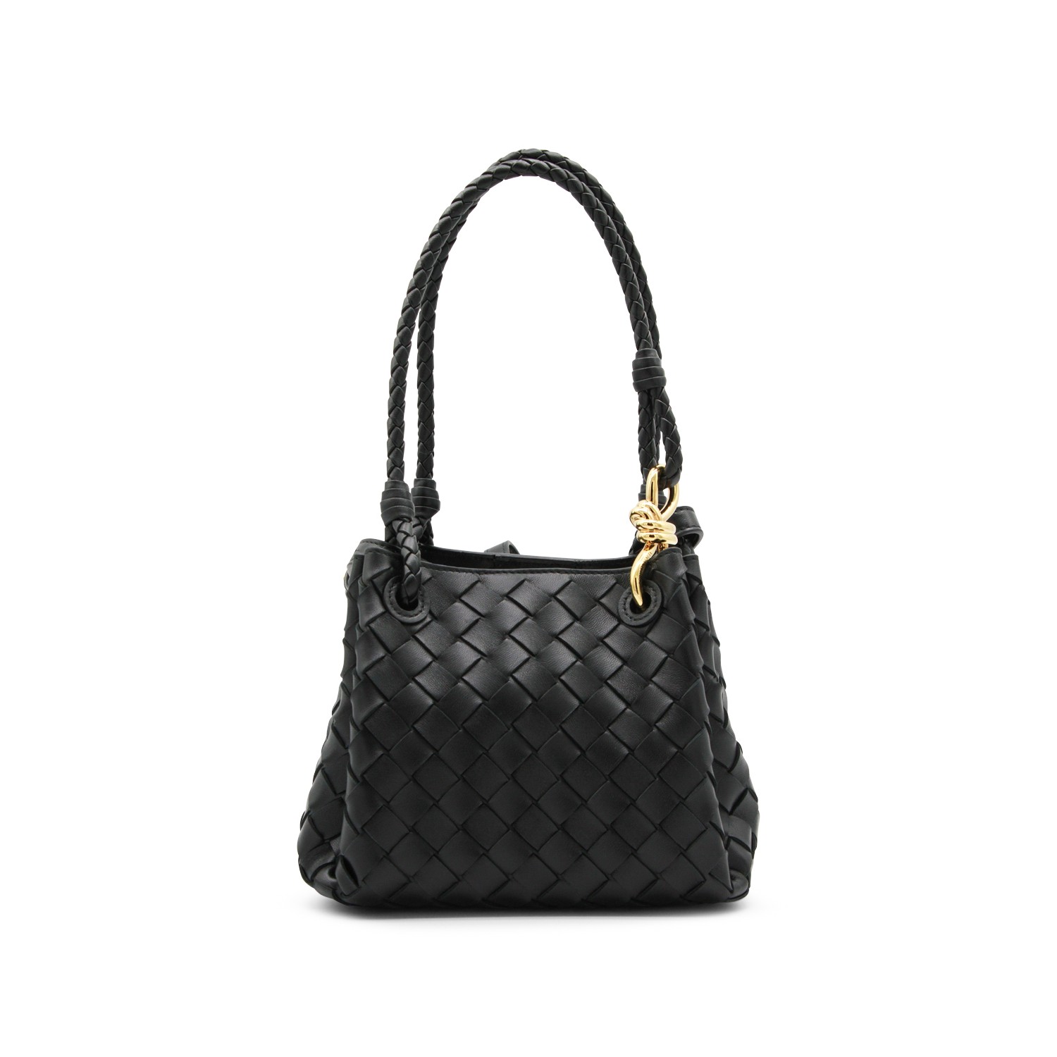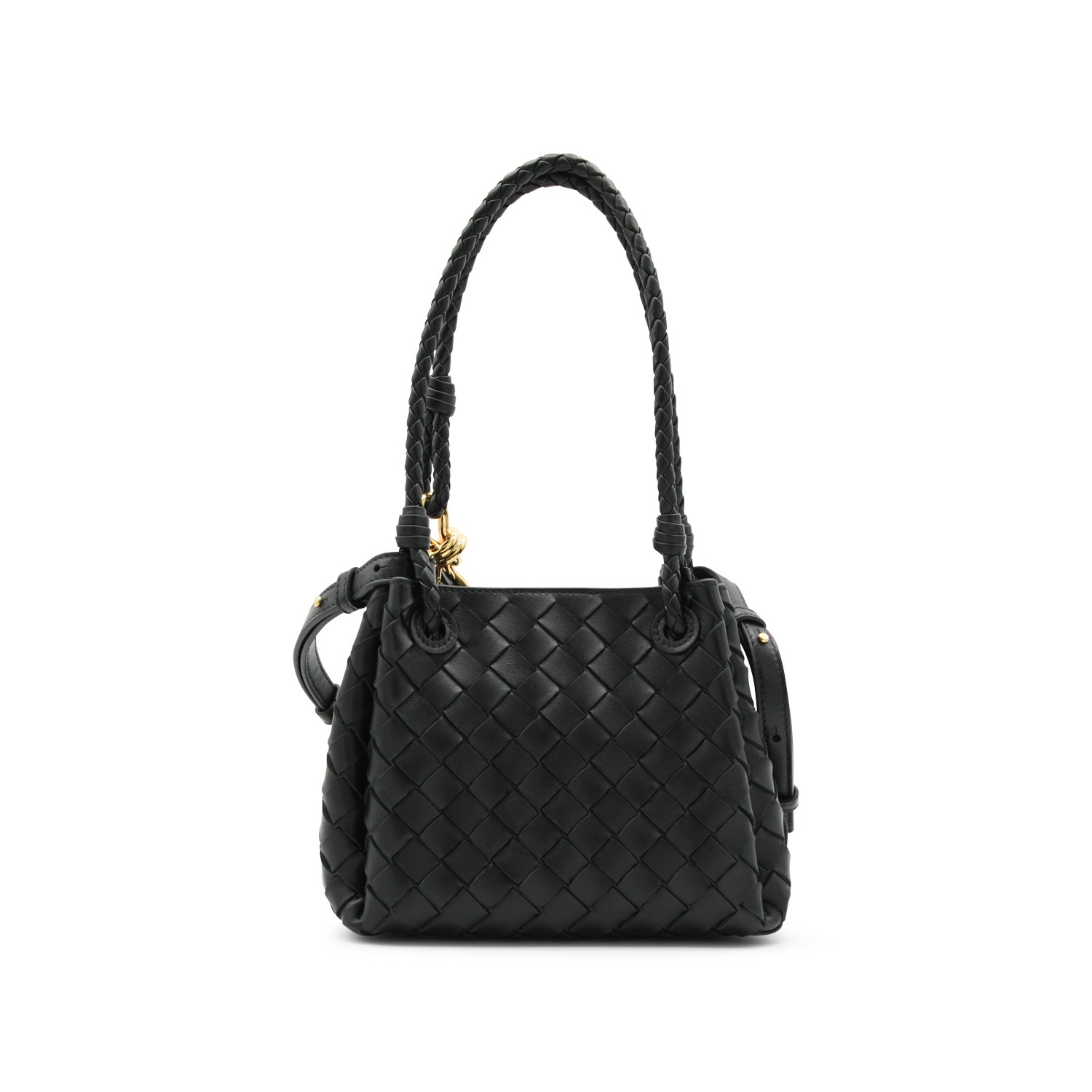 Black leather bag from Bottega Veneta featuring top handles, main compartment and gold tone hardware.