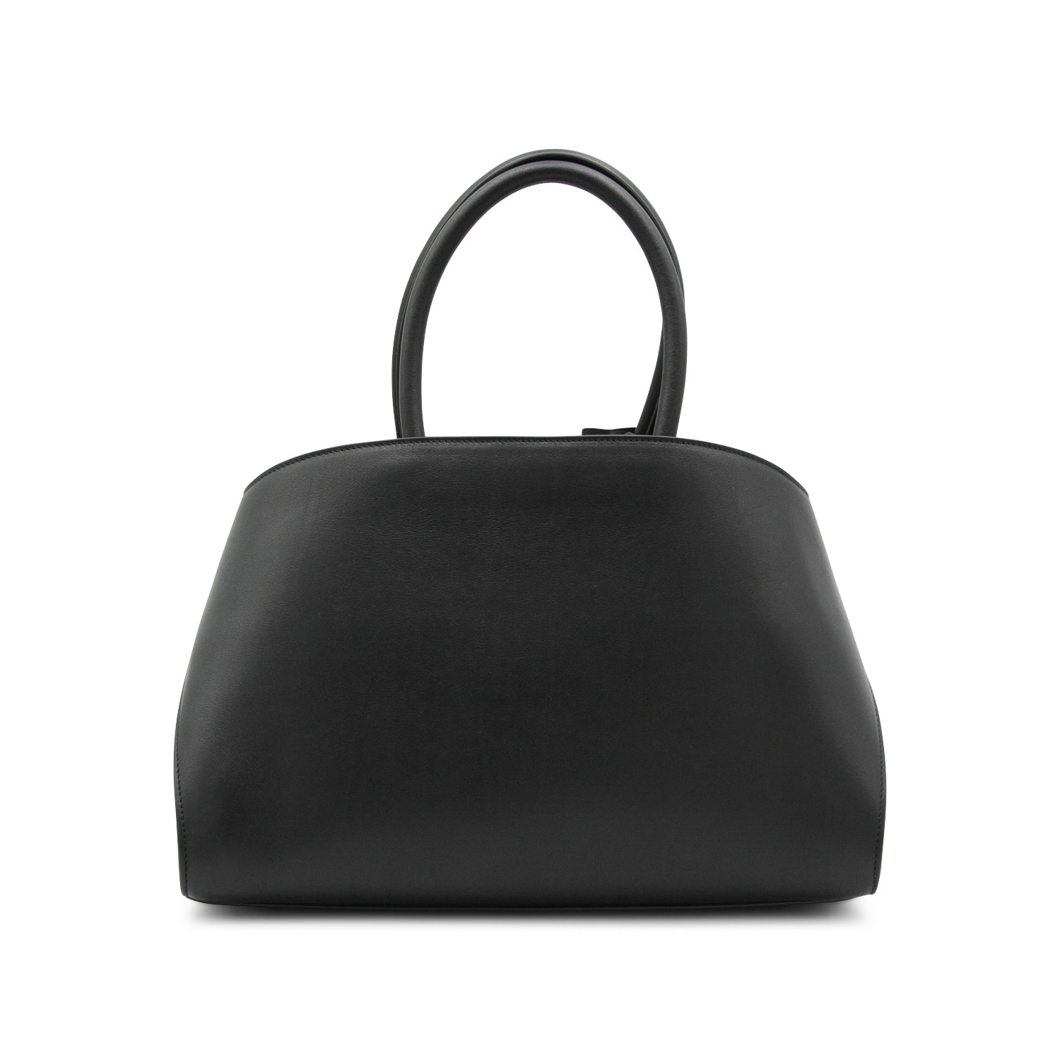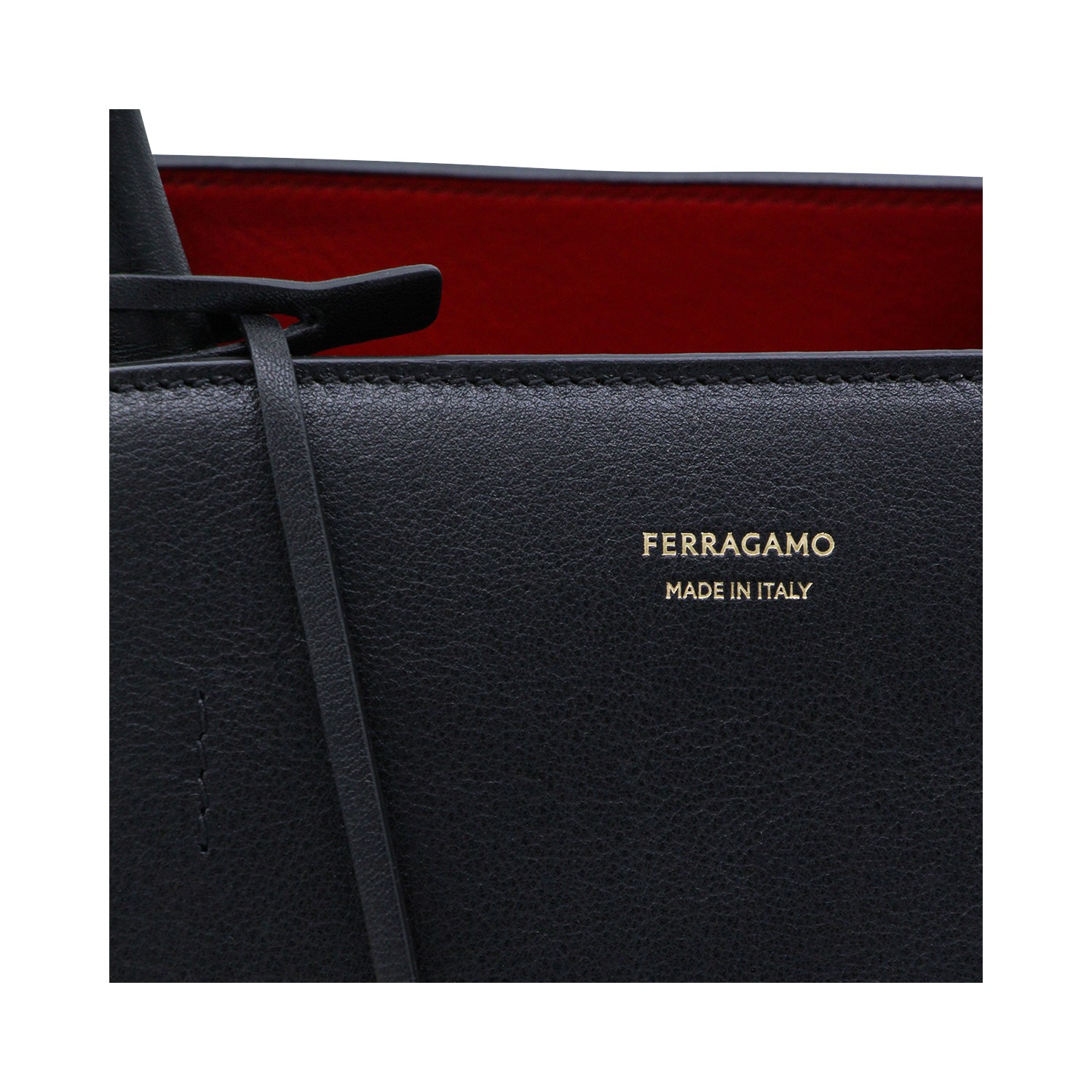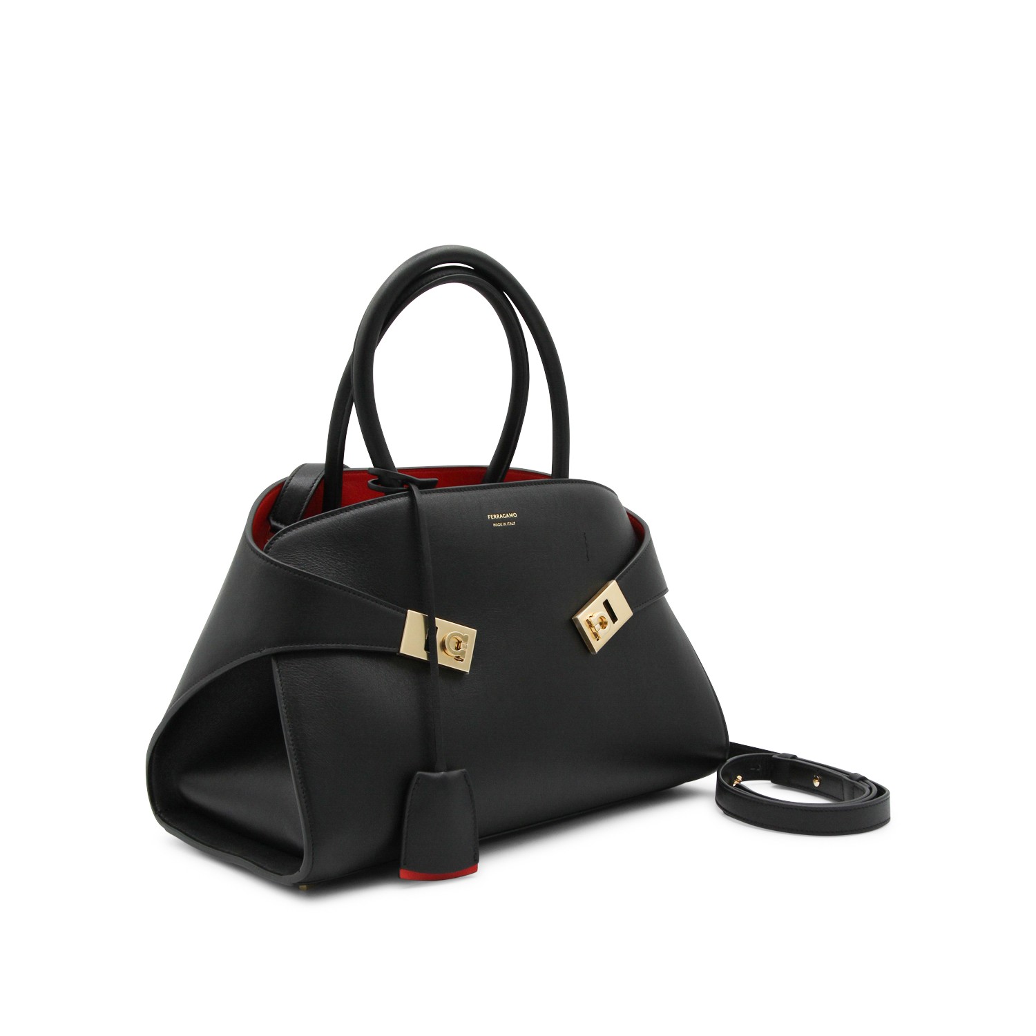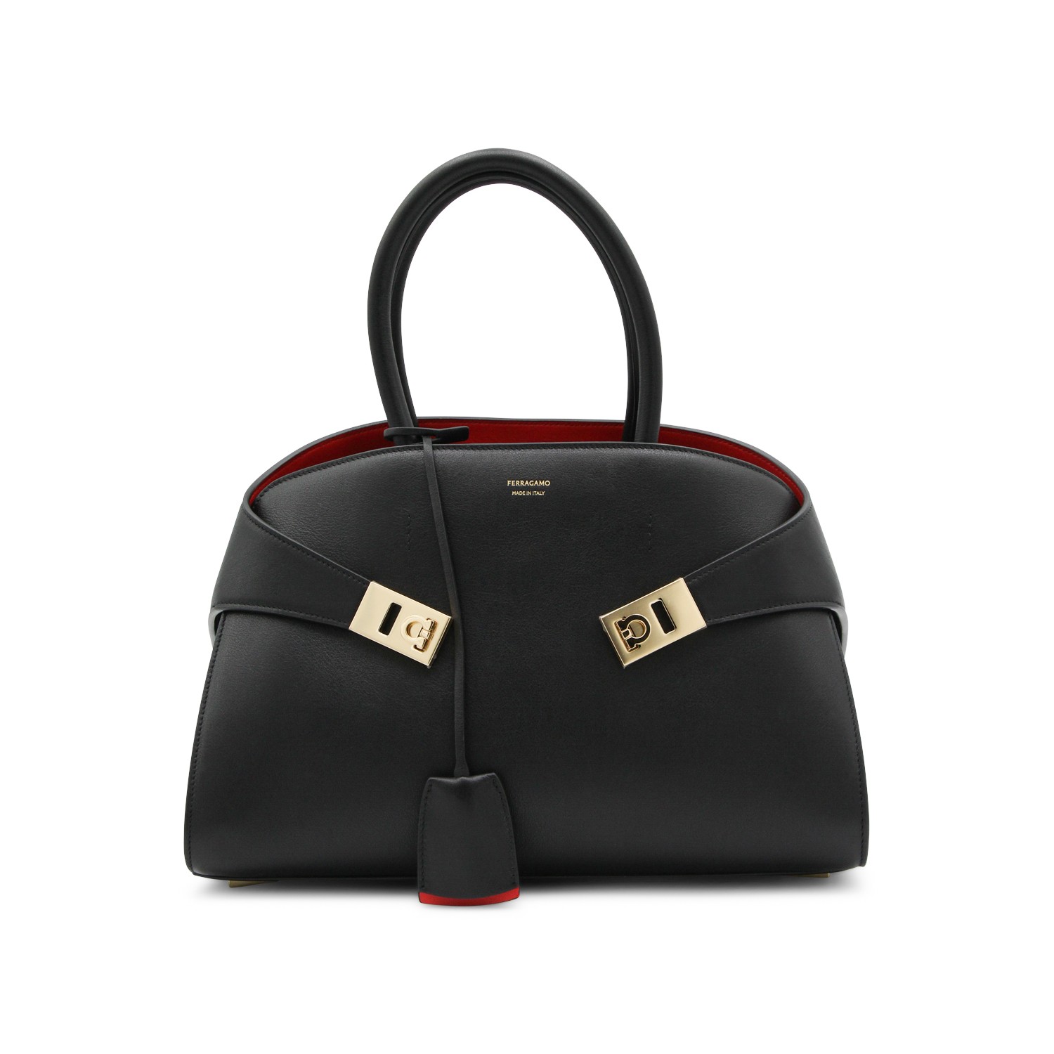 Black leather Hug S shoulder bag from Ferragamo featuring top handle, gold tone hardware, frontal logo, adjustable and removable shoulder strap, main compartment and internal zip pocket.