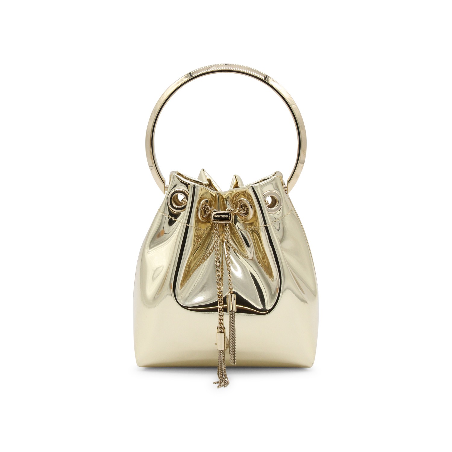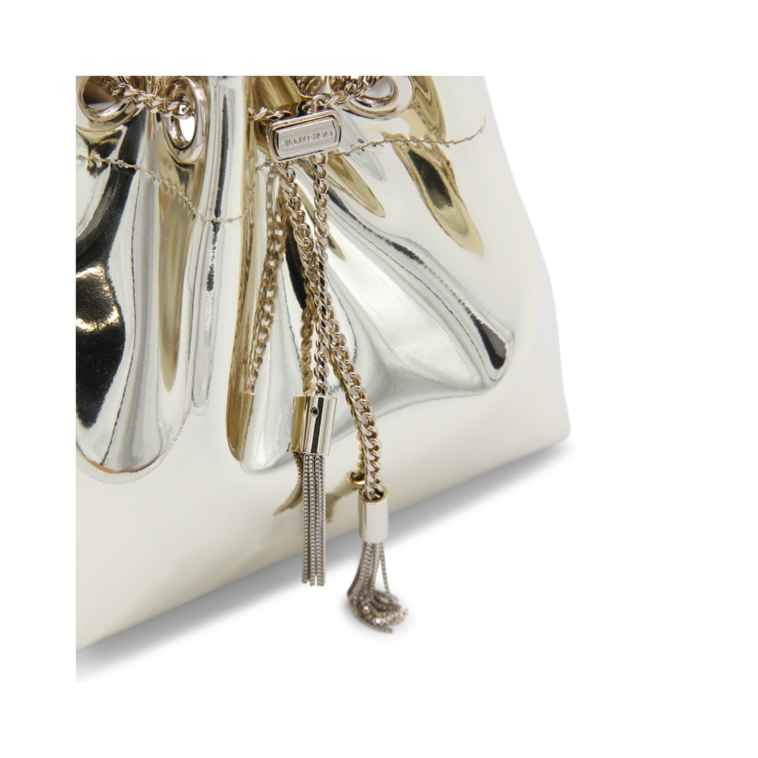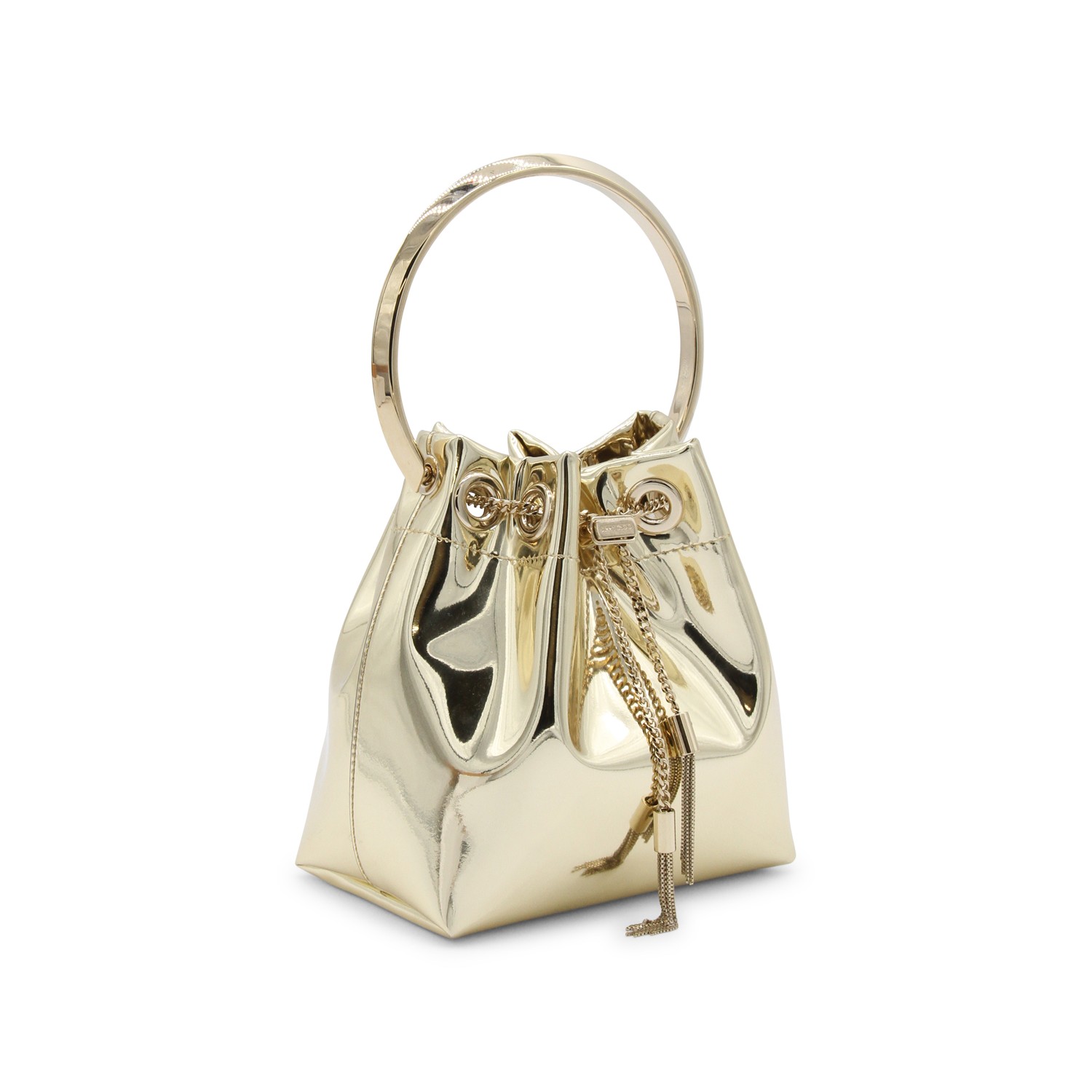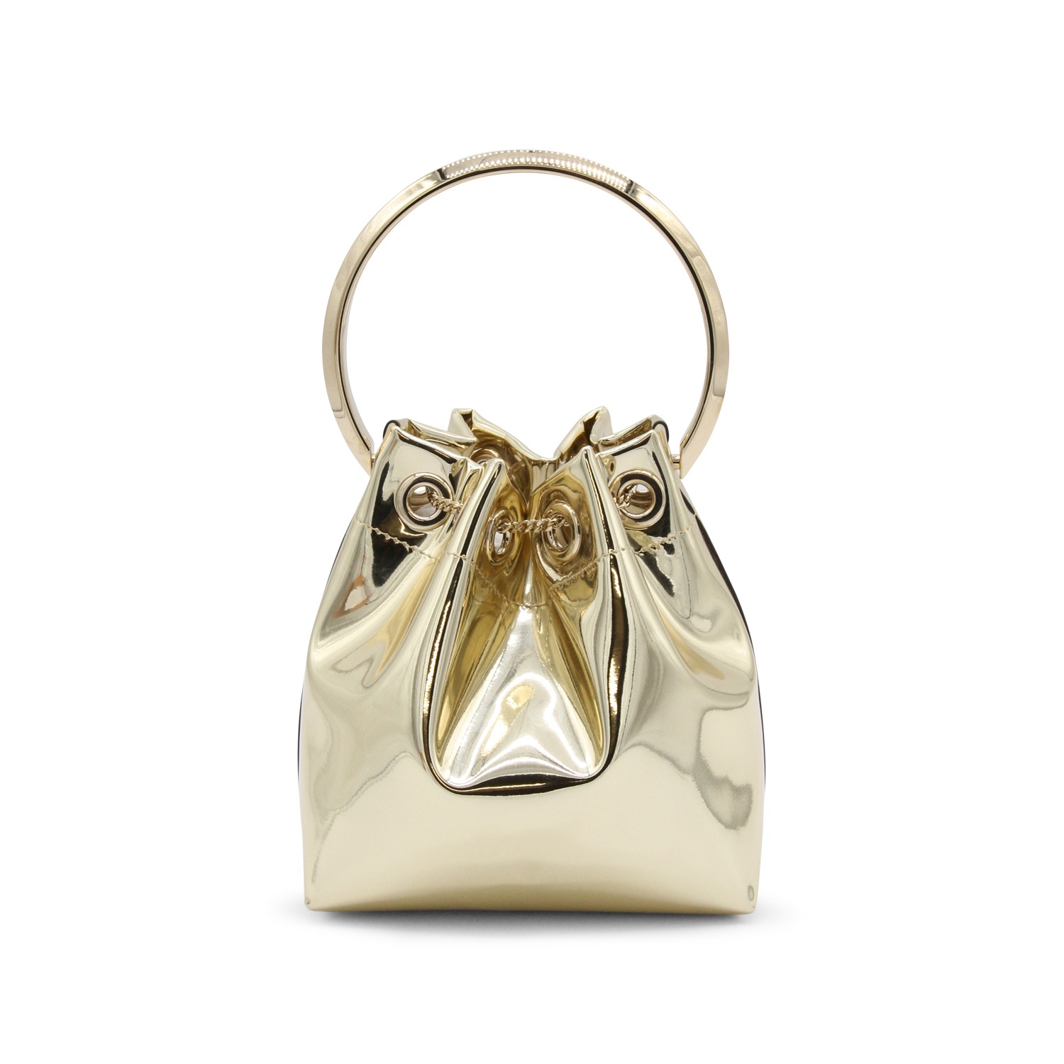 Gold leather BON BON satchel from Jimmy Choo featuring rigid top handle, laces fastening, mirror effect, chain and inside pocket.