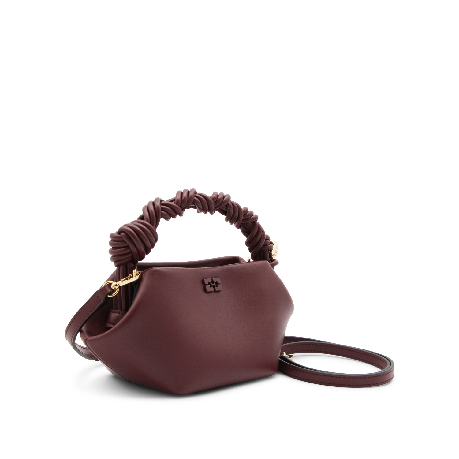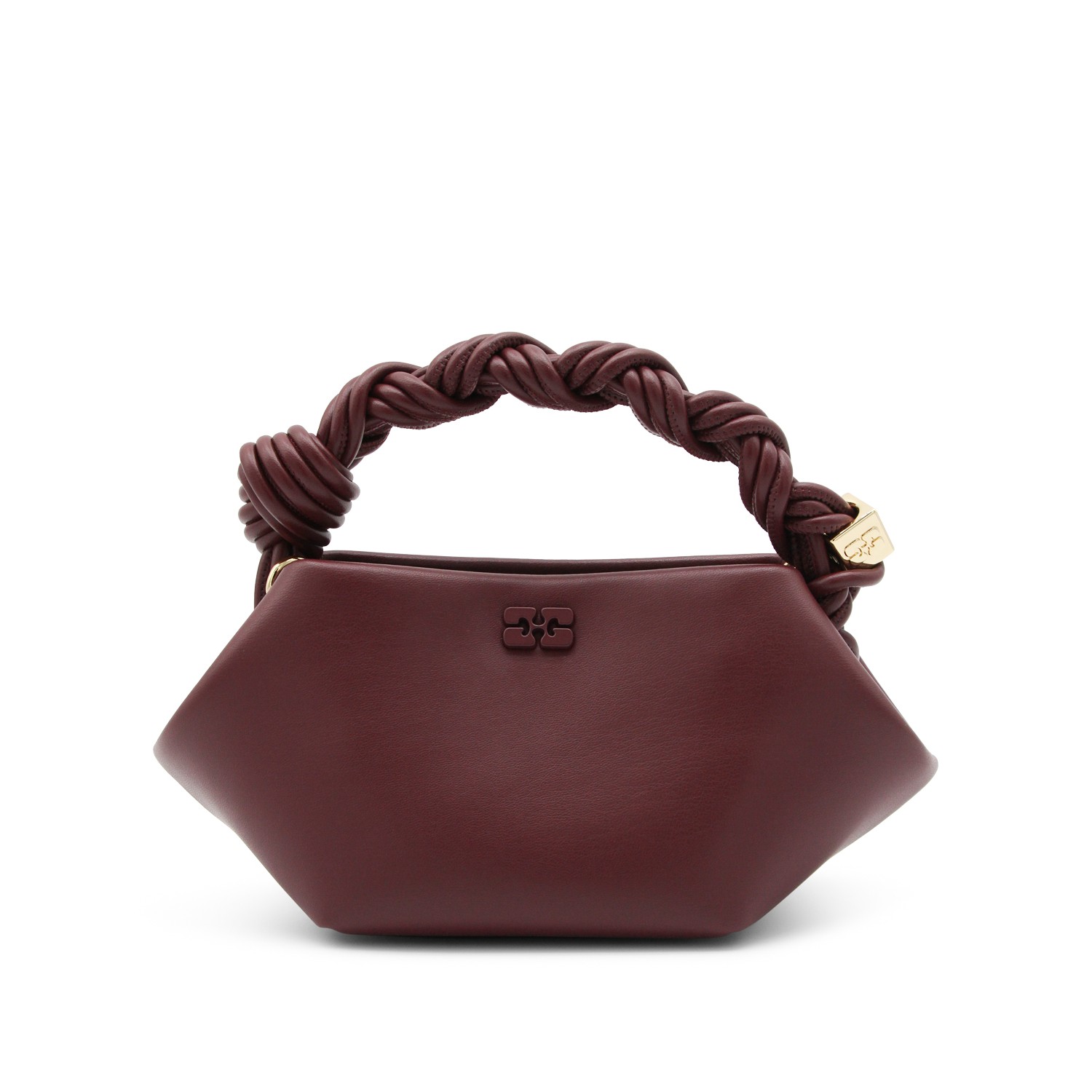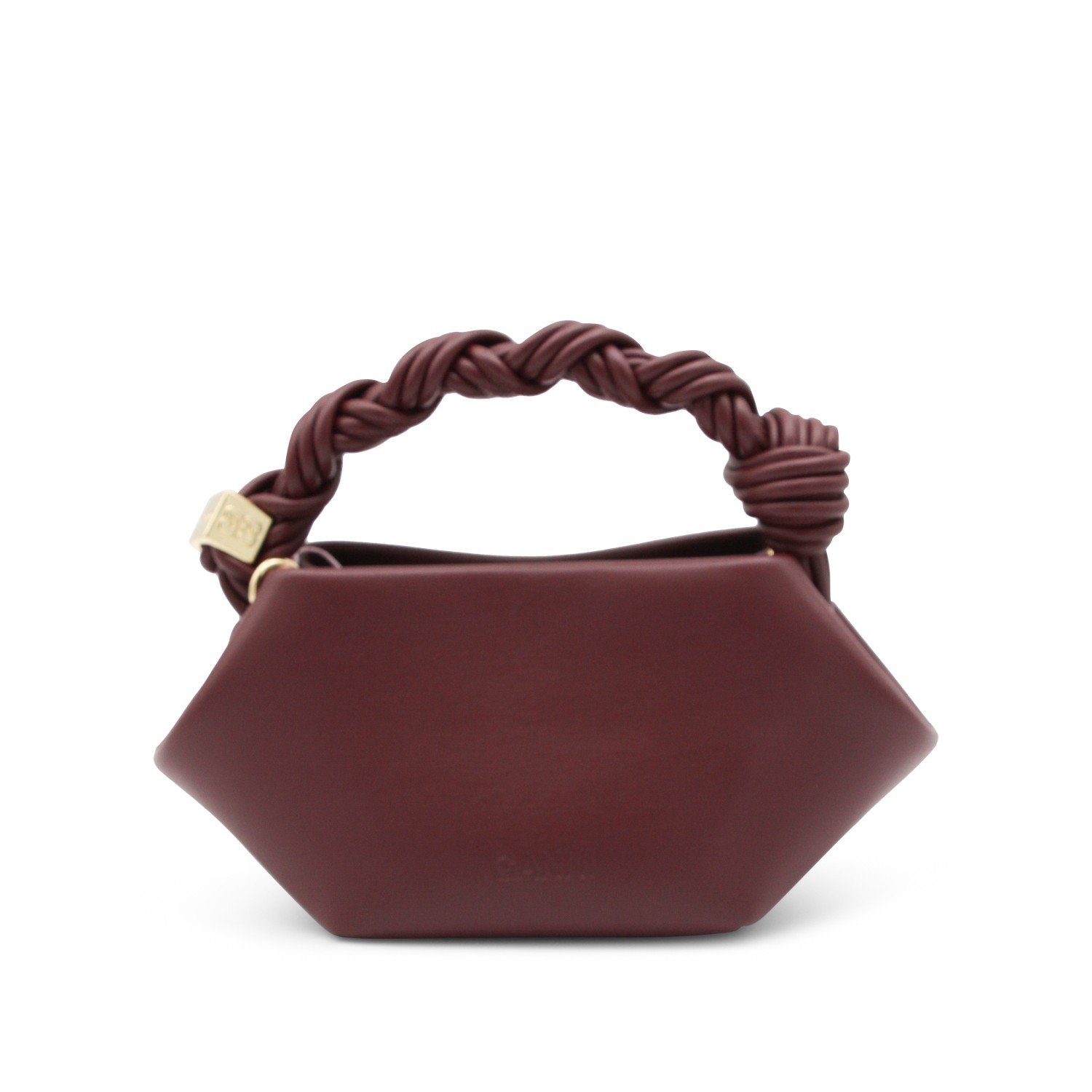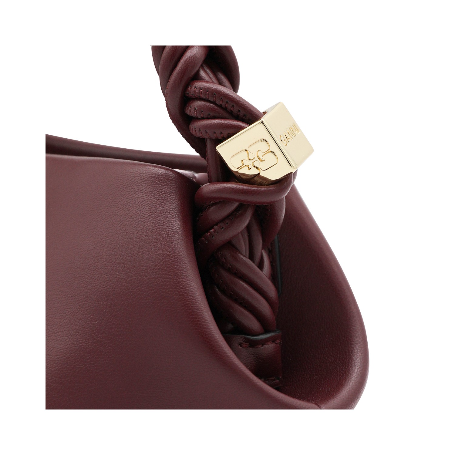 Burgundy top handle bag from Ganni featuring twisted handle, gold tone hardware, engraved logo, magnetic closure, adjustable and removable shoulder strap, main compartment and internal flat card pocket.