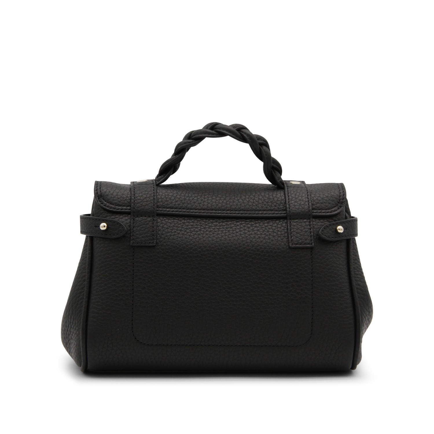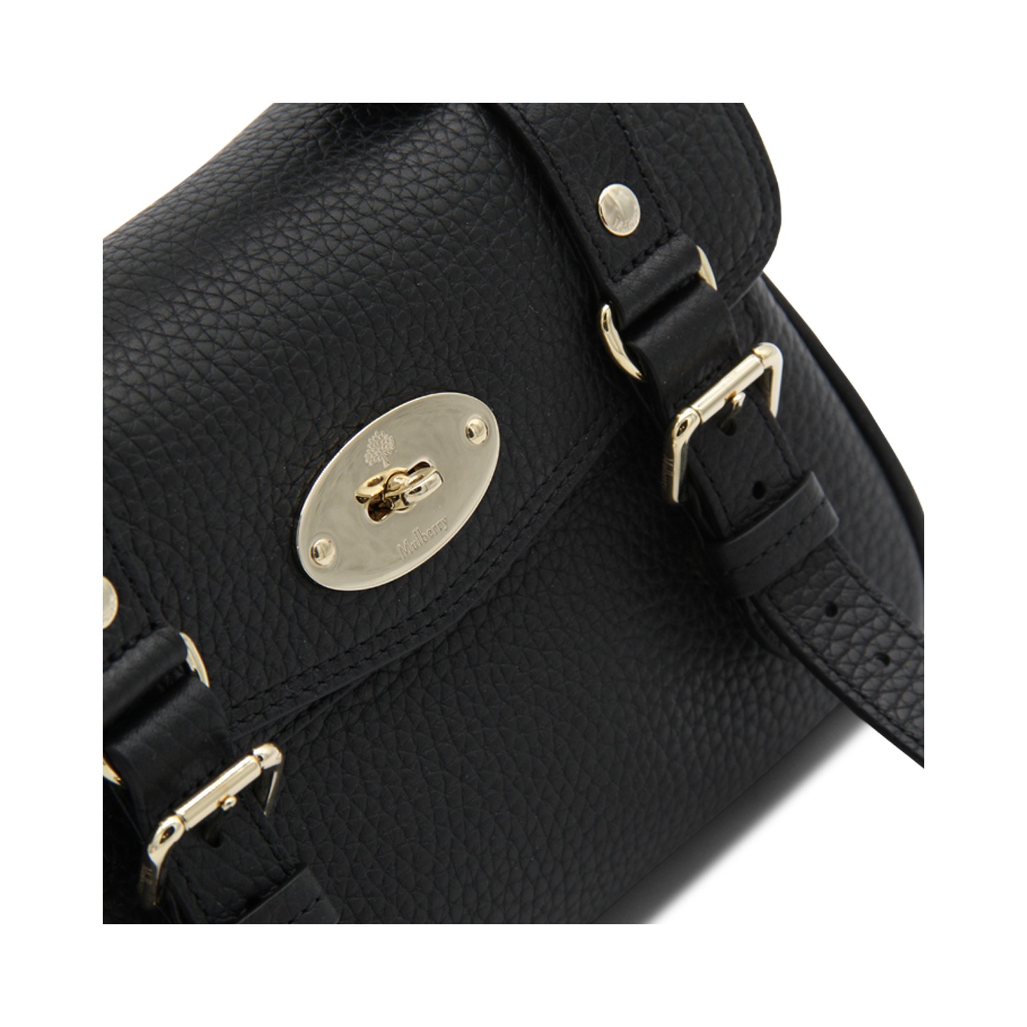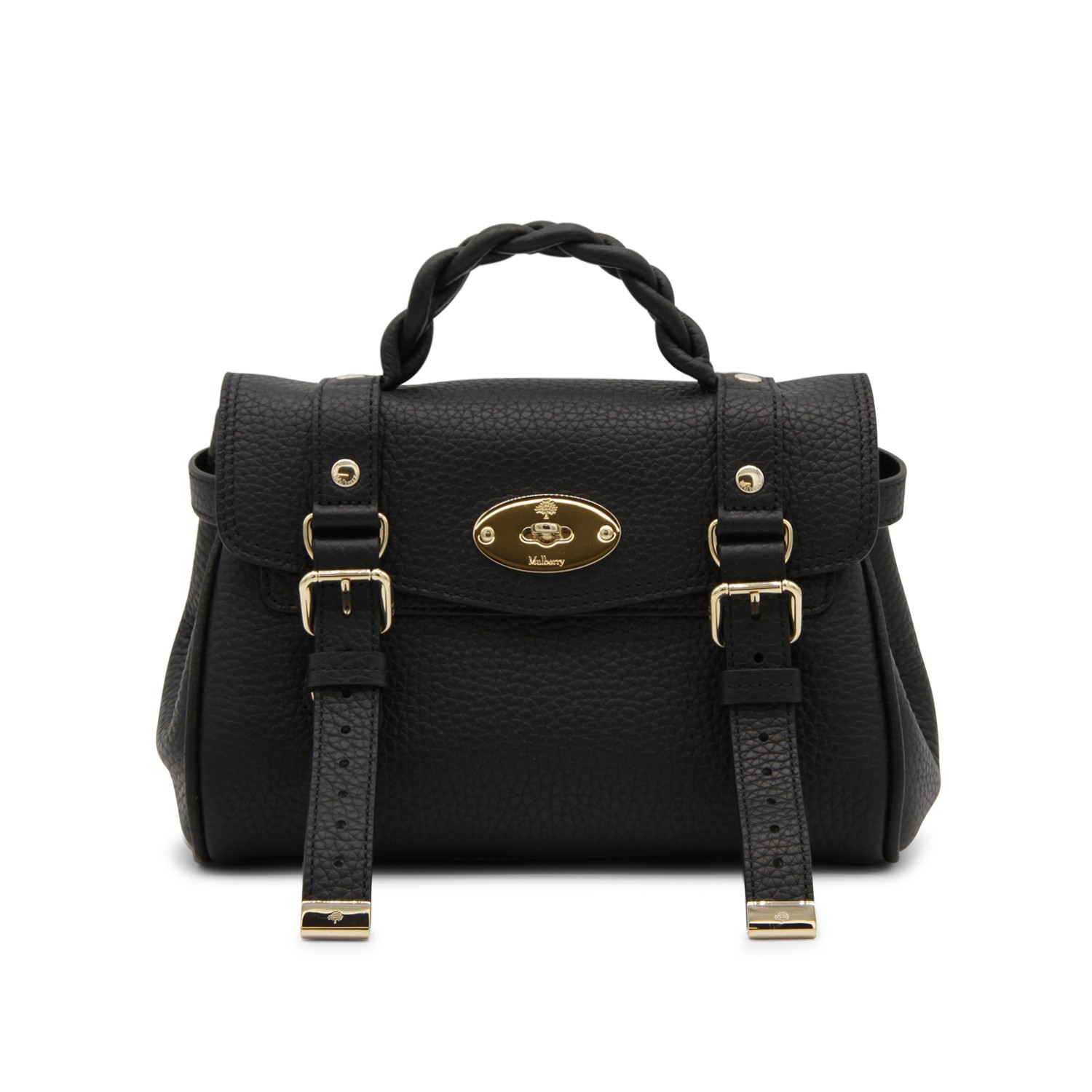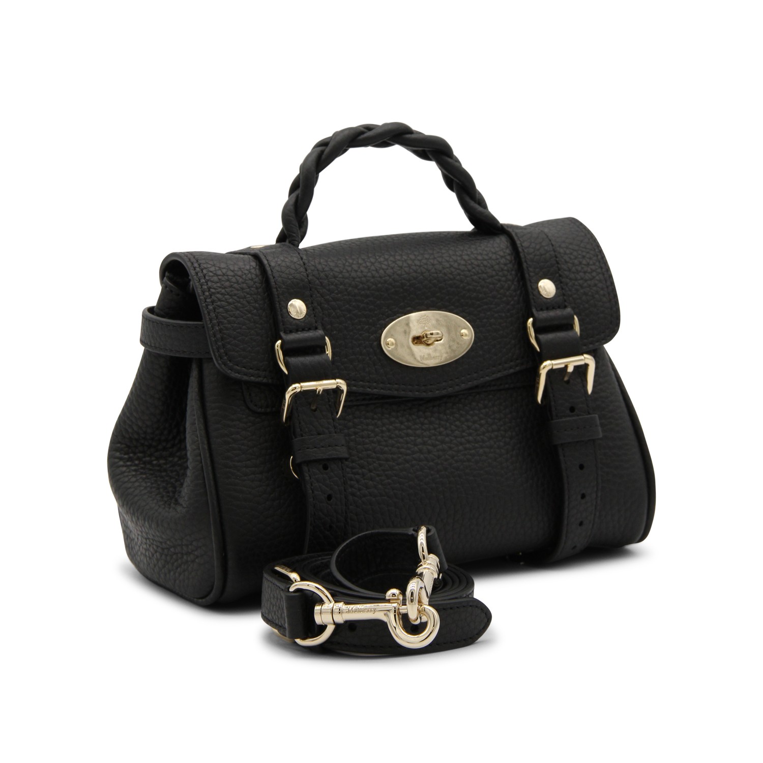 Black leather Mini Alexa Heavy Grain top handle bag from Mulberry featurig top handle, frontal fastening, gold tone hardware and removable strap.