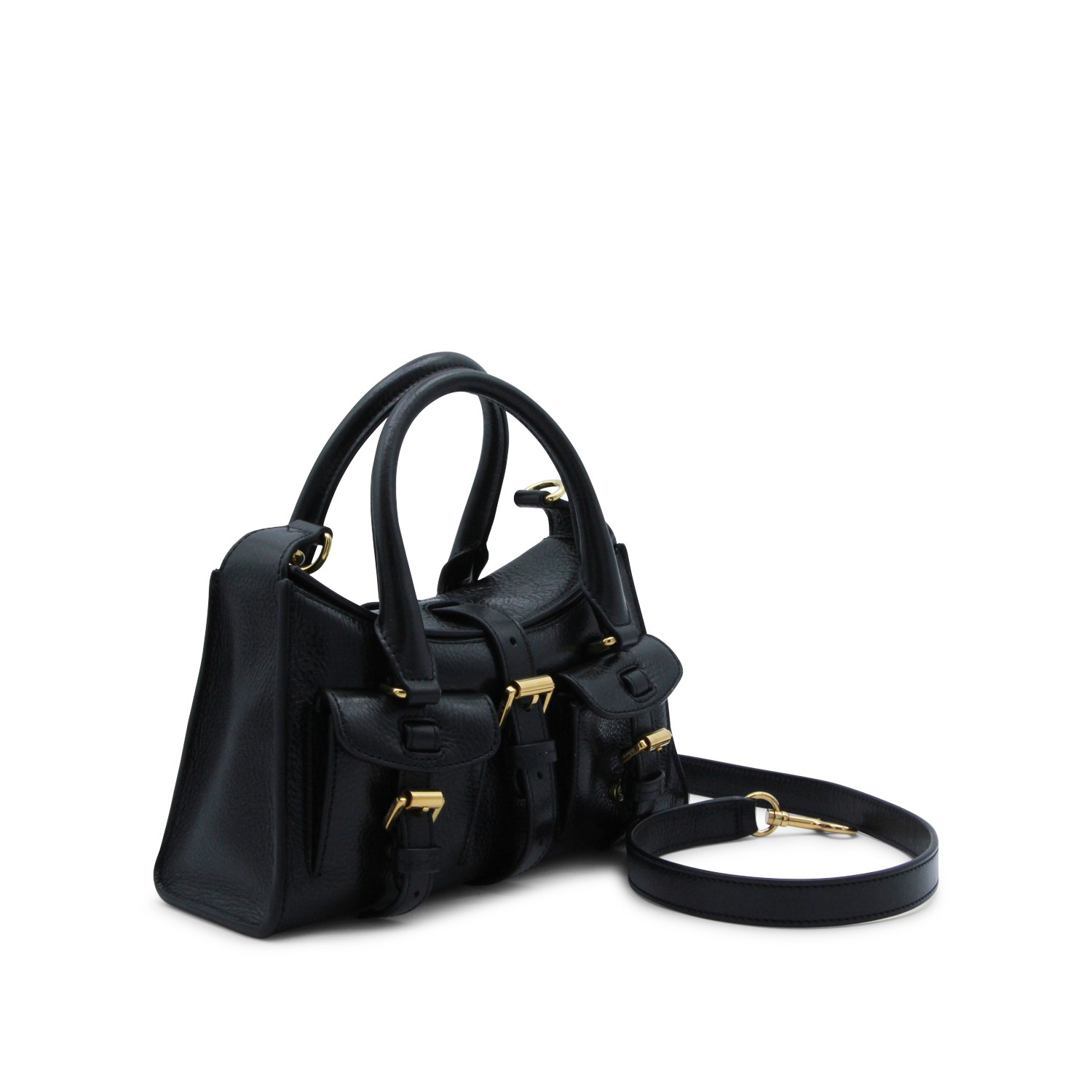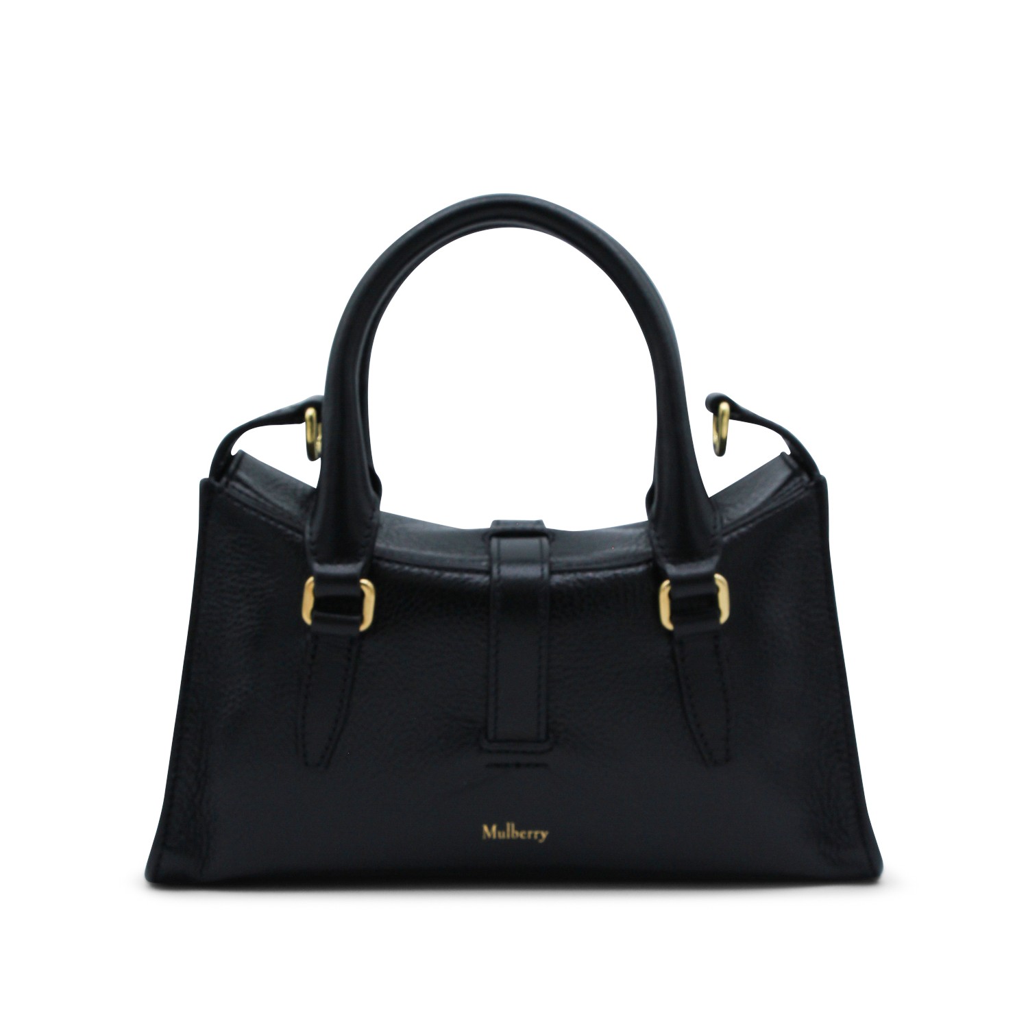 Black leather Mini Roxanne High Shine top handle bag from Mulberry featuring frontal fastening, gold tone hardware, adjustable and removable strap and pockets.