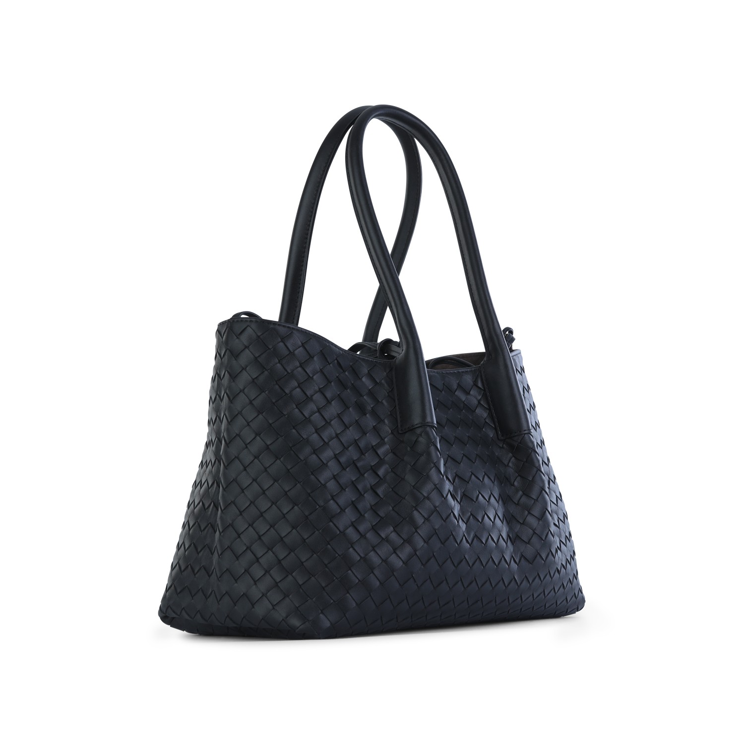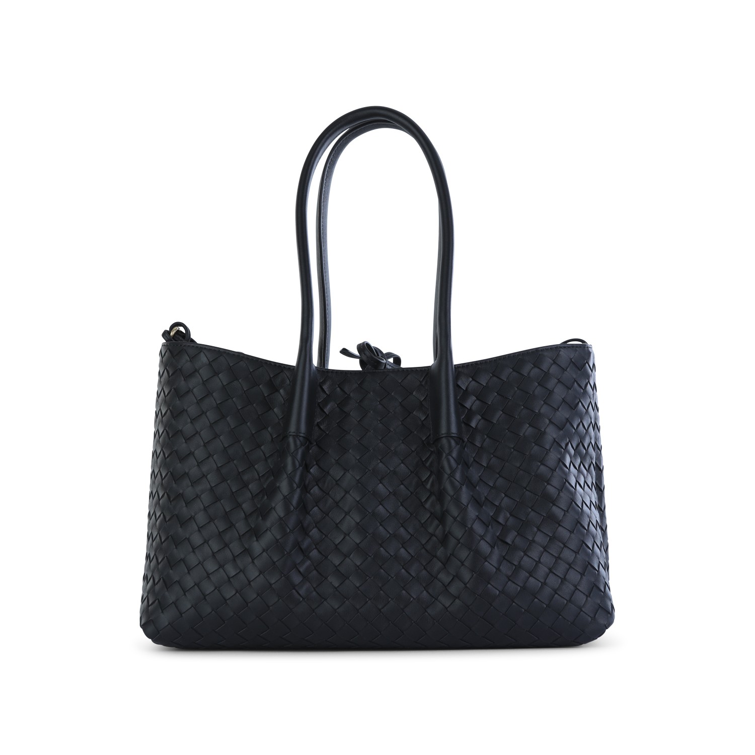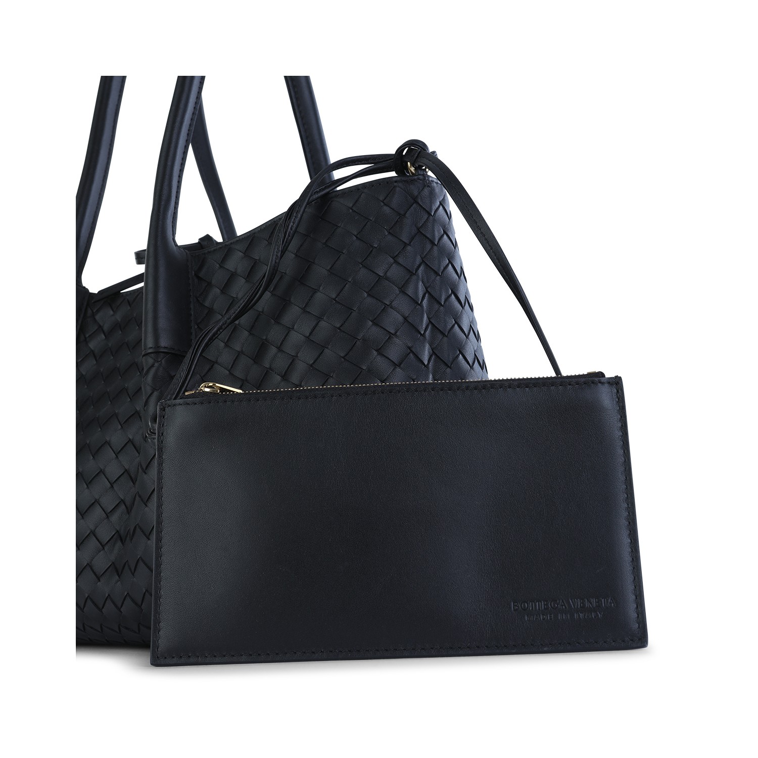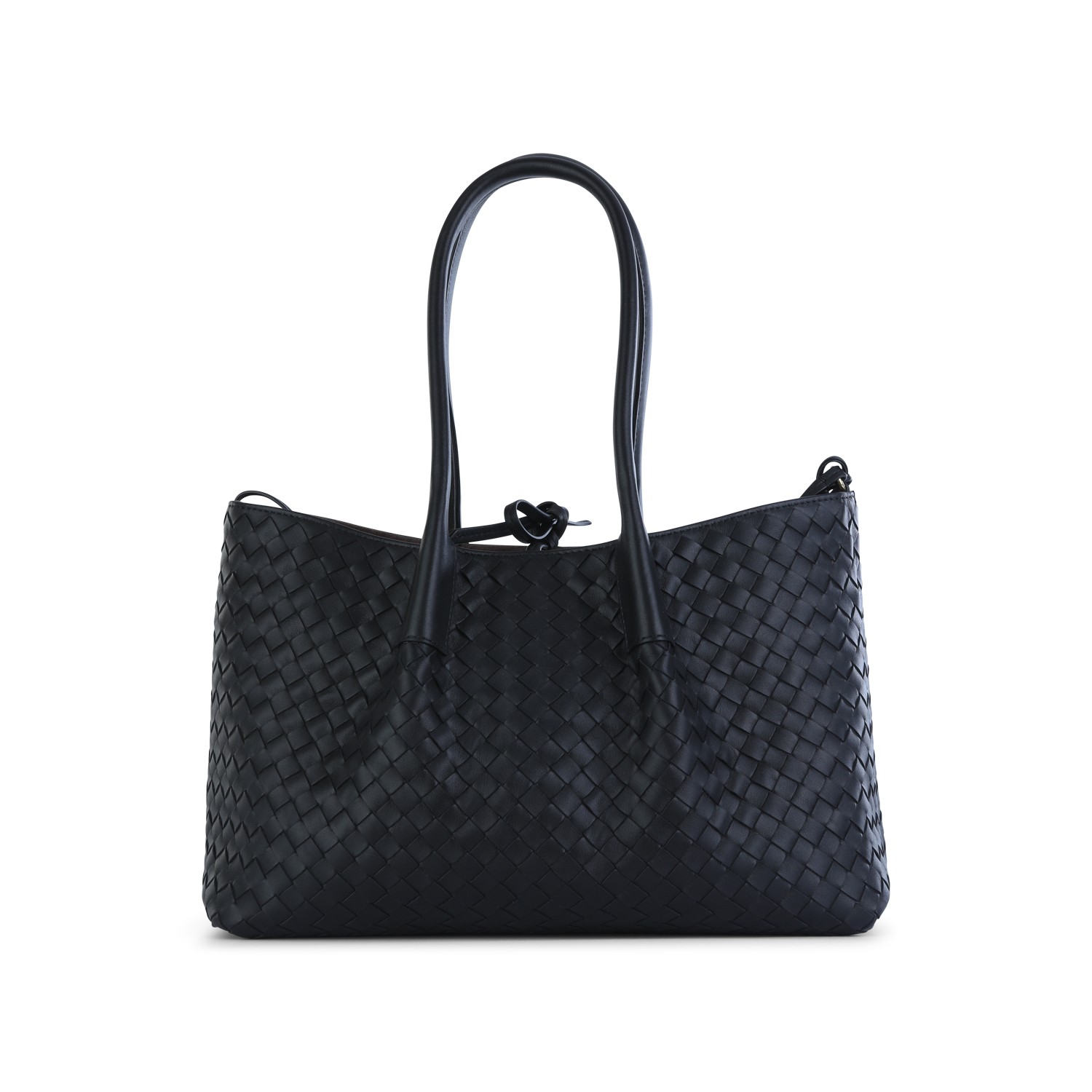 Black leather bag from Bottega Veneta featuring top handles, main compartment, internal pocket and Intreccio motif.
