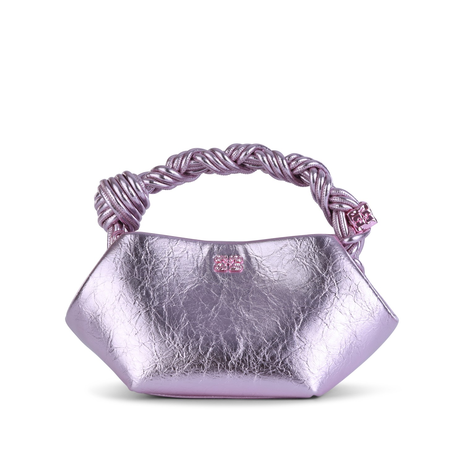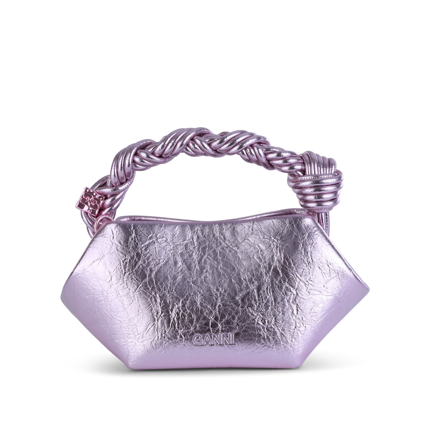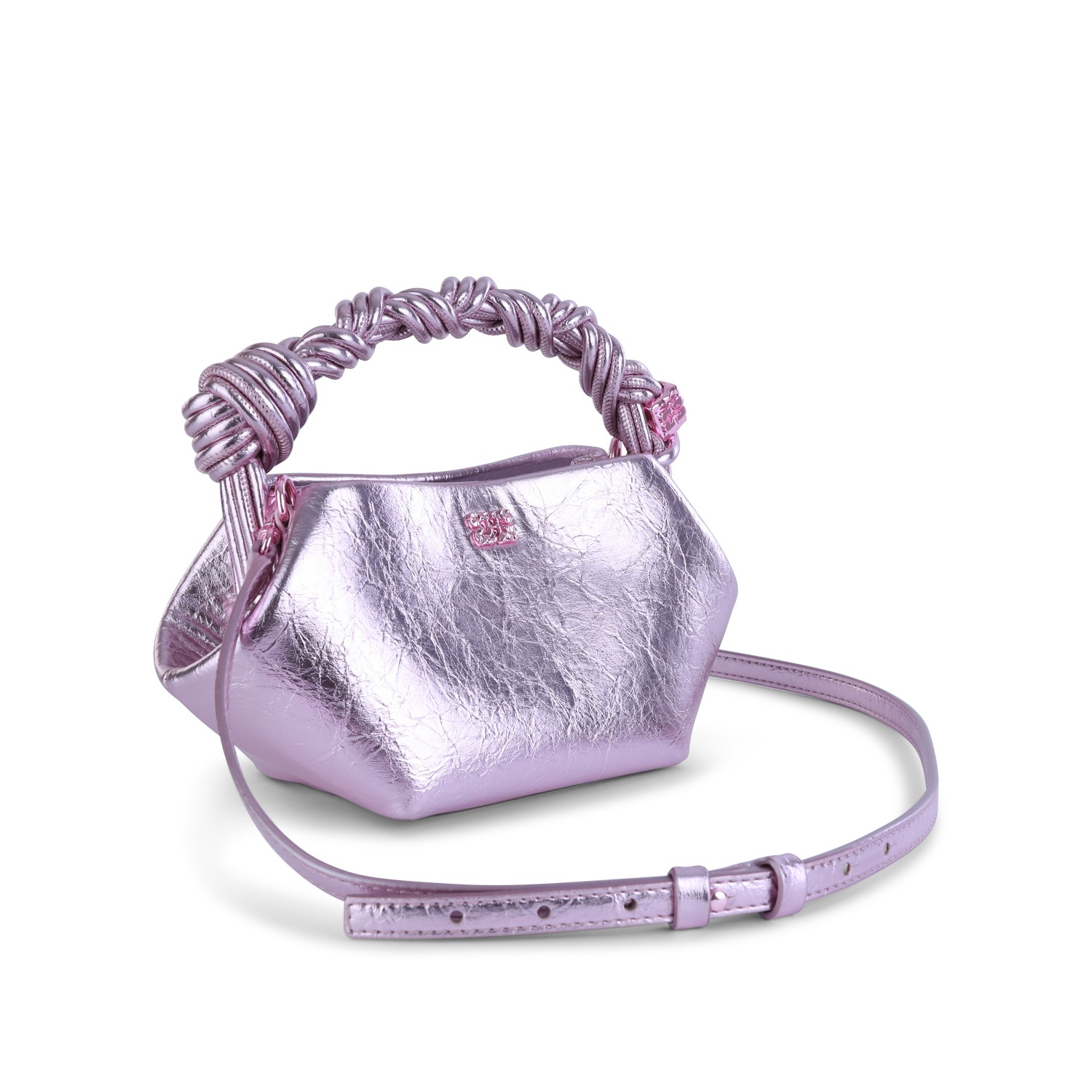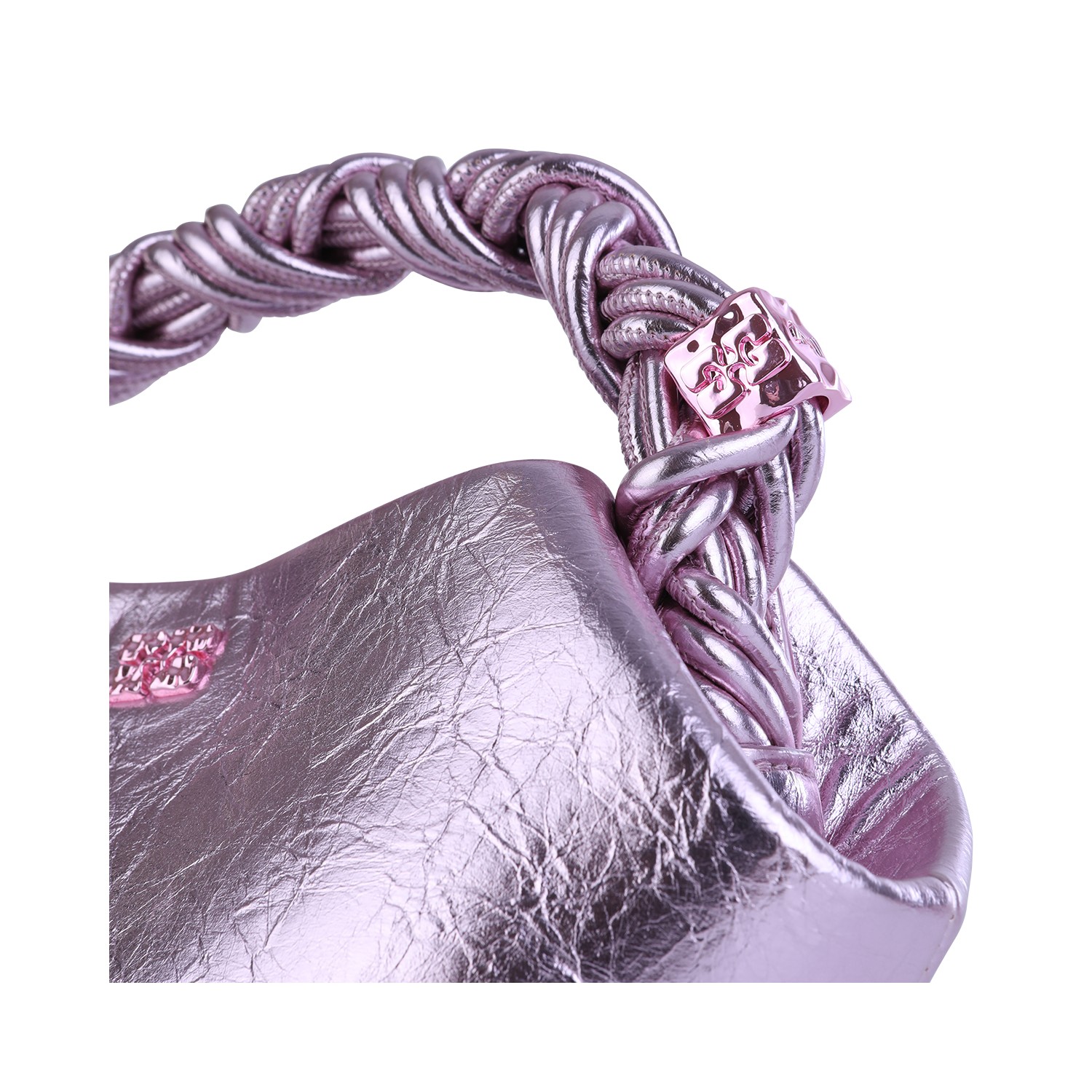 Silver pink top handle bag from Ganni featuring twisted handle, gold tone hardware, engraved logo, magnetic closure, adjustable and removable shoulder strap, main compartment and internal flat card pocket.