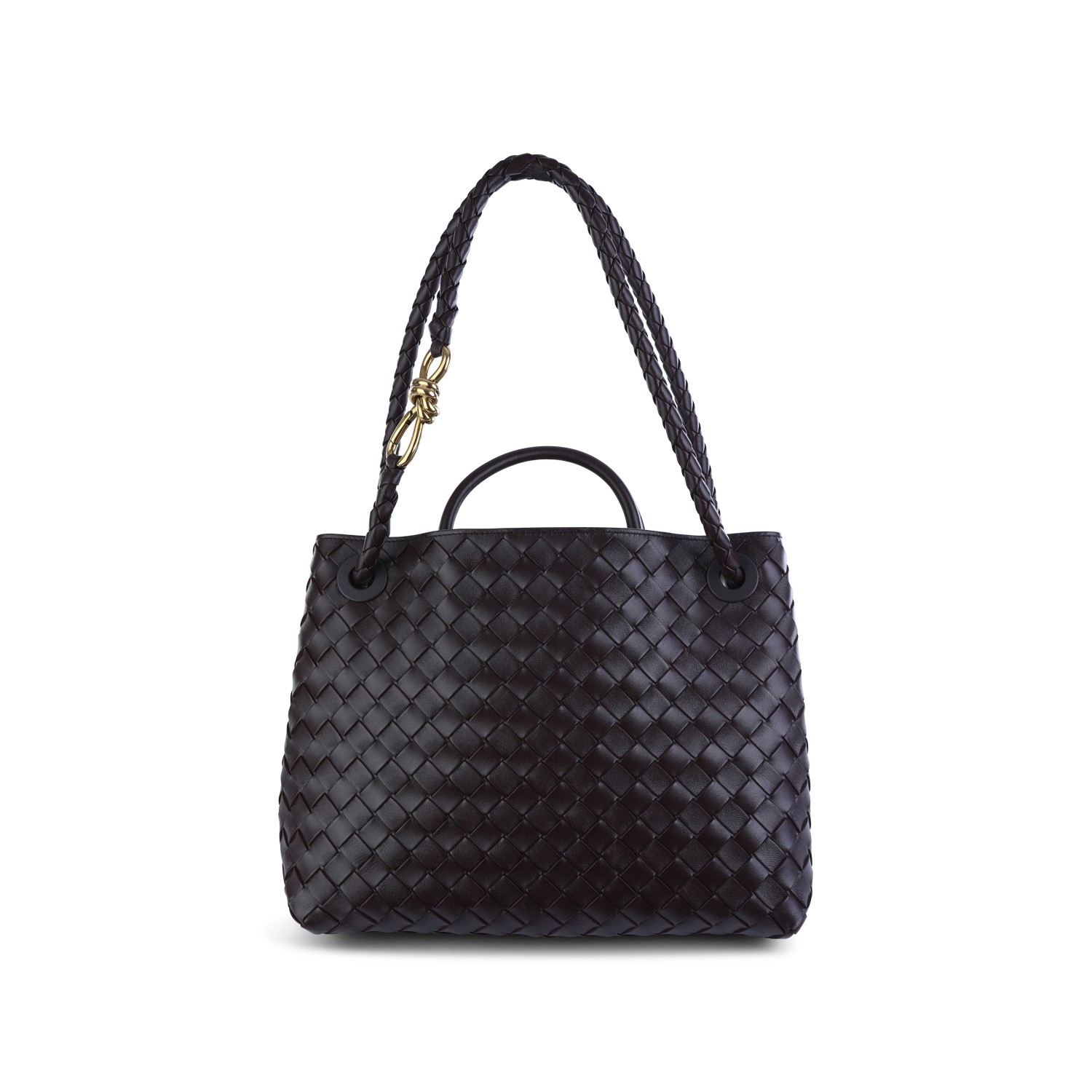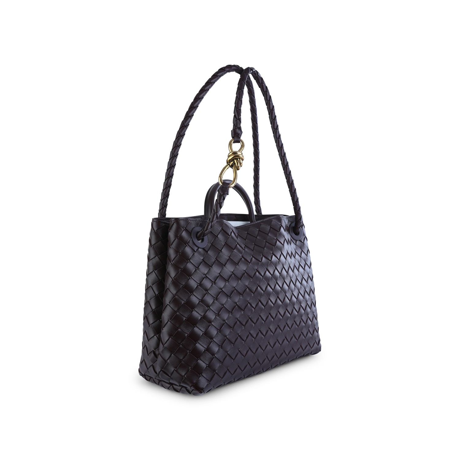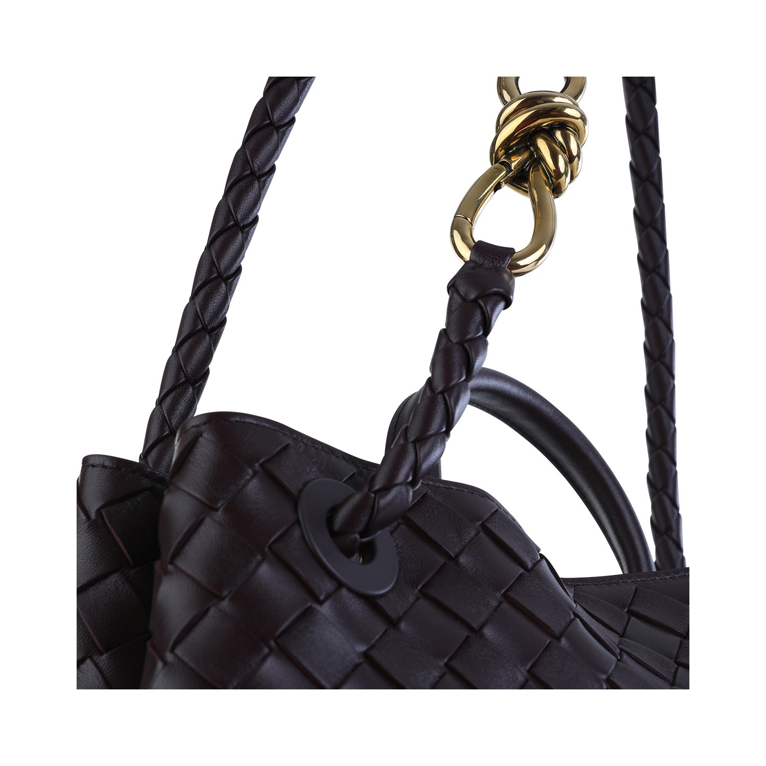 Dark Barolo leather Andiamo bag from Bottega Veneta featuring intertwined workmanship, magnetic closure, one compartment with two open inside pockets, knot detail and sliding cross-body detachable shoulder strap.