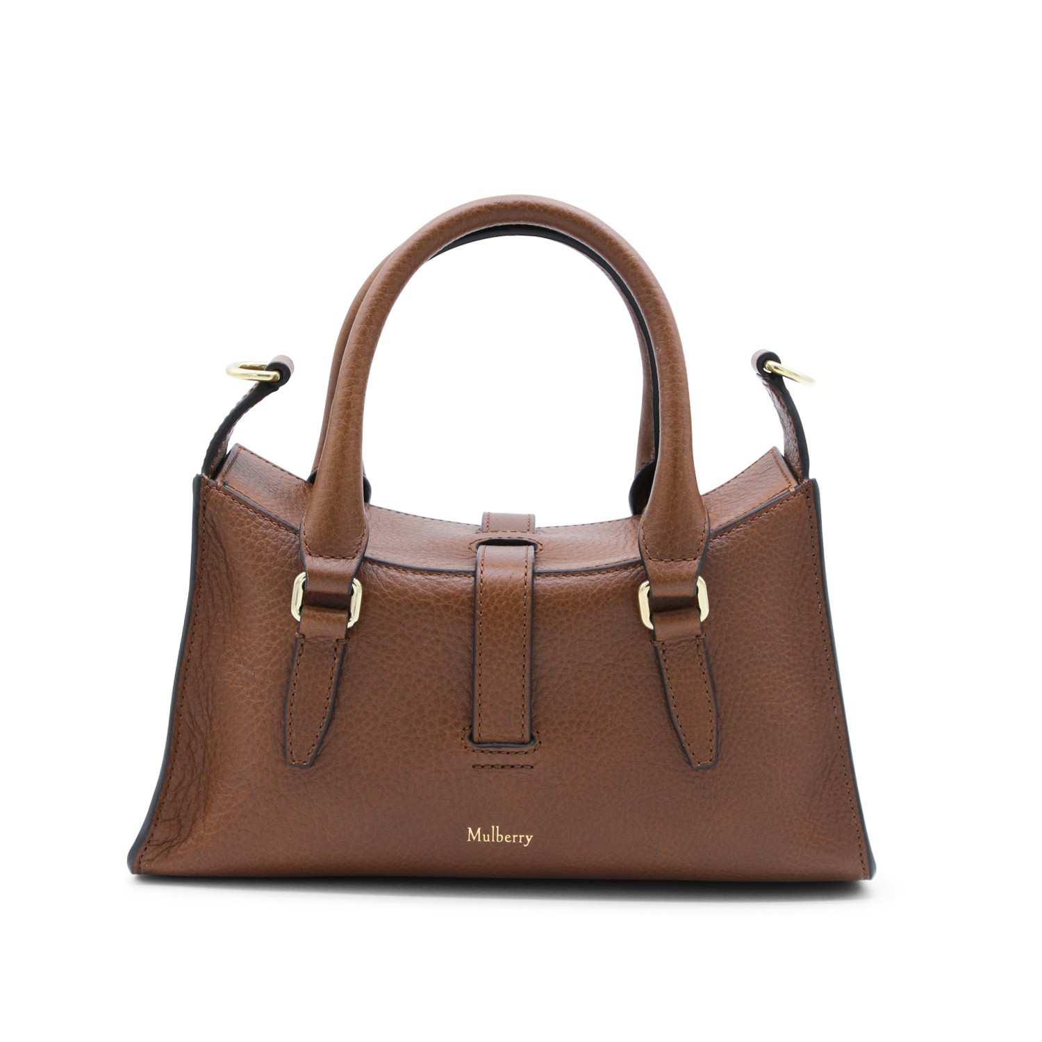 Brown leather mini Roxanne Heritage top handle bag from Mulberry featuring top handles, frontal buckle fastening, gold tone hardeware and pockets.