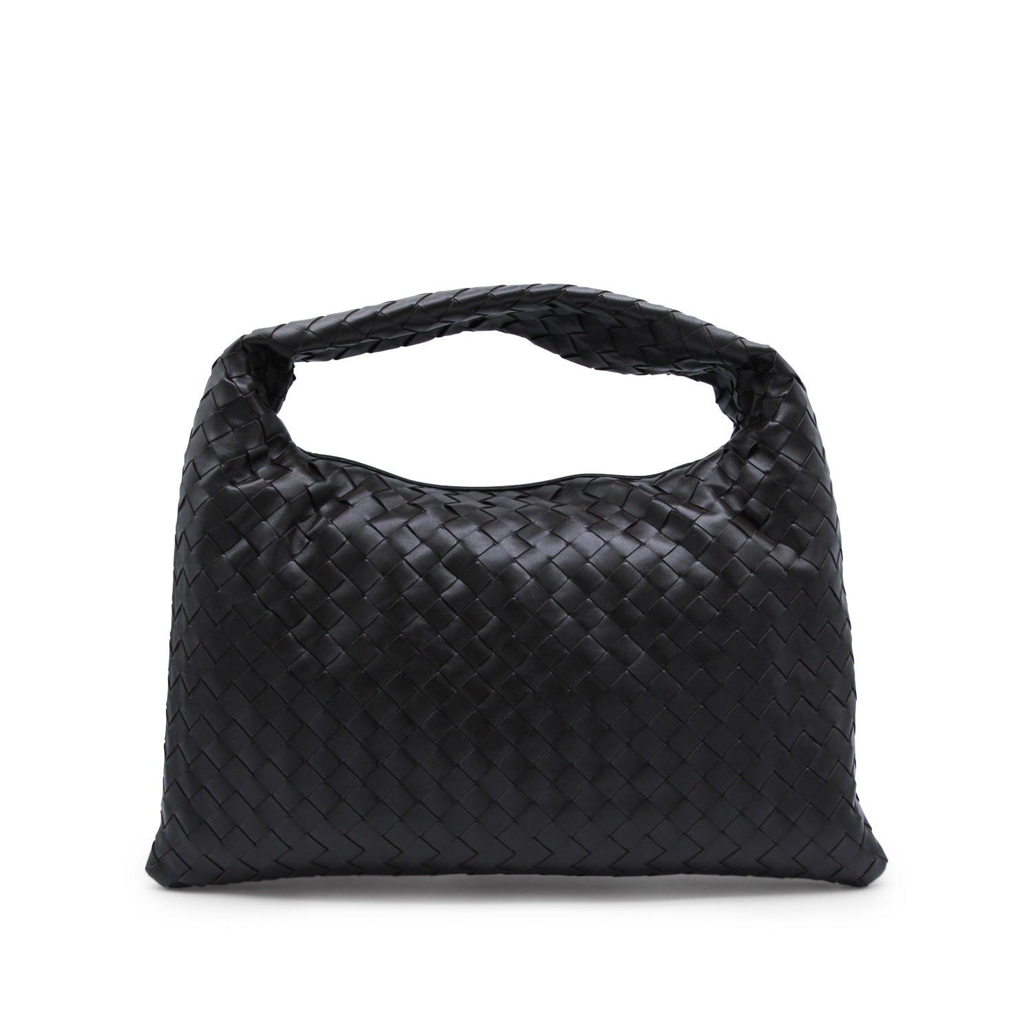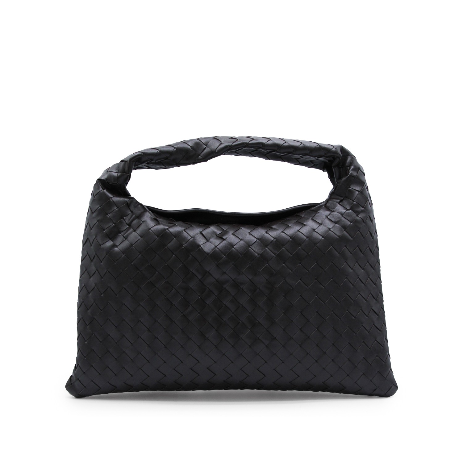 Dark brown leather Hop bag from Bottega Veneta featuring all over Intreccio motif, single top handle, magnetic closure, main compartment and internal zip pocket.