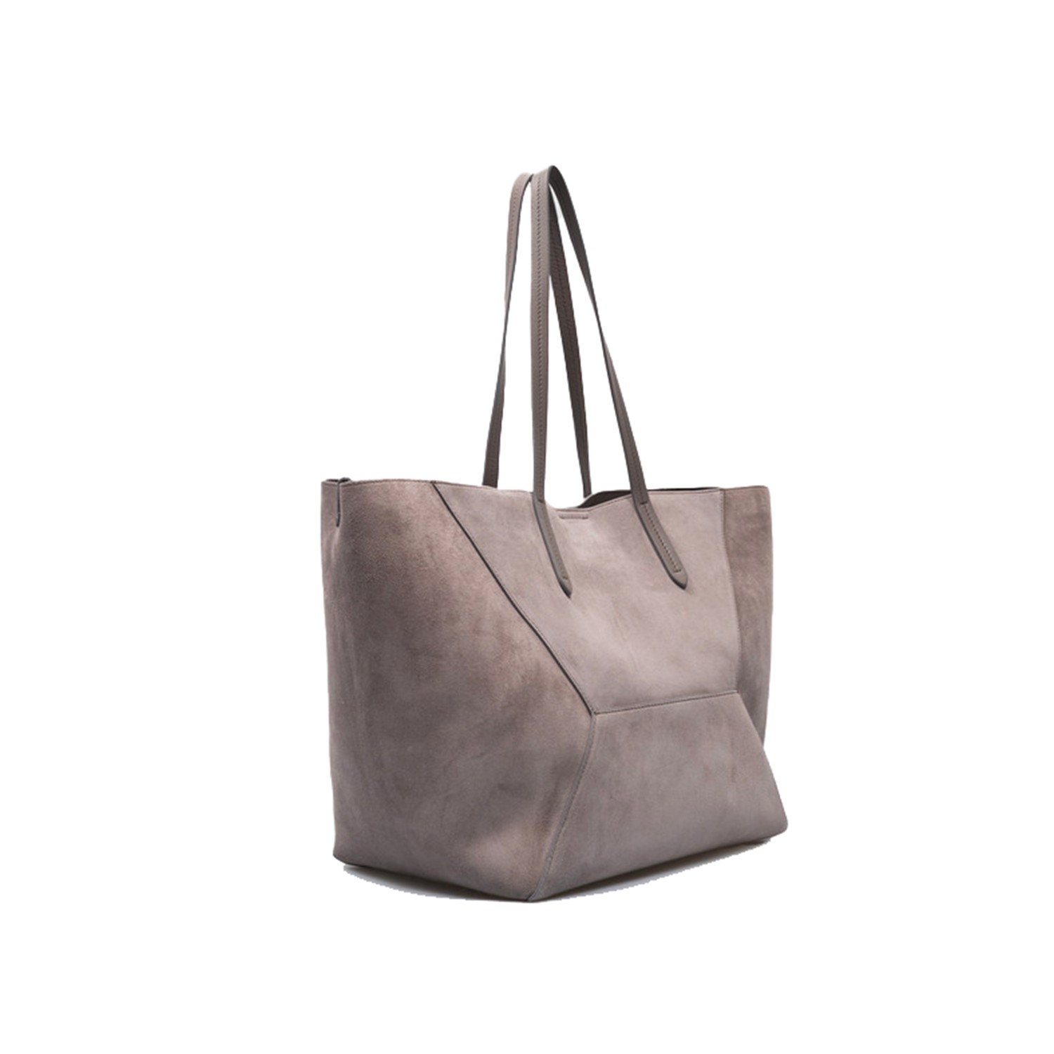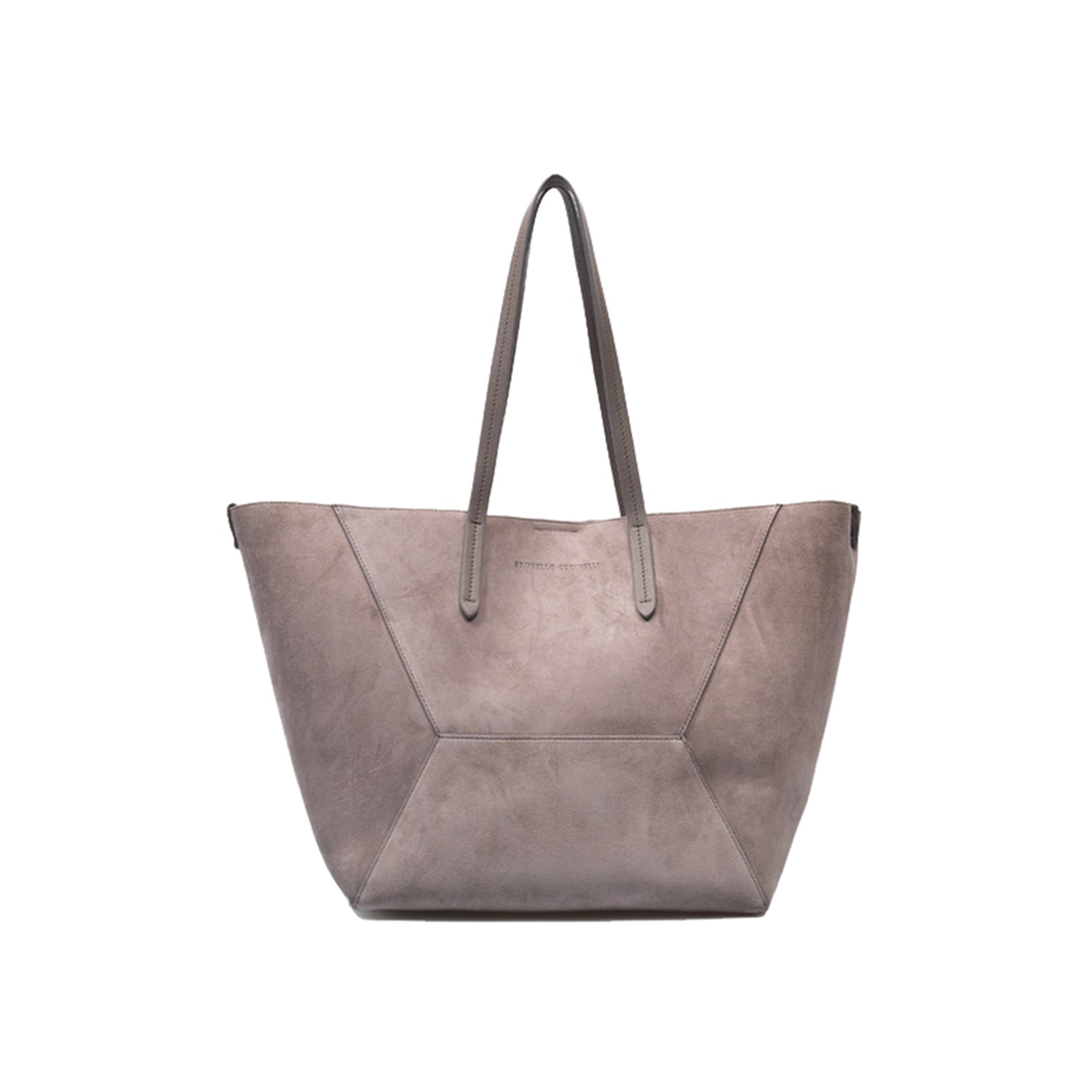 Beige leather top handle bag from Brunello Cucinelli featuring top handles, magnetic closure, main compartment, engraved logo and stitching details.