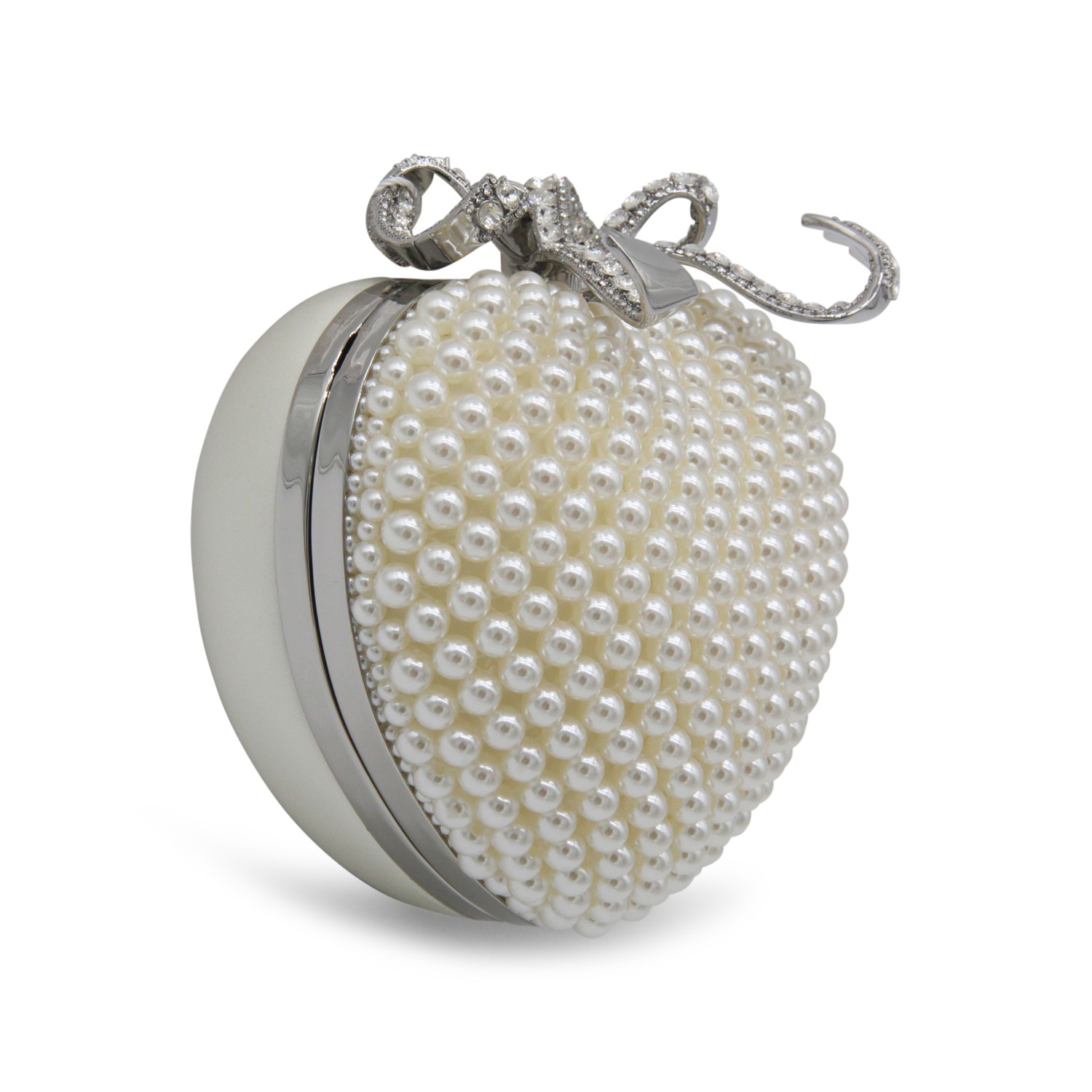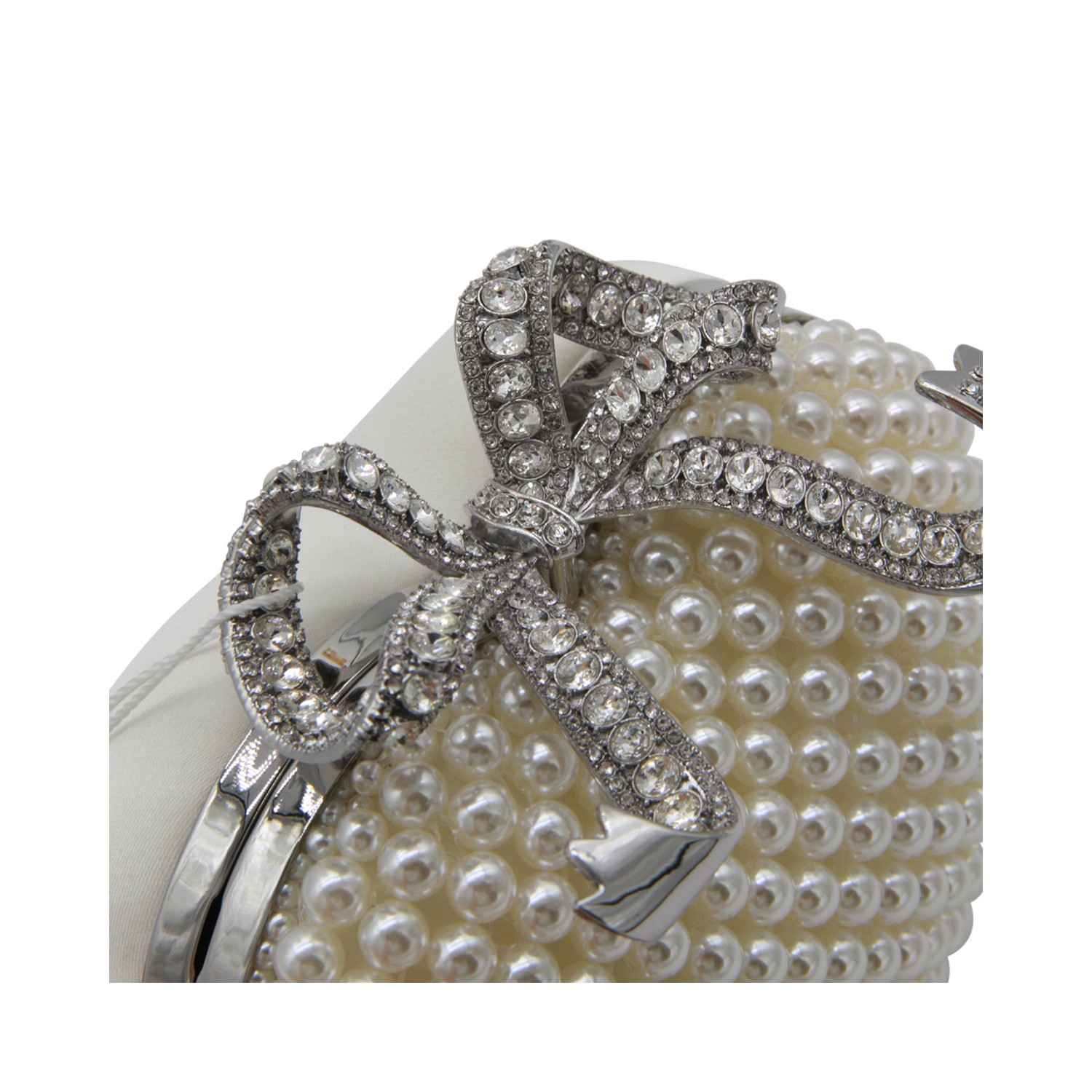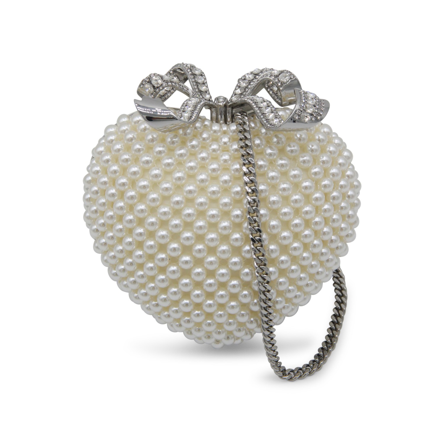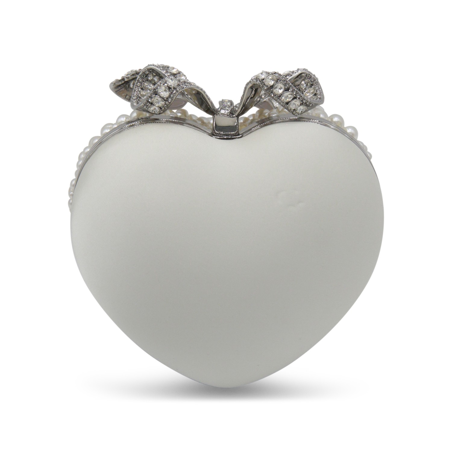 White bag from Self-Portrait featuring upper fastening with bow detail, crystal embellishment, heart shape and chain.