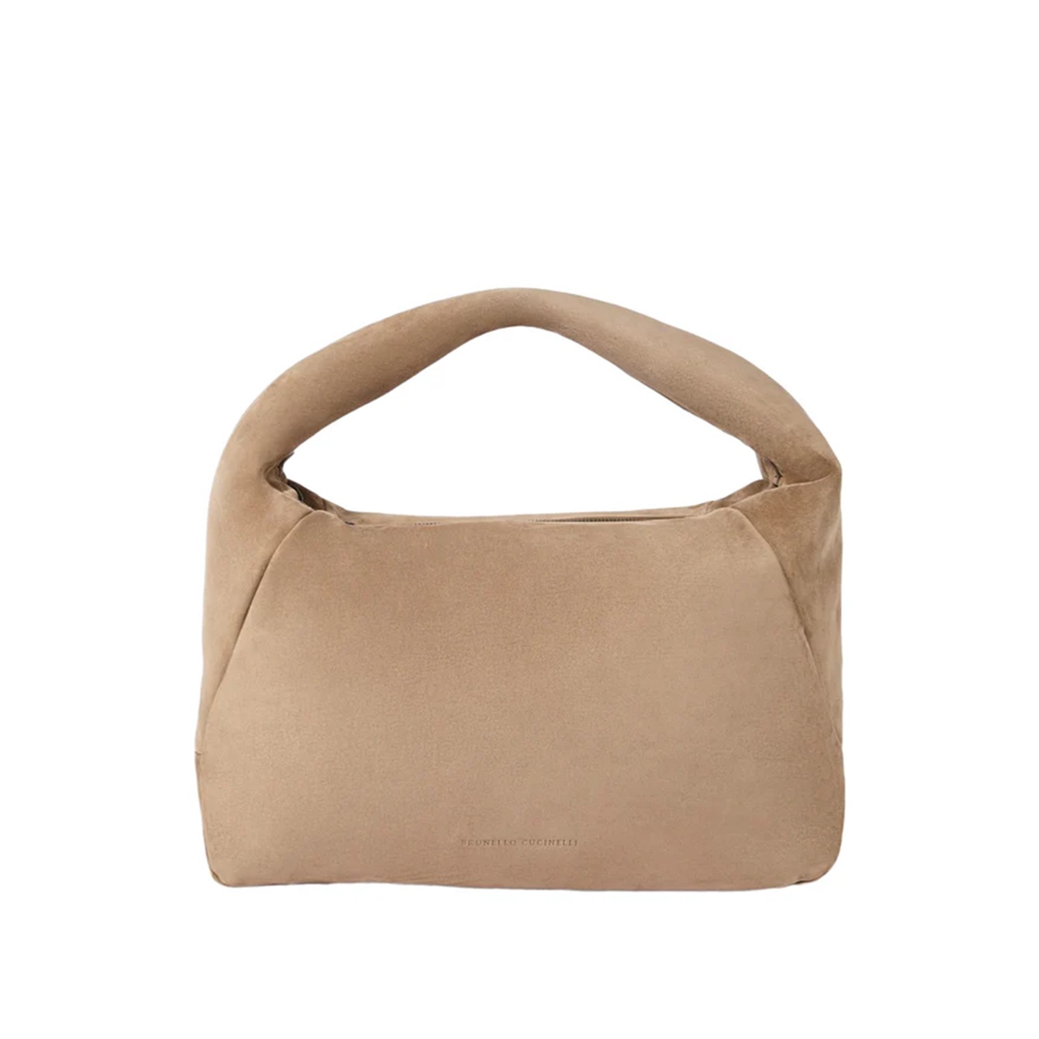 Beige leather top handle bag from Brunello Cucinelli featuring top handle, top zipper closure, engraved logo, internal zip pocket and main compartment.
